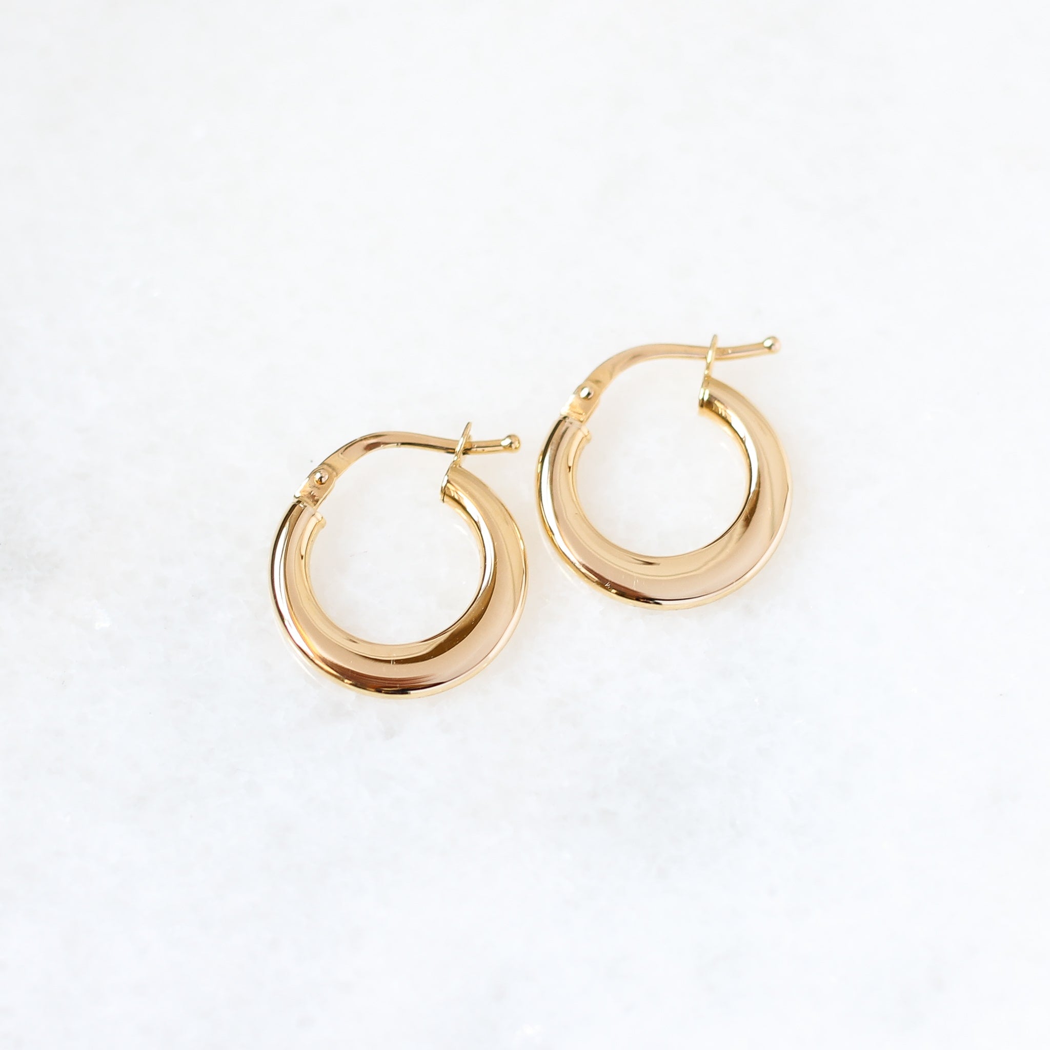 Solid yellow gold hoops with tapered shape and flat profile. Made in 14k yellow gold with hinged hook closure. Hollow and light weight.