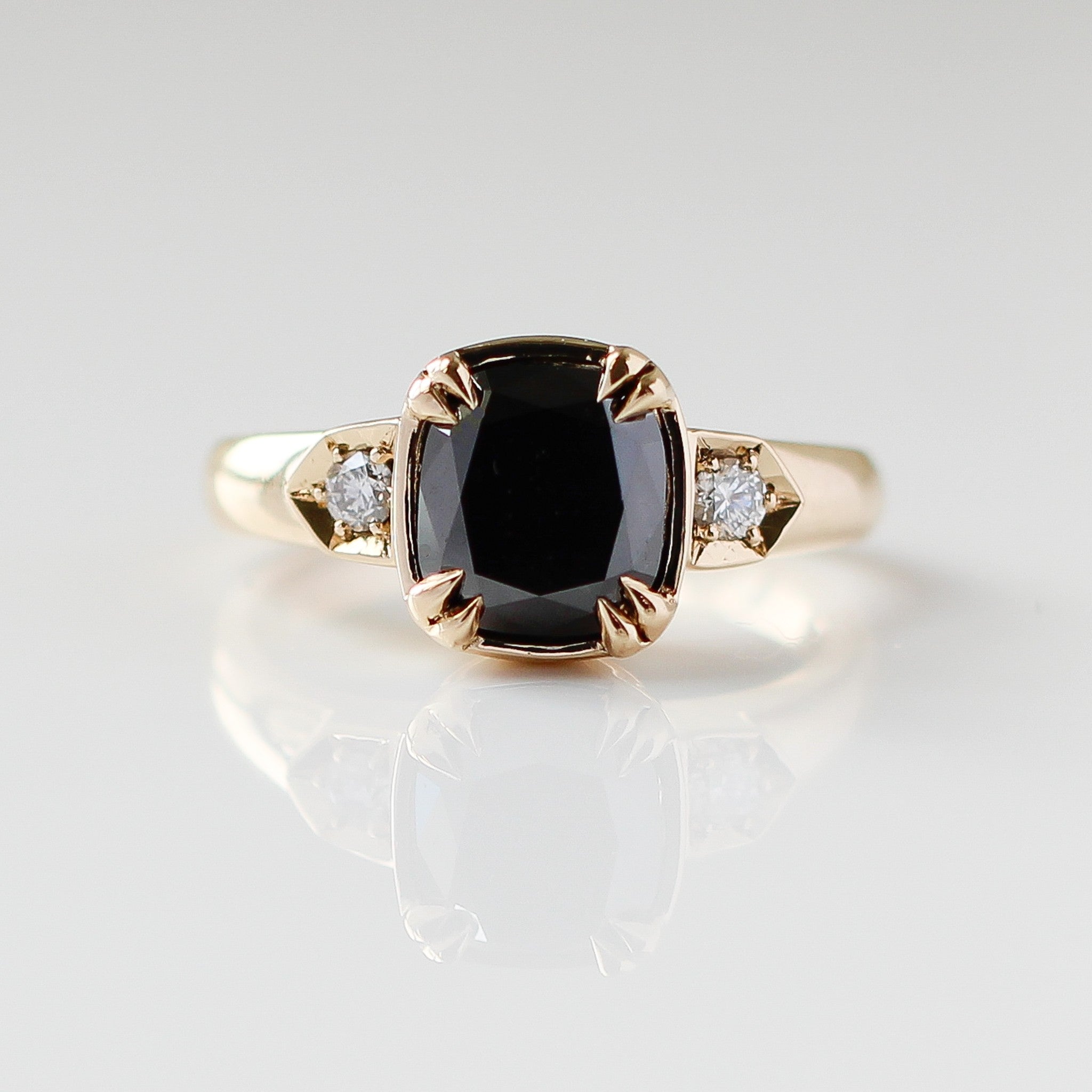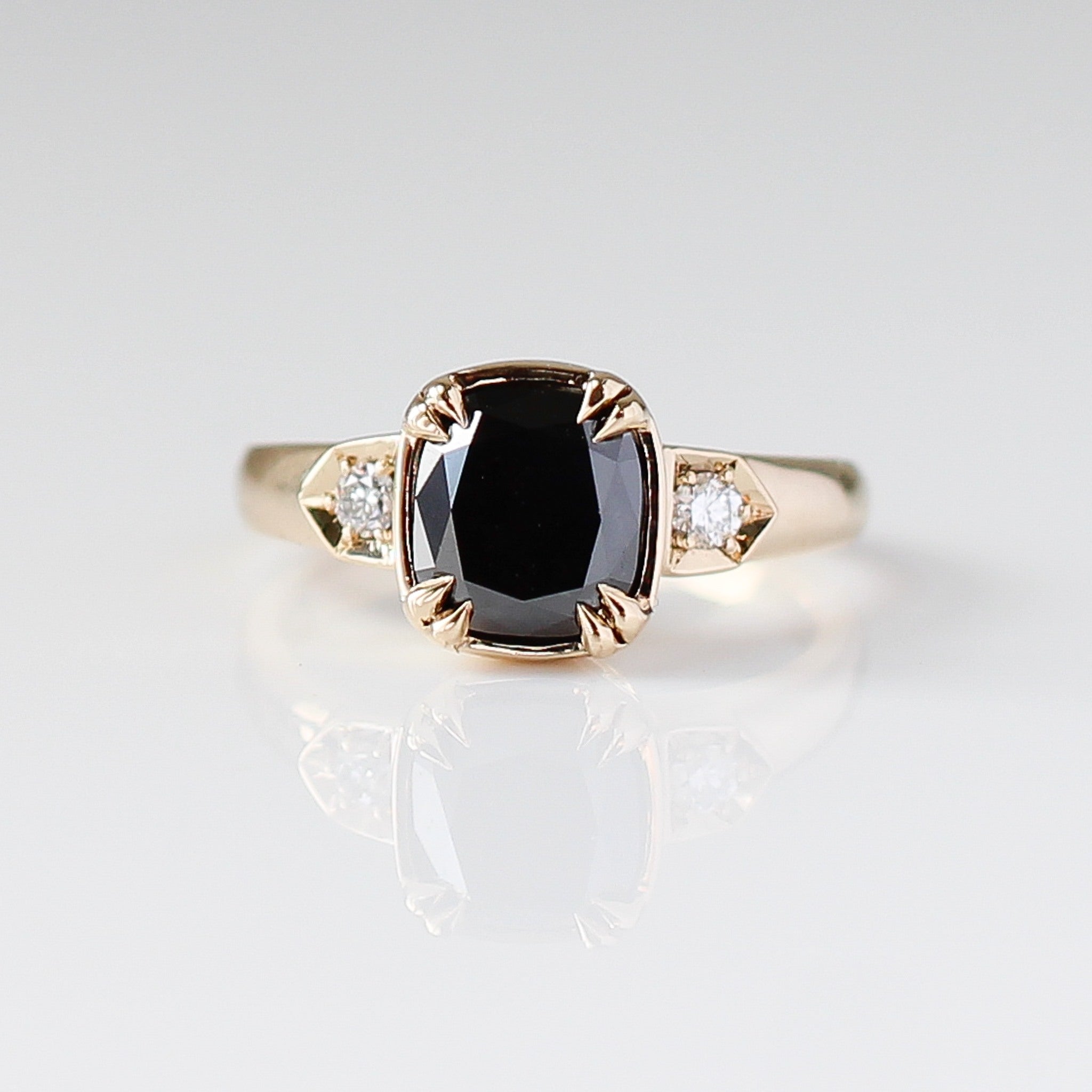 Nebula black diamond ring is a modern dark beauty for those who are looking for a statement. A moody deep black diamond centre stone set in hand carved setting with double tiger claw prongs, accented by round brilliant Canadian diamonds. Stacks best with contour bands.