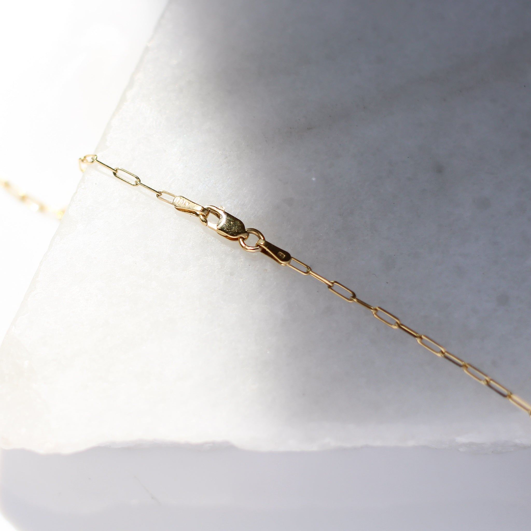 Paper clip style chain with 1.5mm wide and 4mm long links. Made in solid 10k yellow gold with lobster claw closure. Comes in 18” length.