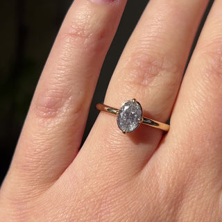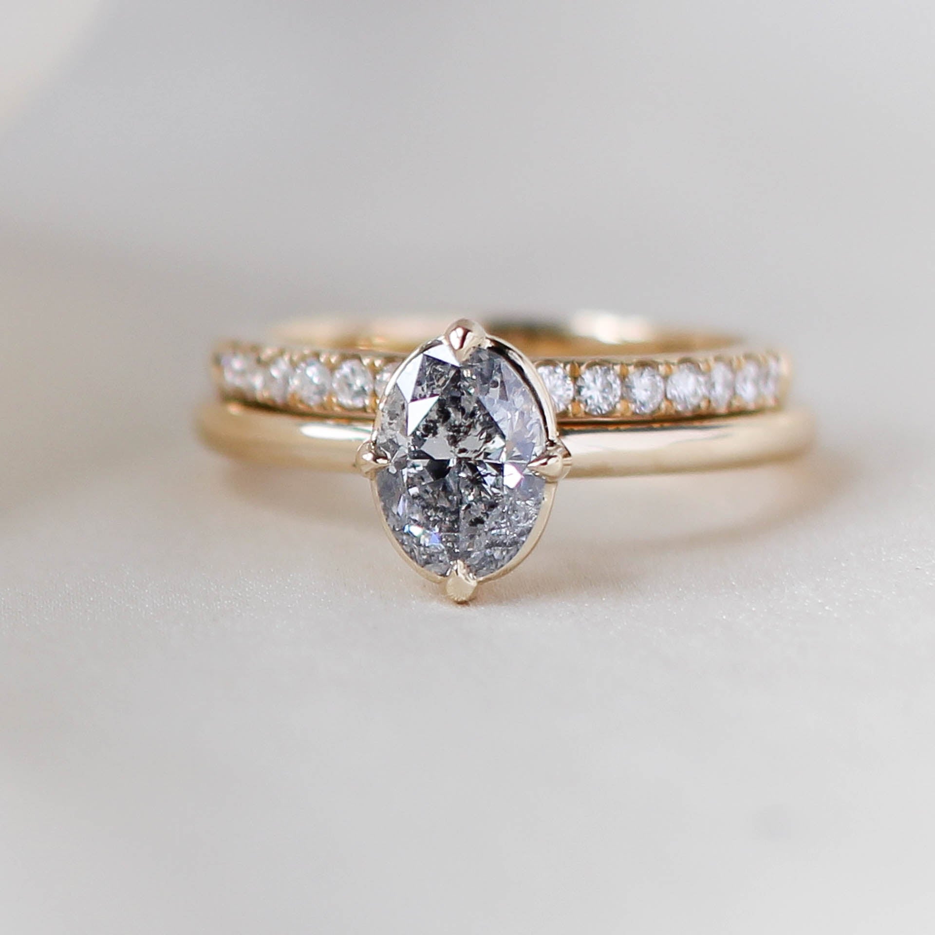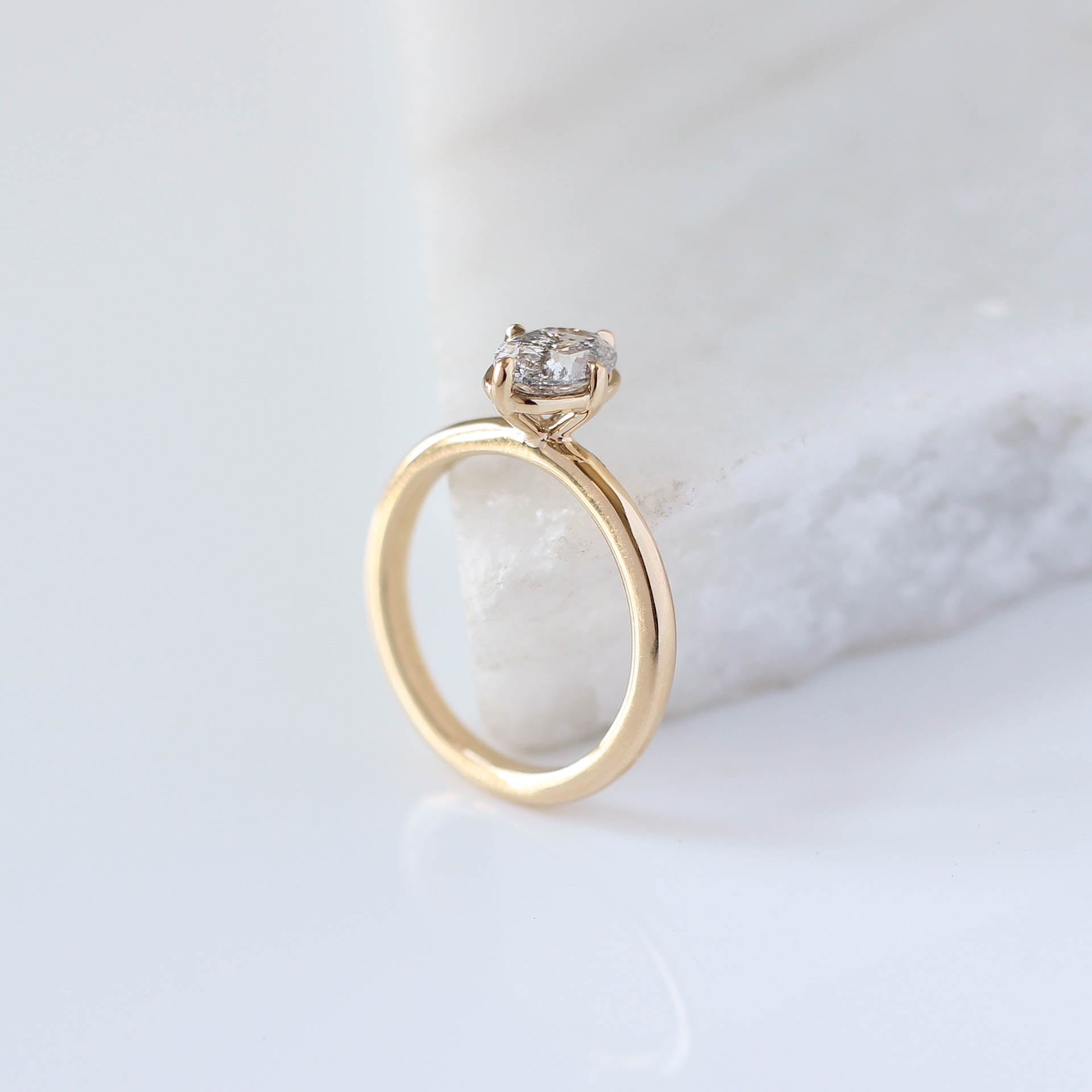 Our Around The World ring embodies the thrill of life's adventure and our deep passion for voyaging. An absolute classic engagement ring solitaire style with a one of a kind oval salt and pepper diamond that glows. Set in our signature compass 4-prong setting. The diamond, carefully selected for its exquisite brilliance and unique nature, is truly unforgettable. The elegant smooth band is made with the raised setting to perfectly accommodate curved or flush bands for a flawless fit.