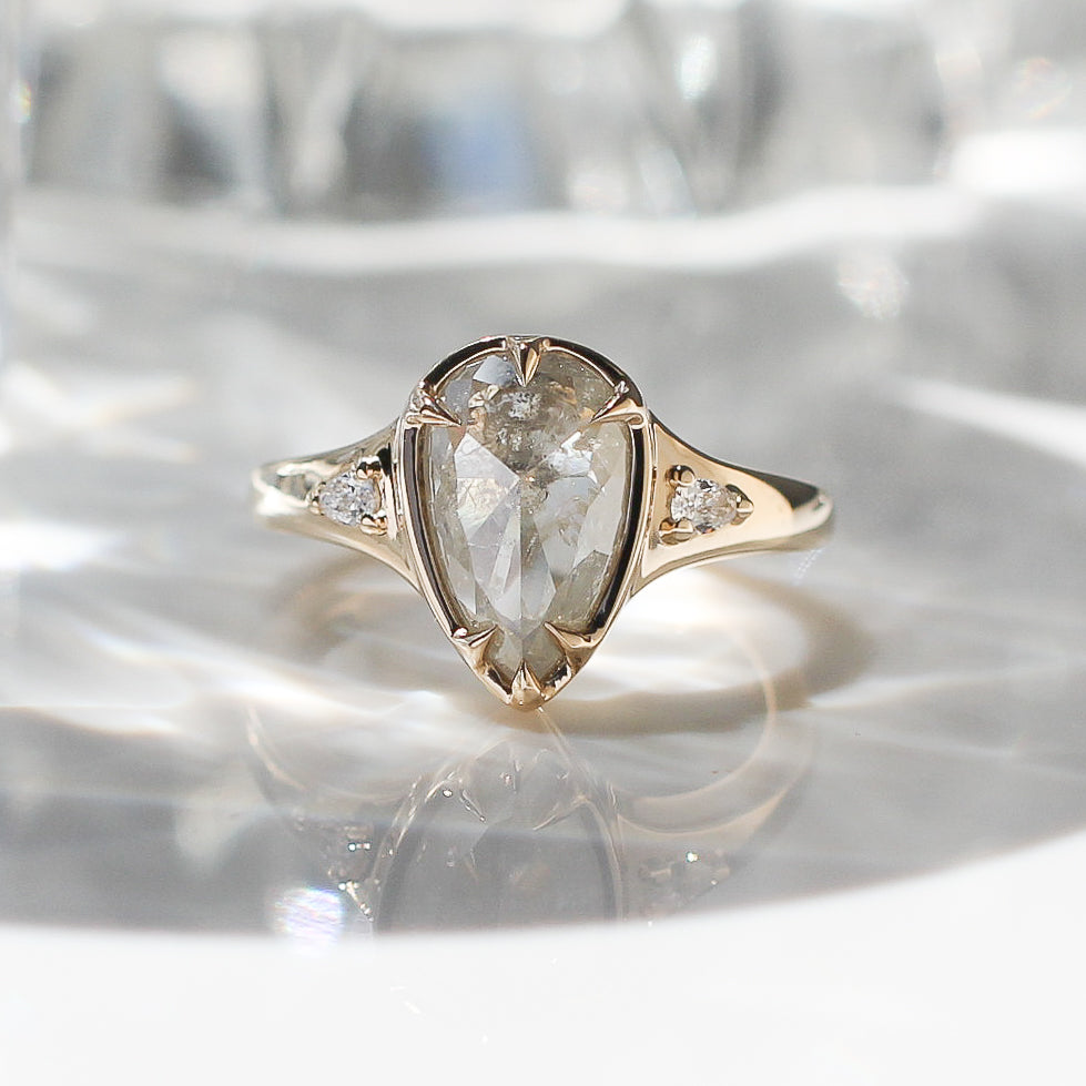 Fons Pear Diamond Tapered Ring is the perfect symbol of awakening blooms and new beginnings. Features an icy pear rose cut diamond in our hand-carved five prong setting with tapered shoulders and imbedded pear cut white diamond accents. Offers a beautiful spread on the finger with very comfortable fit and low profile. For a goddess in your life or for you to celebrate you!