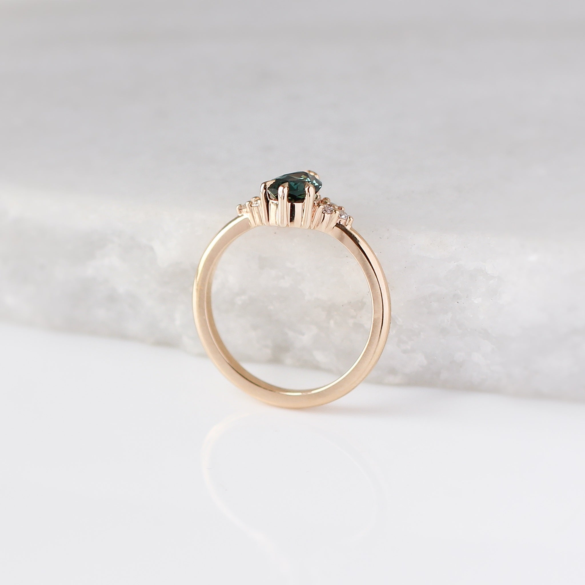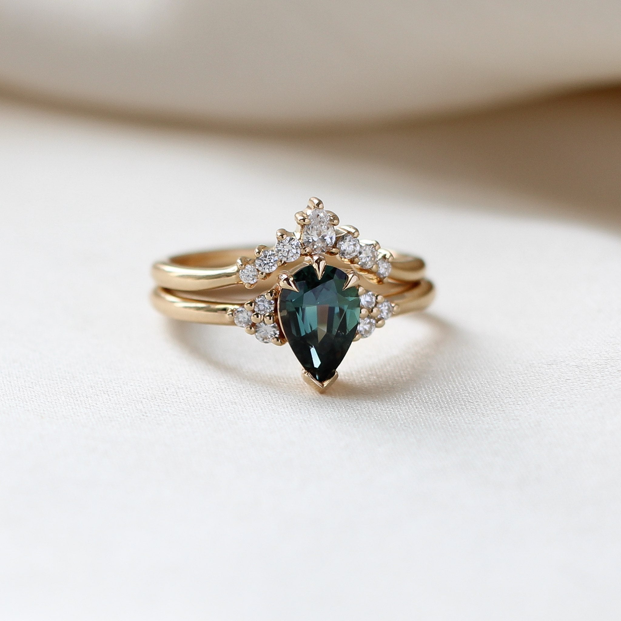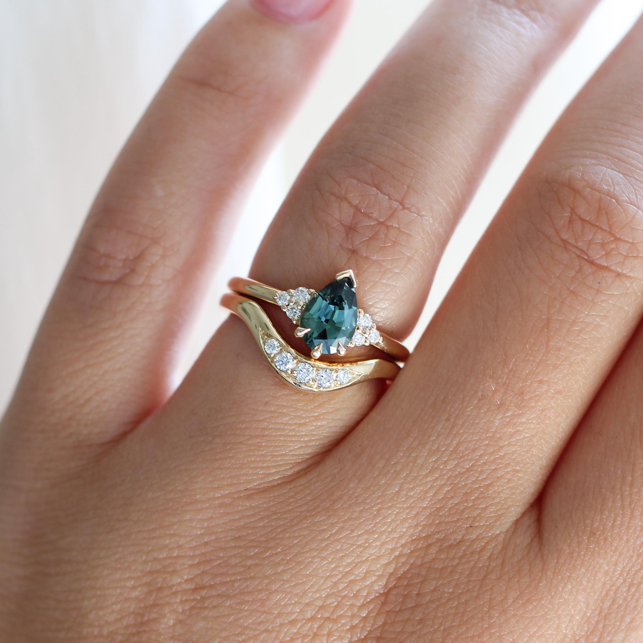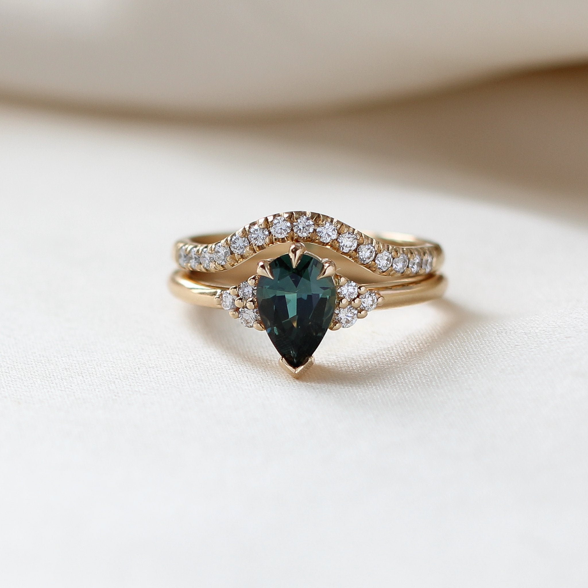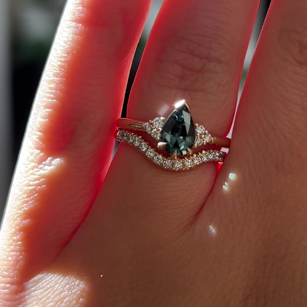 Our Glacier setting featuring a one-of-a-kind pear shaped teal-green sapphire. Hugged by clusters of Canadian diamonds. Impeccably cut, the sapphire comes alive in every light, casting vibrant flashes of blue that dance with every movement. Set with a low profile which stacks best with pointed contour bands like our Serina, Diamond Point, Kite Point