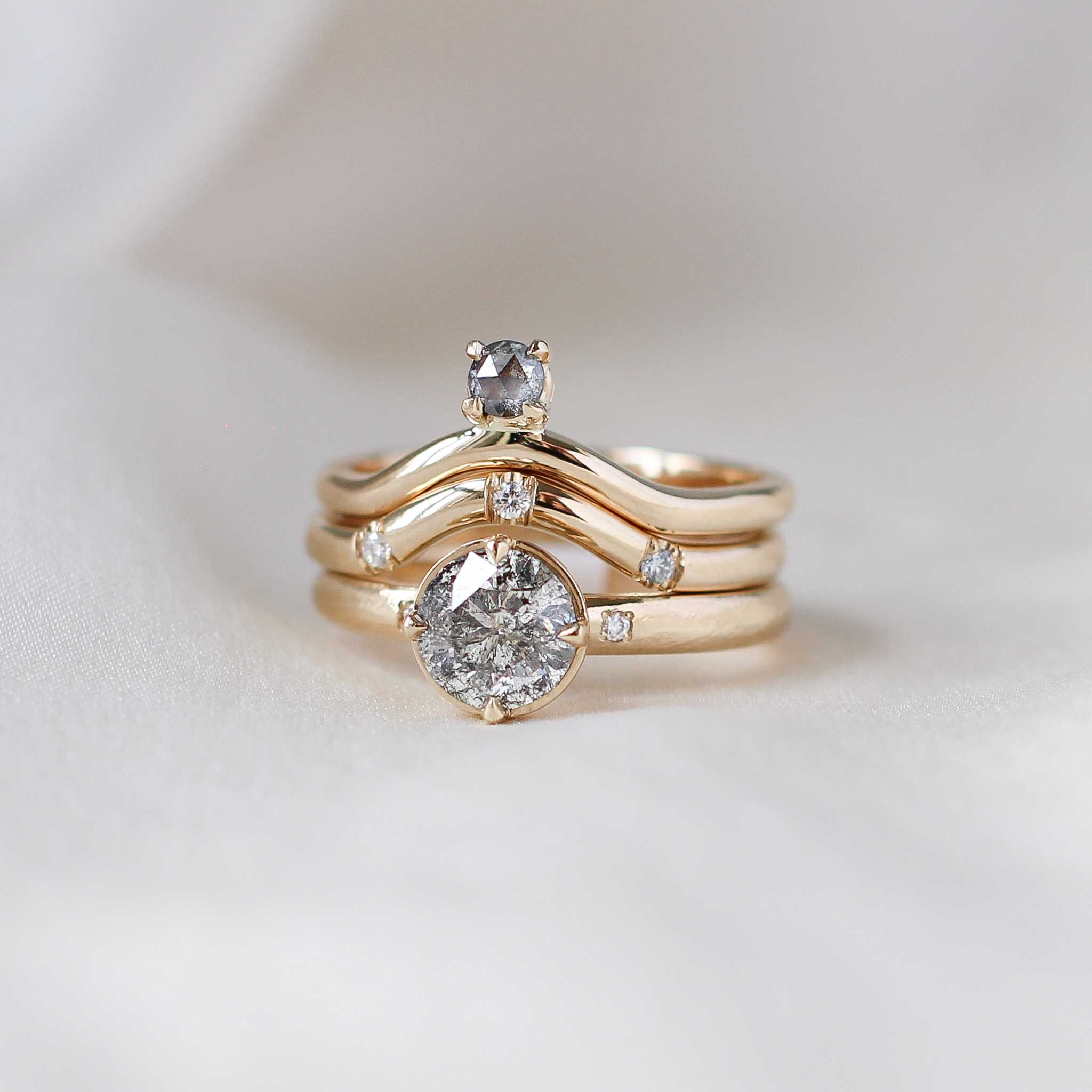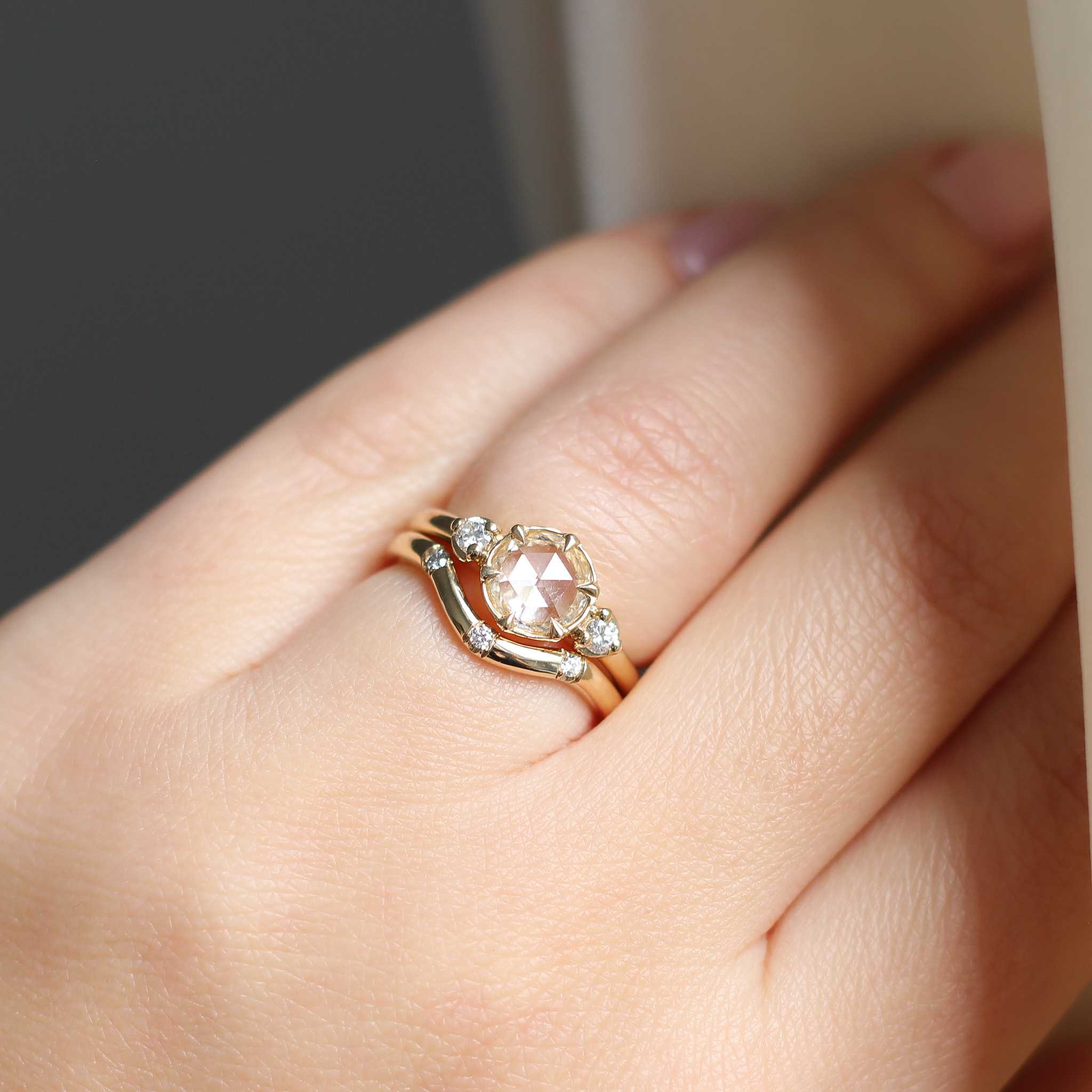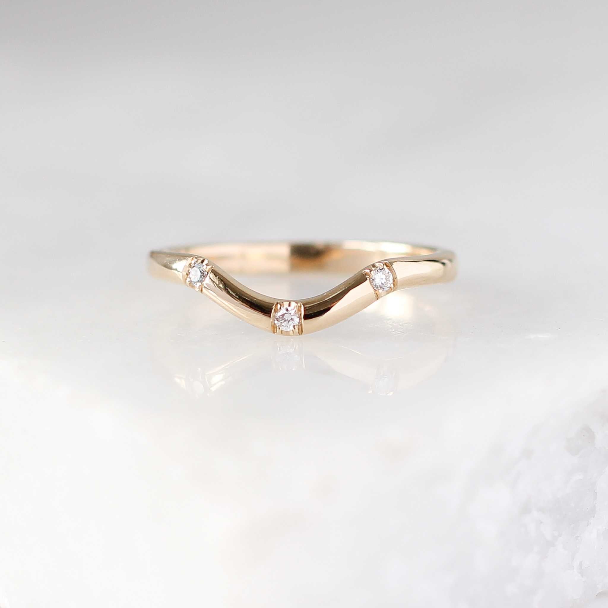 Our wave curved contour band set with three brilliant cut diamonds. This band will stack great with round, oval or pear shaped engagement rings. Pictured with White Luna, Around The World, Icy Lagoon and Teal Sapphire Solitaire rings, sold separately.
