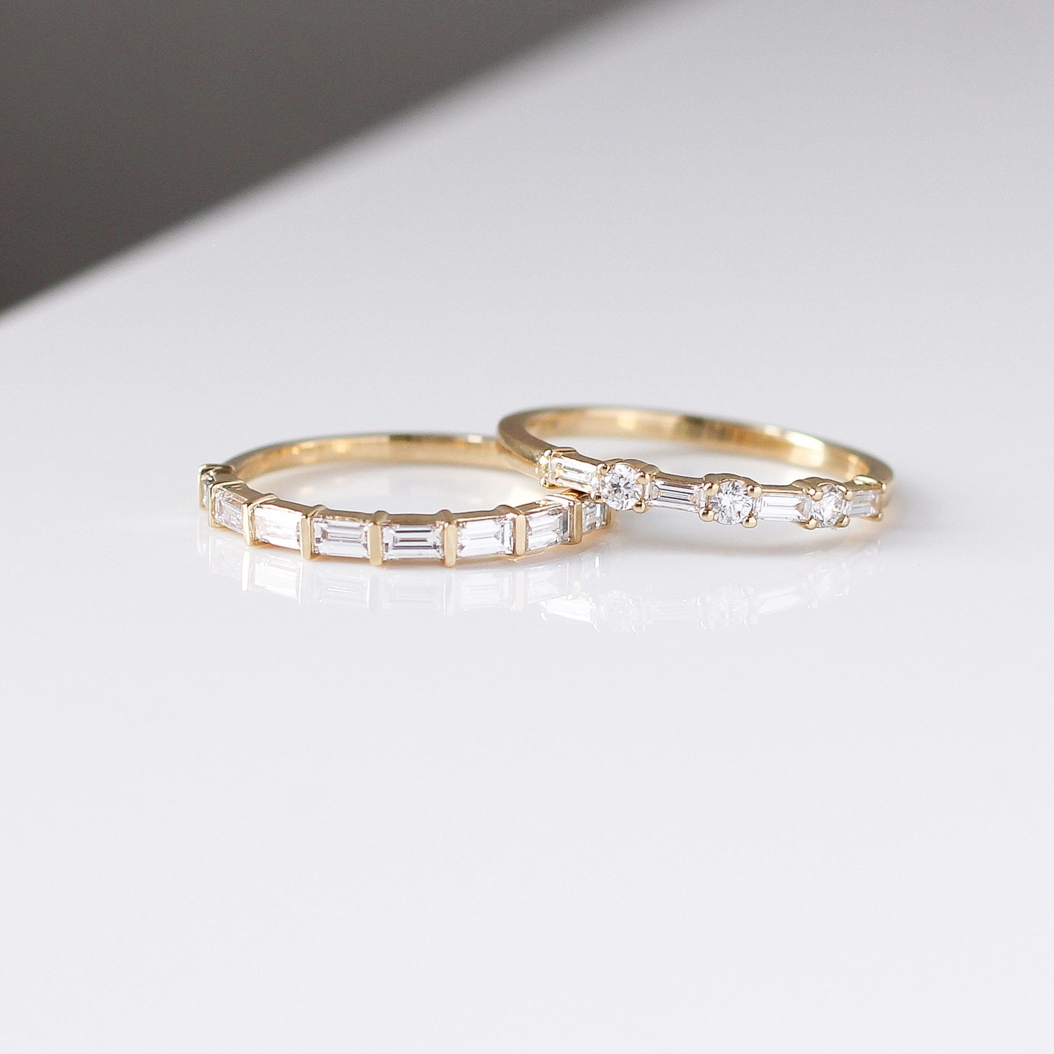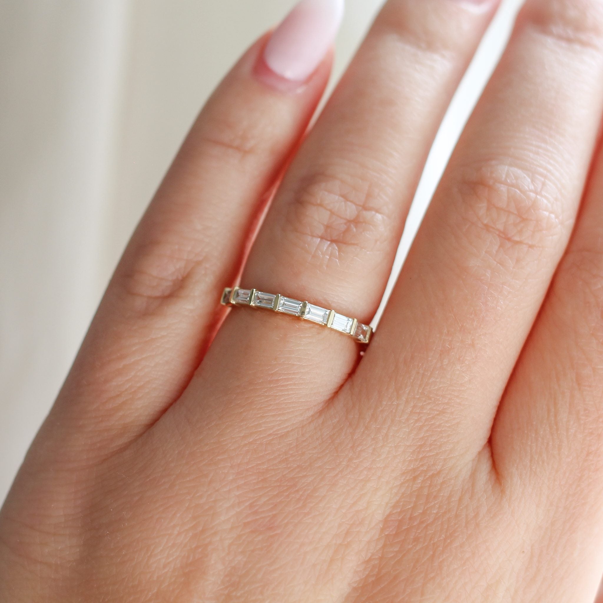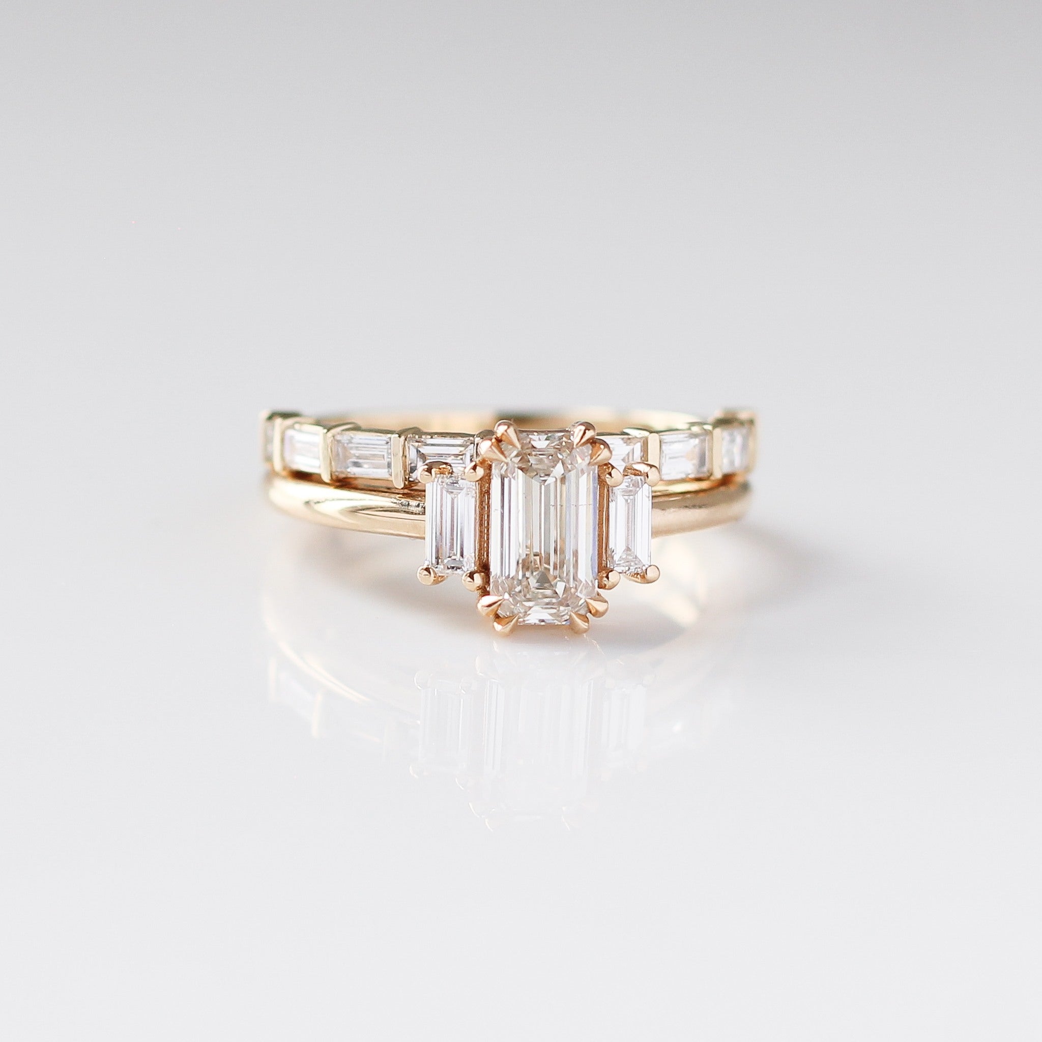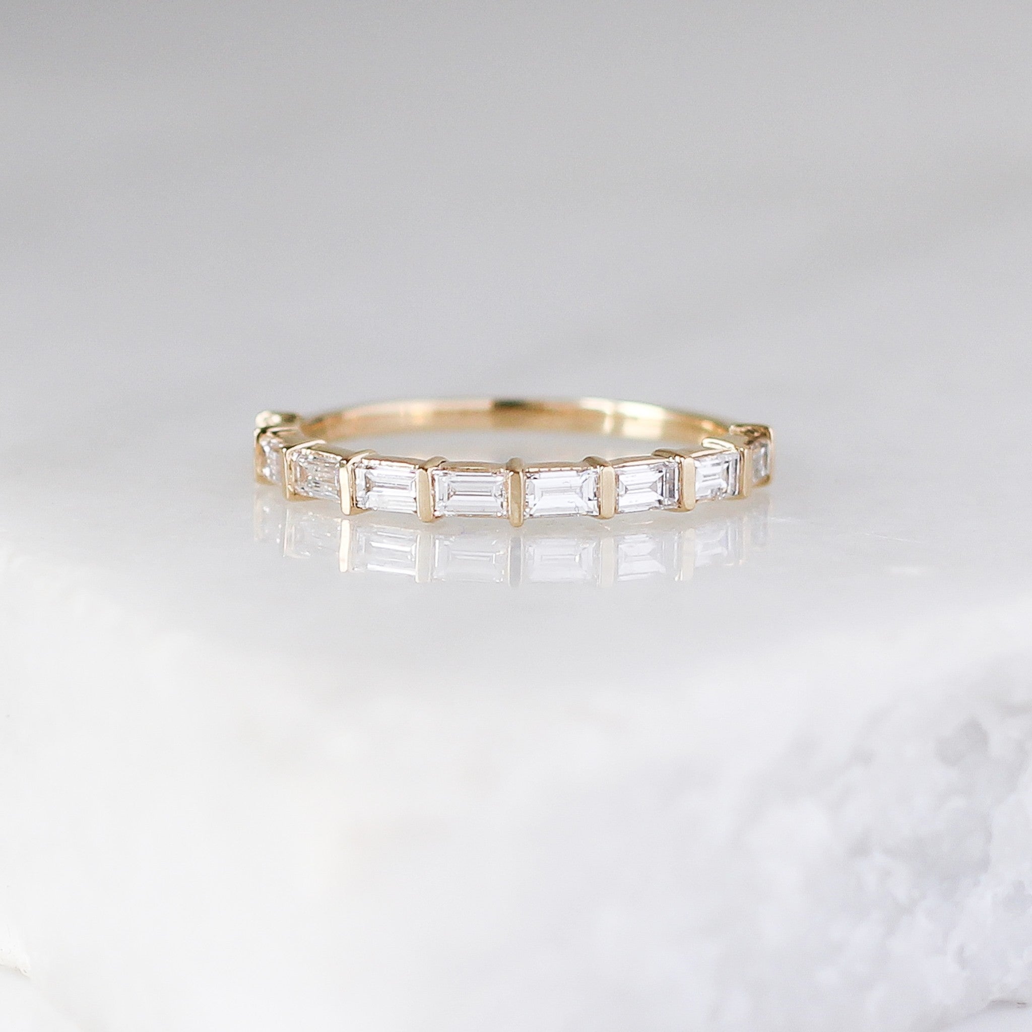 Claire diamond band is a deco style straight band set with lab created or natural white baguette cut diamonds. It is a modern and timeless classic. Pairs well with a raised profile engagement ring for a seamless flush fit or stack it with other bands in your collection. Pictured with our Lagoon, Champagne Trilogy, Green oval and Blue emerald Trilogy, Around The World and Asscher Solitaire rings, sold separately.
