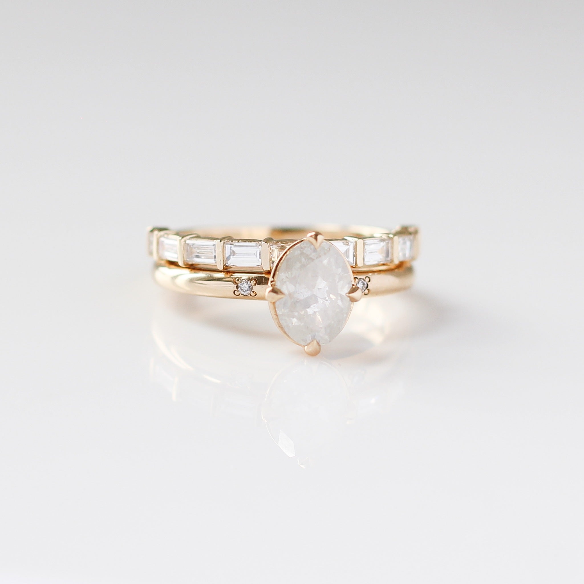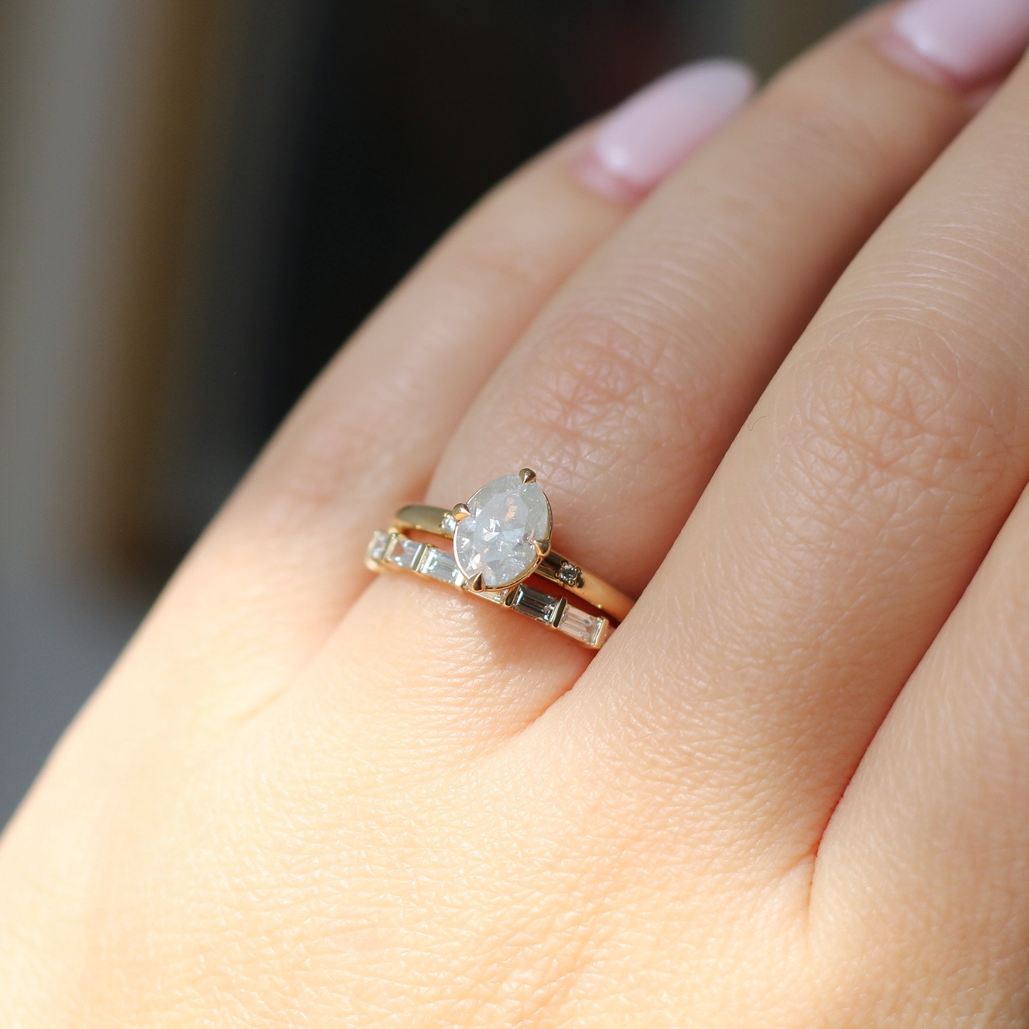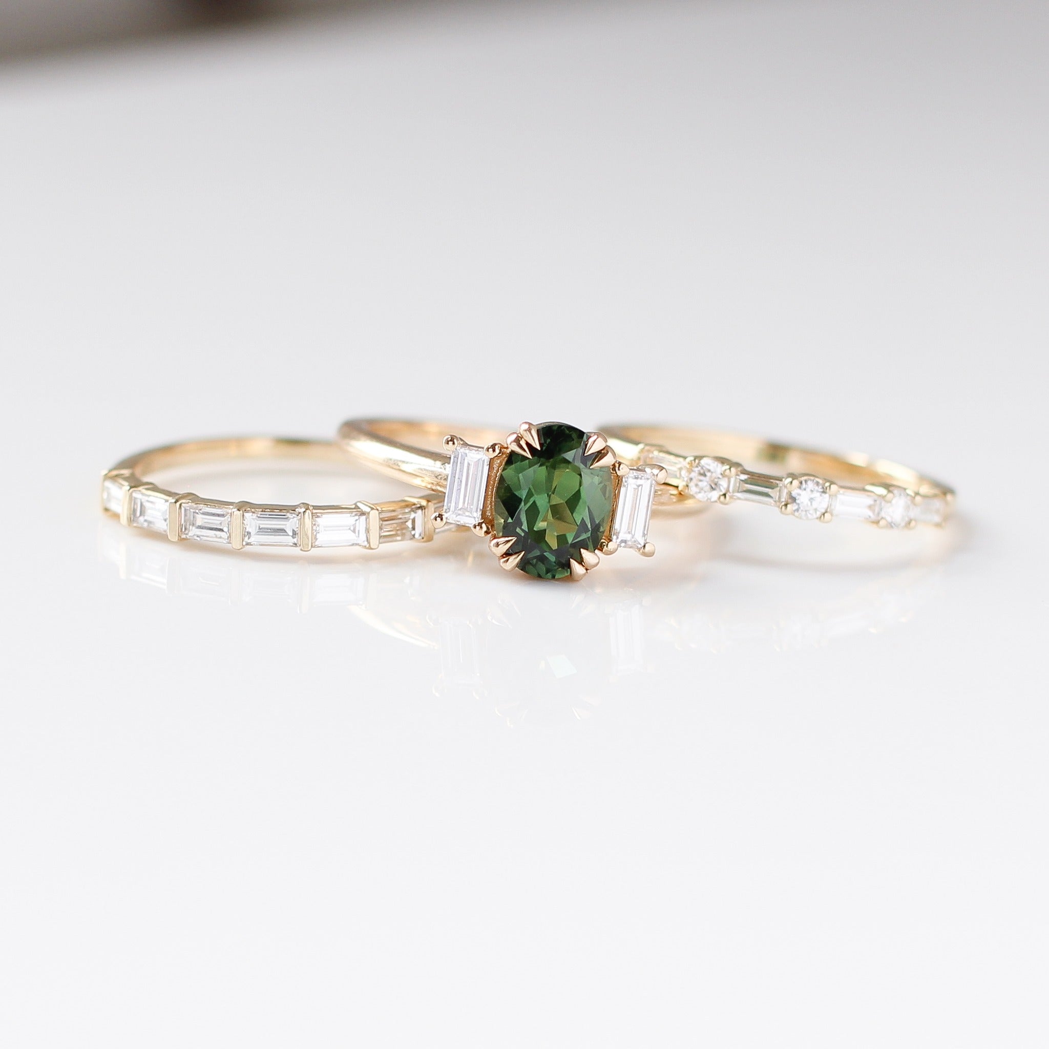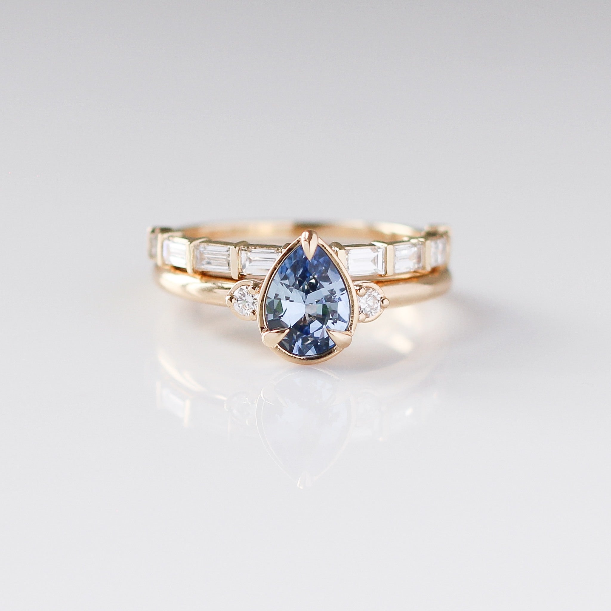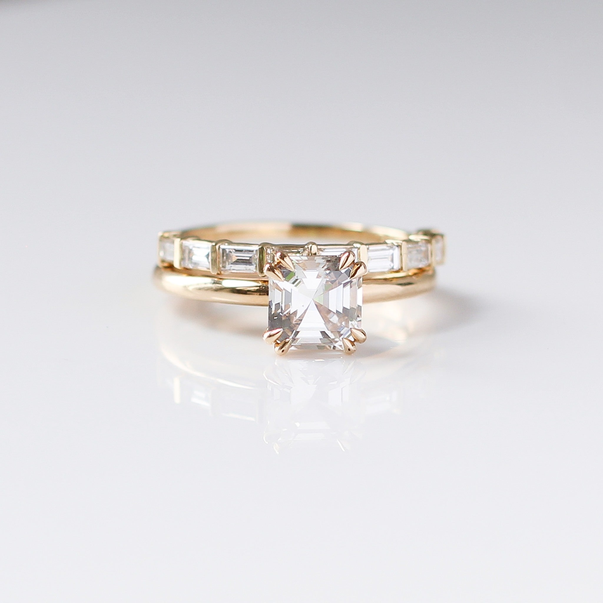 Claire diamond band is a deco style straight band set with lab created or natural white baguette cut diamonds. It is a modern and timeless classic. Pairs well with a raised profile engagement ring for a seamless flush fit or stack it with other bands in your collection. Pictured with our Lagoon, Champagne Trilogy, Green oval and Blue emerald Trilogy, Around The World and Asscher Solitaire rings, sold separately.