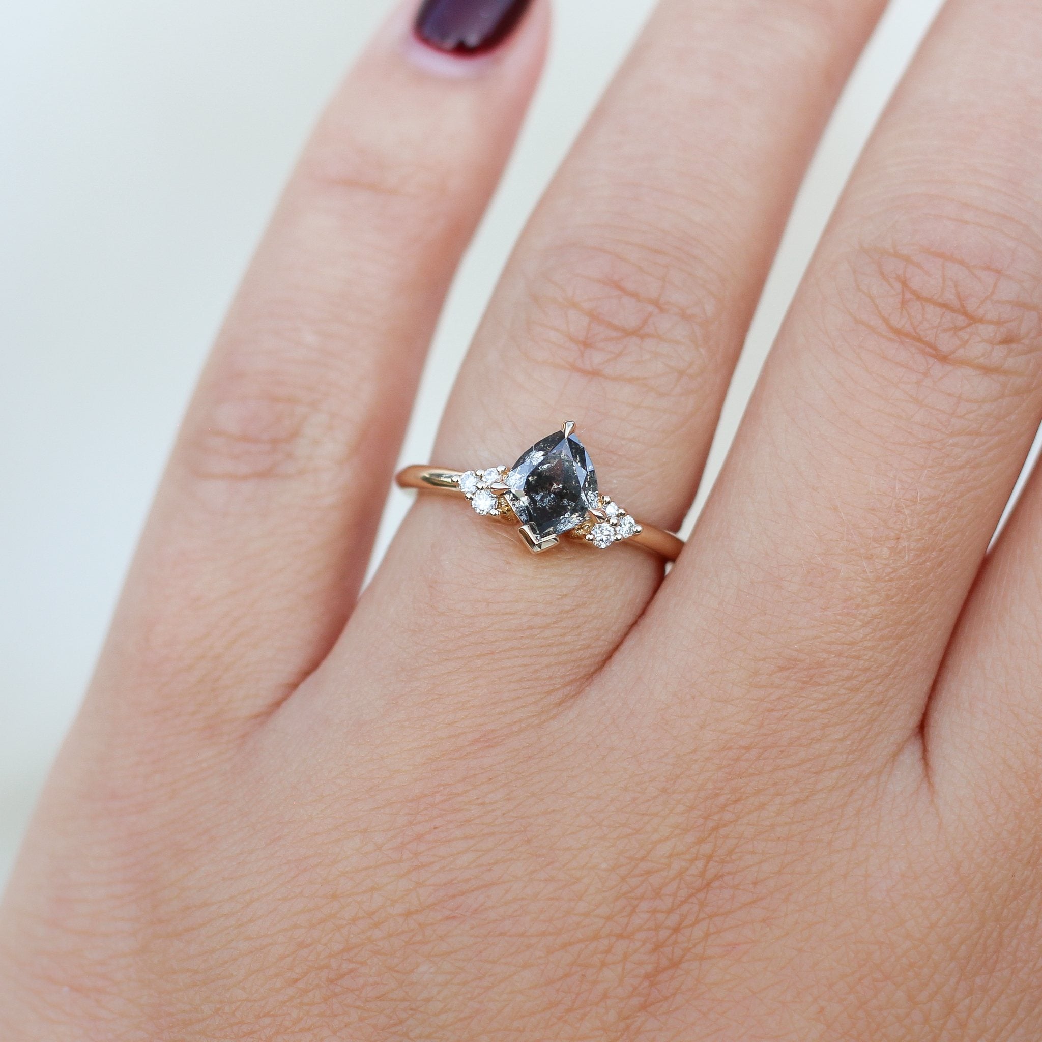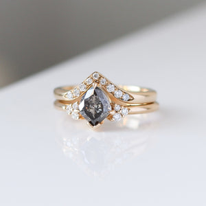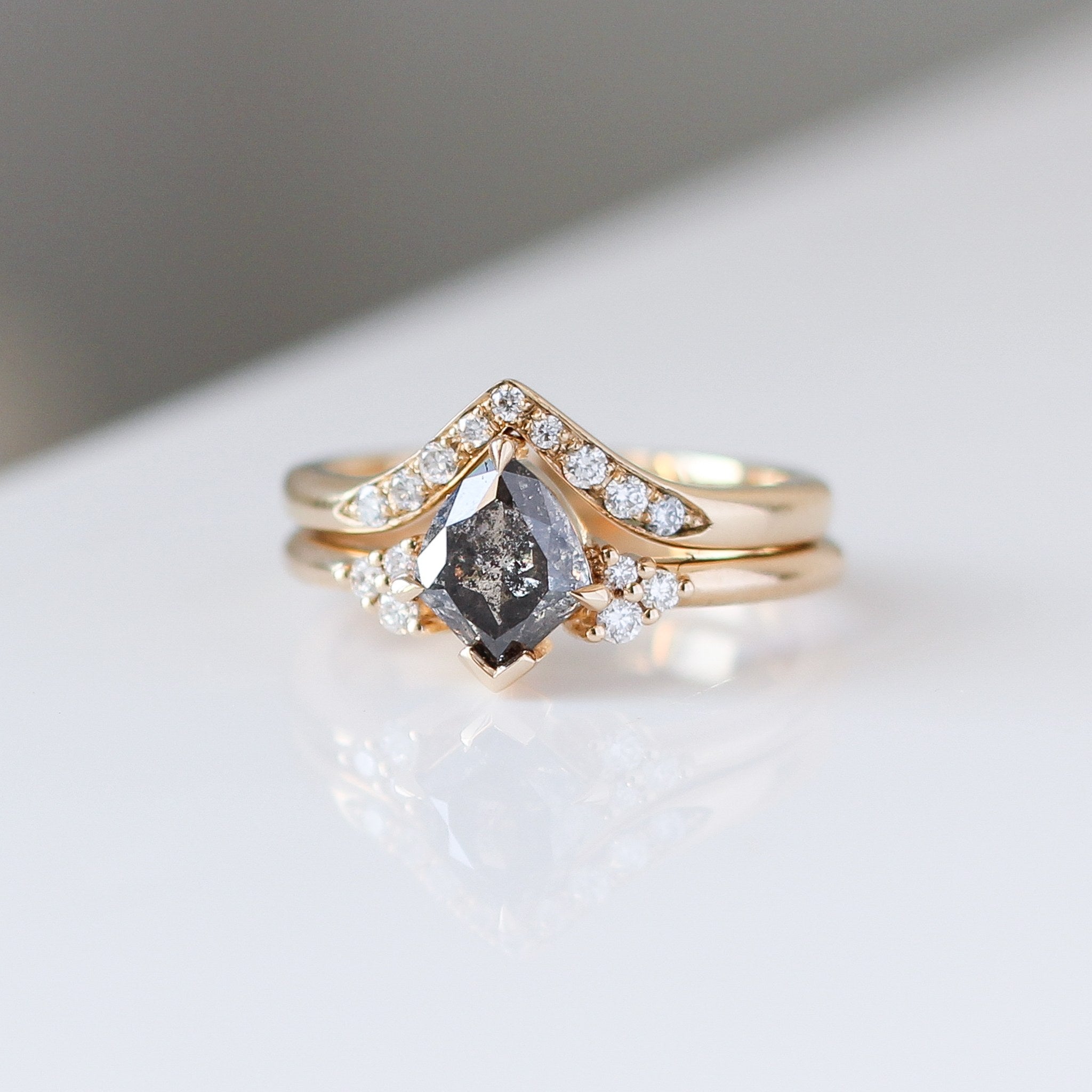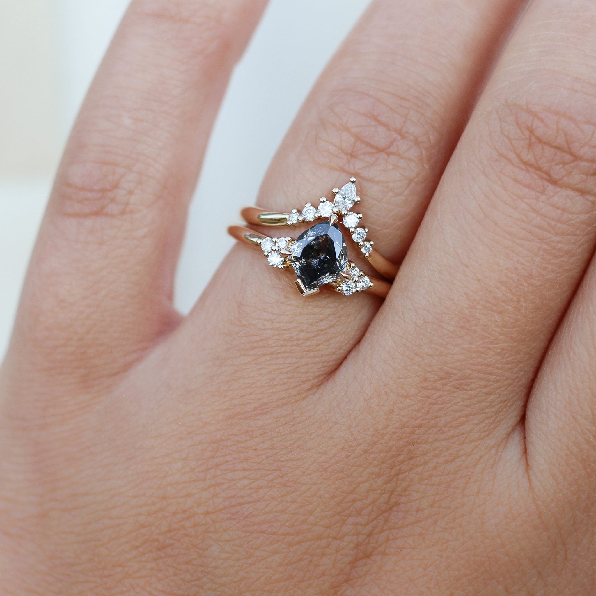 Faceted Diamond Band paired with salt and pepper diamond ring on hand with necklace and earrings being worn