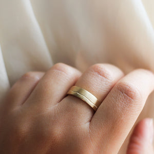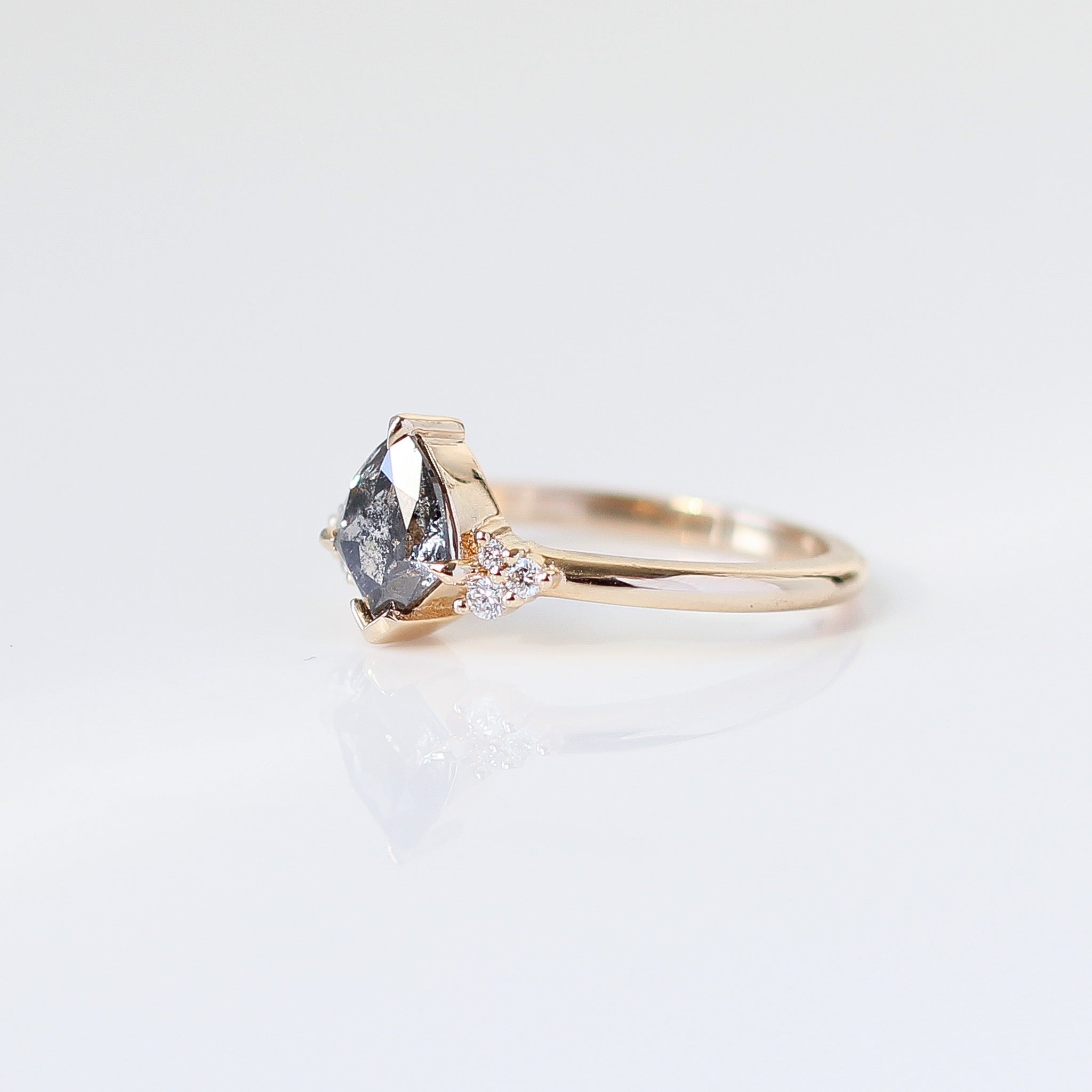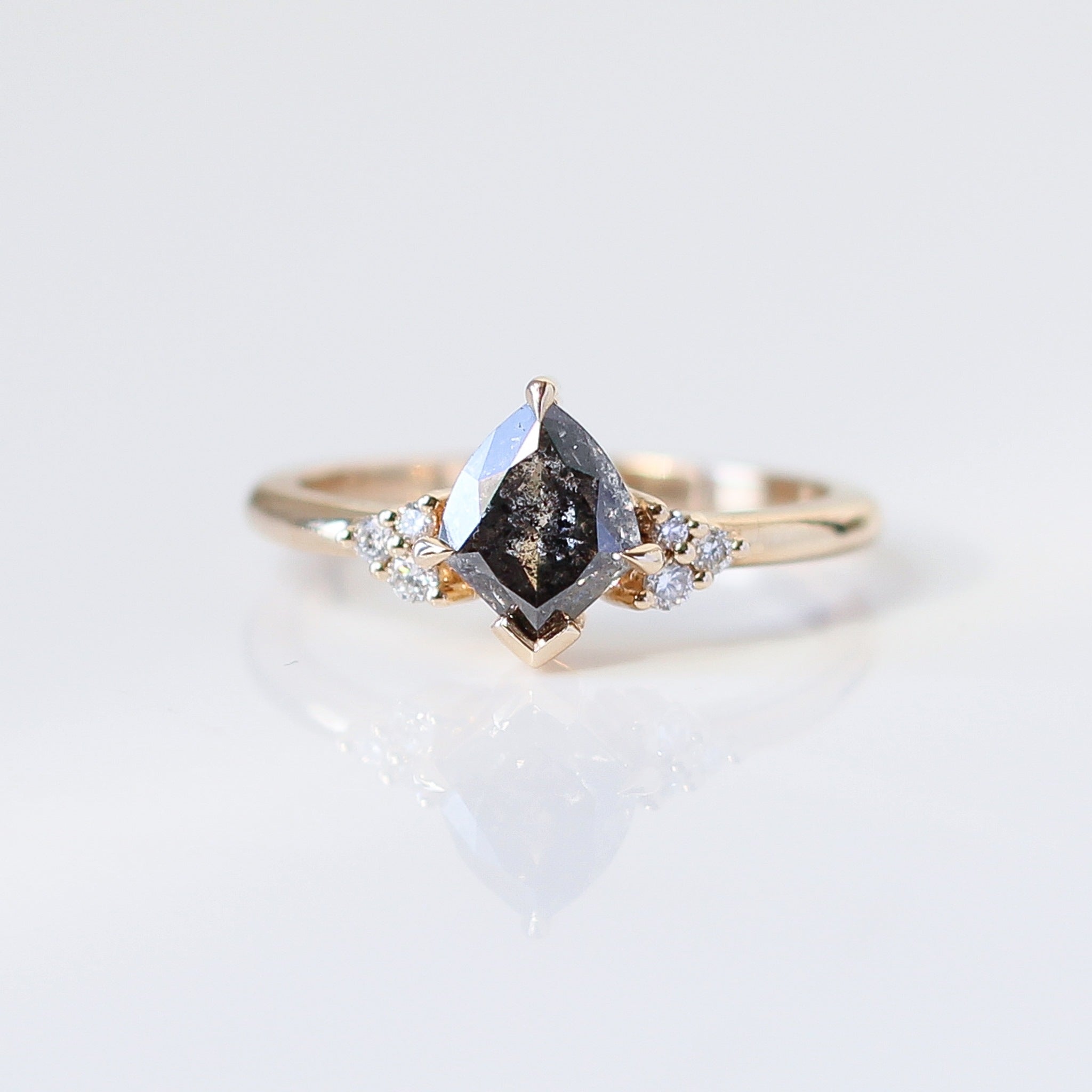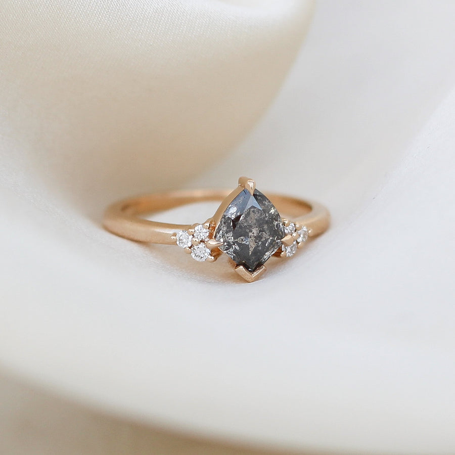 Faceted Diamond Band paired with salt and pepper diamond ring on hand with necklace and earrings being worn