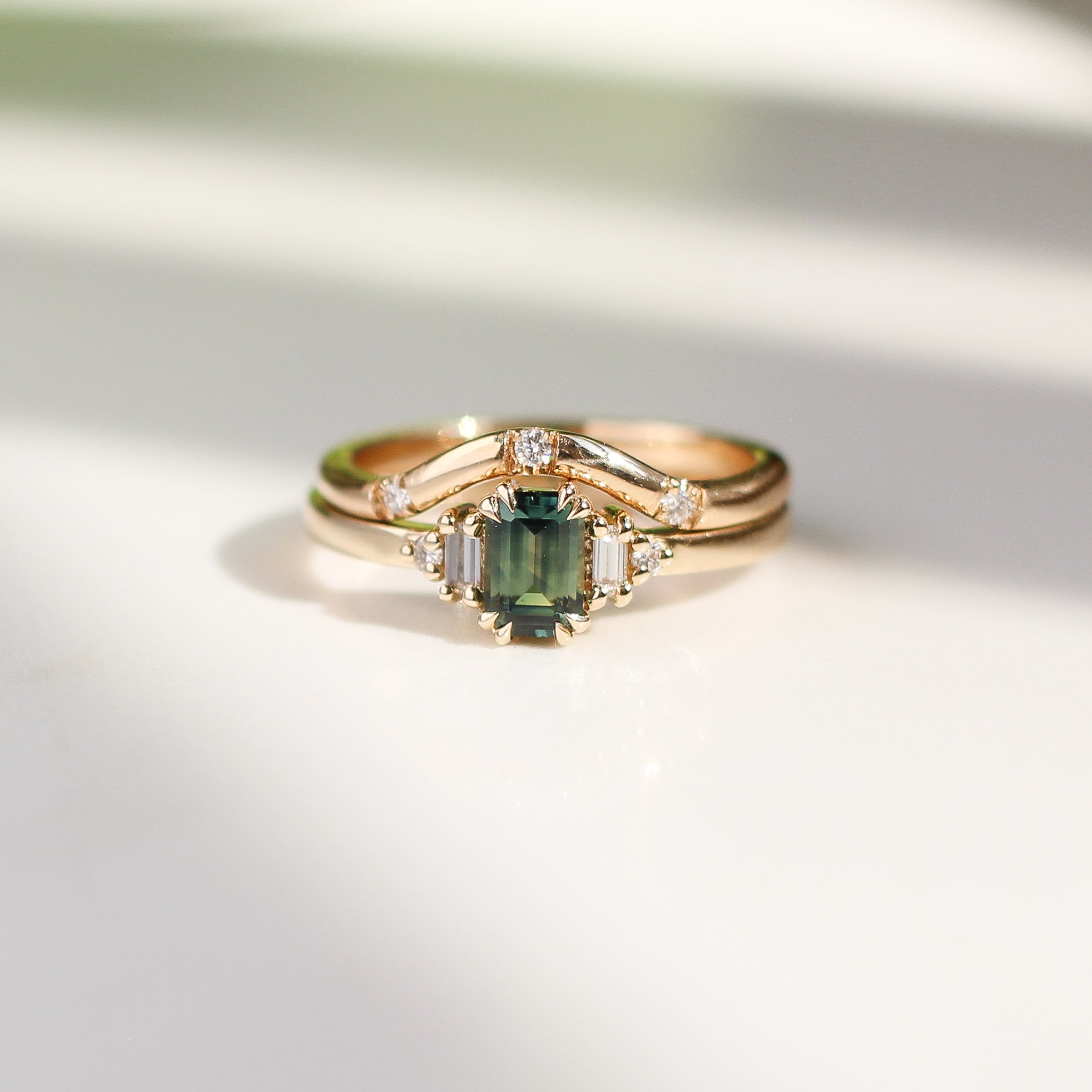 This petite version of our best selling Misceo ring features an emerald cut lush green Australian sapphire centre stone, with lively flashes of yellow and blue under certain lighting conditions. The step-cut design consists of parallel facets that create a hall-of-mirrors effect delivering a visual impact like no other. Paired with clear baguette and round brilliant cut lab created diamond accent stones set in rich yellow gold for timeless wearability. Made with a low profile for stacking with contour bands.