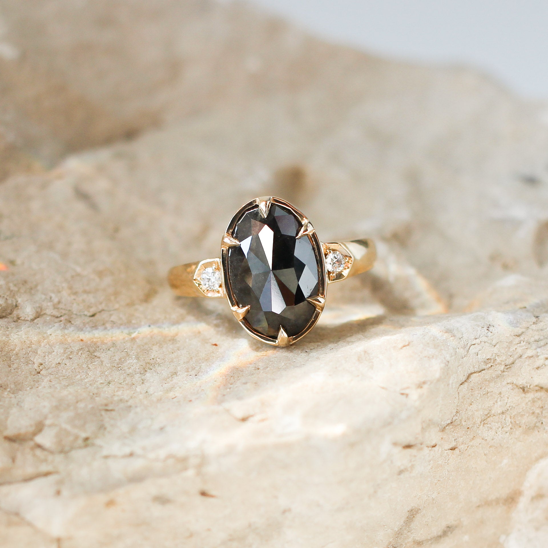 Indulge in the exquisite luxury of the Gaia Oval Black Diamond Ring. This one-of-a-kind piece showcases an oval black diamond. Perched delicately in our six prong mount, the center diamond sparkles in the sunlight, revealing its natural beauty marks. Delight in the bright diamond accents on the shoulder of the ring. With its low profile design, this ring is perfect for everyday wear. Complete the look with our elegant Large Sahara Band, sold separately.
