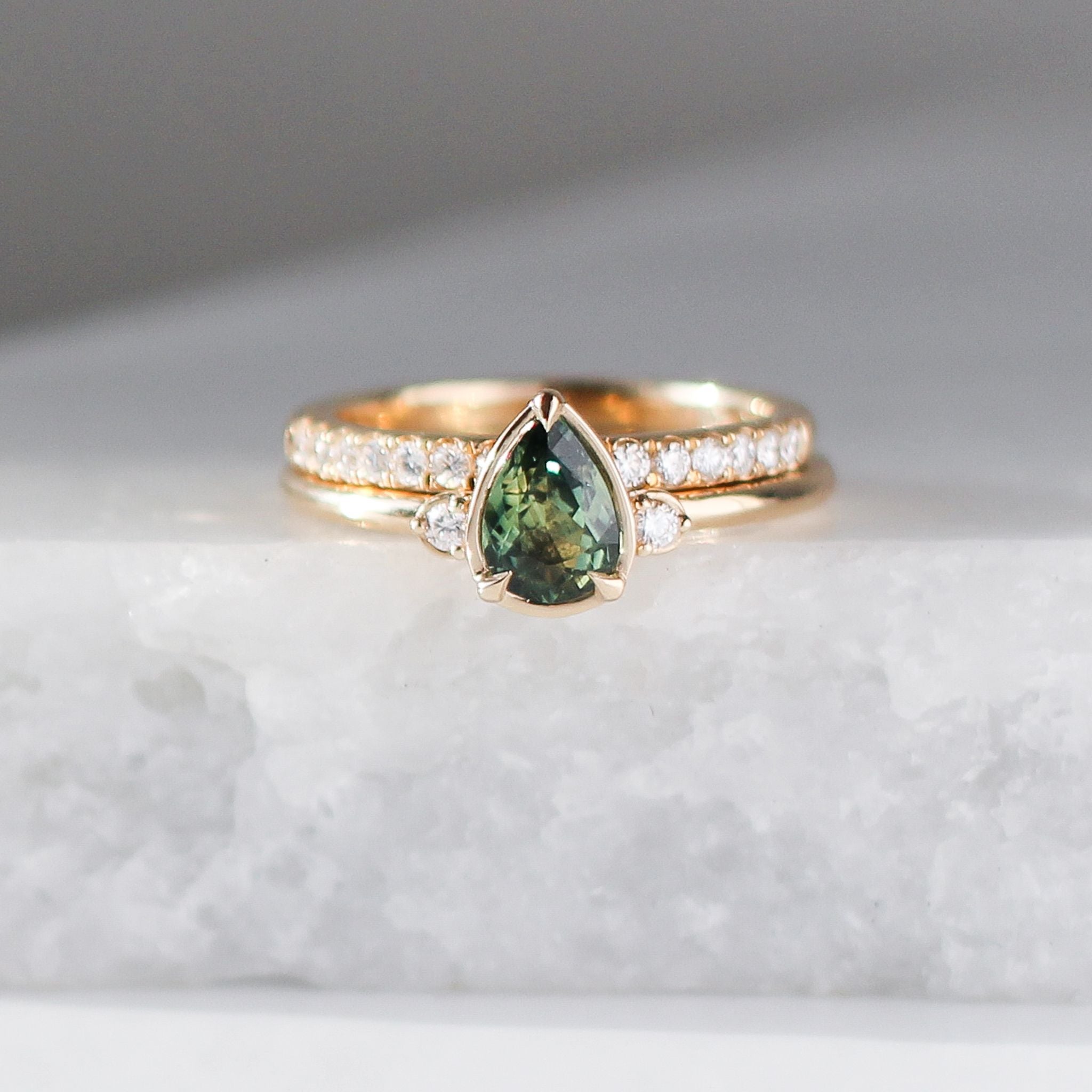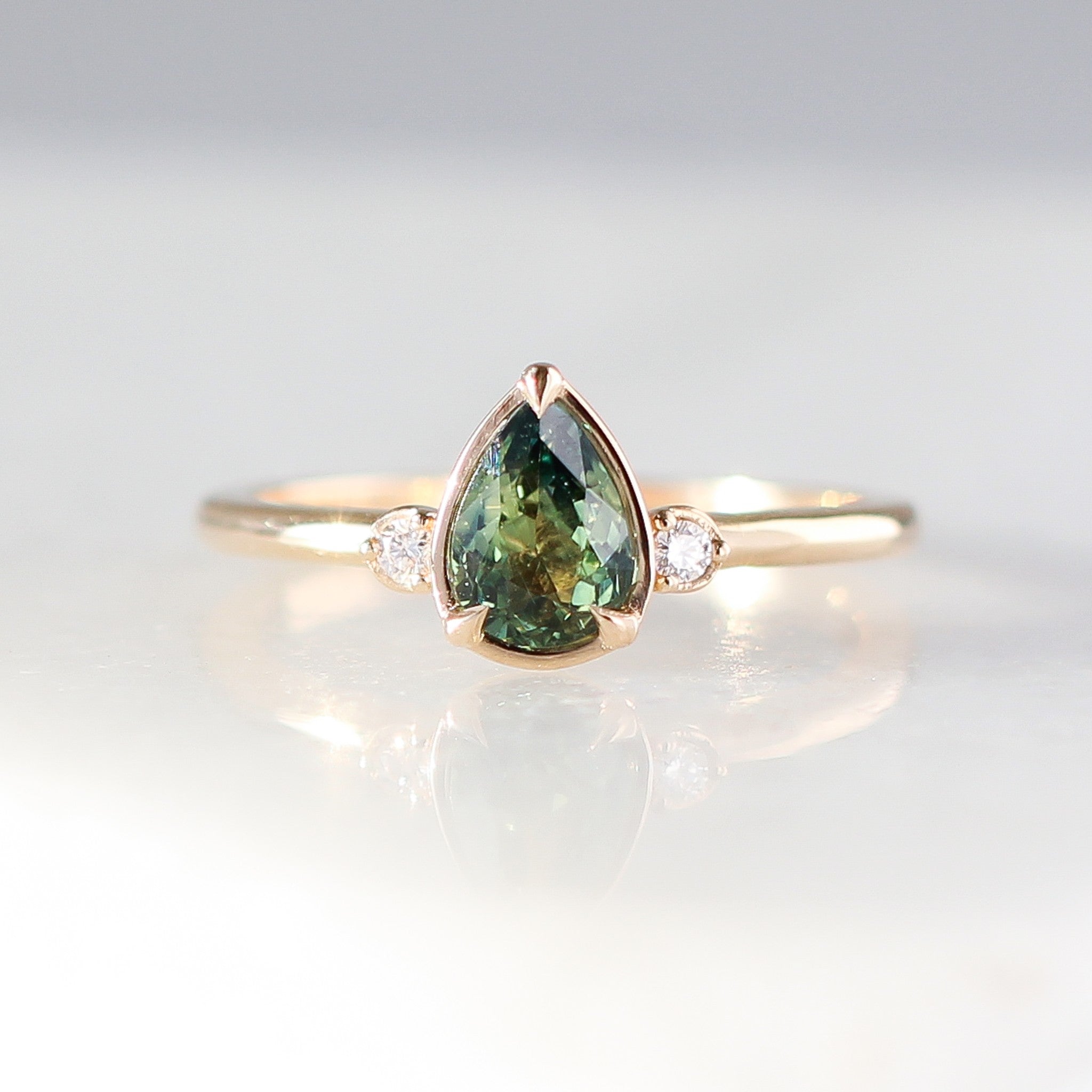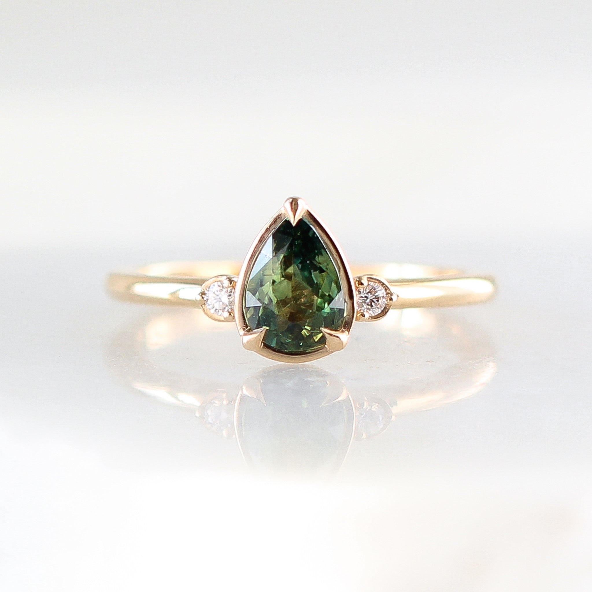 Sold. Green Lagoon Pear Cut Sapphire ring in yellow gold is an elegant three stone ring. Smaller scale than our usual styles and suited for anyone after an understated but unique occasion ring. Featuring a natural pear cut sapphire in earthy rich green colour. Accented by round brilliant cut Canadian diamonds on the shoulders to bring it together. Made with a raised setting and can be stacked with classic straight or contour bands for versatility.