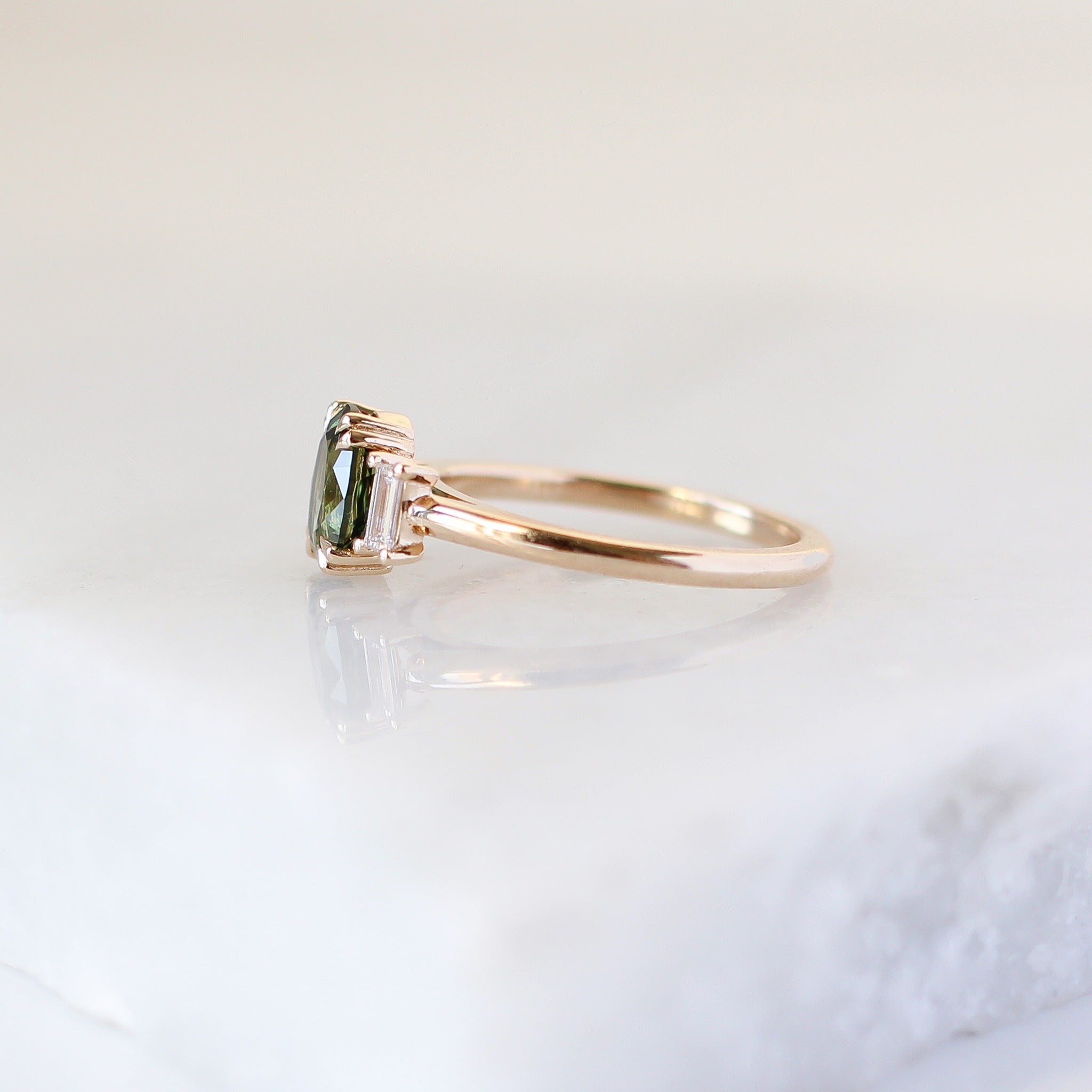 Introducing the first of its kind, our oval brilliant version of our signature Trilogy ring. Featuring an earthy chartreuse green, Australian mined sapphire at the centre flanked by elegant baguette-cut lab diamonds. With a raised open gallery and double prongs, it's timeless and yet distinctive elements make it not just a symbol of your love, but a piece of art that reflects your personal style.
