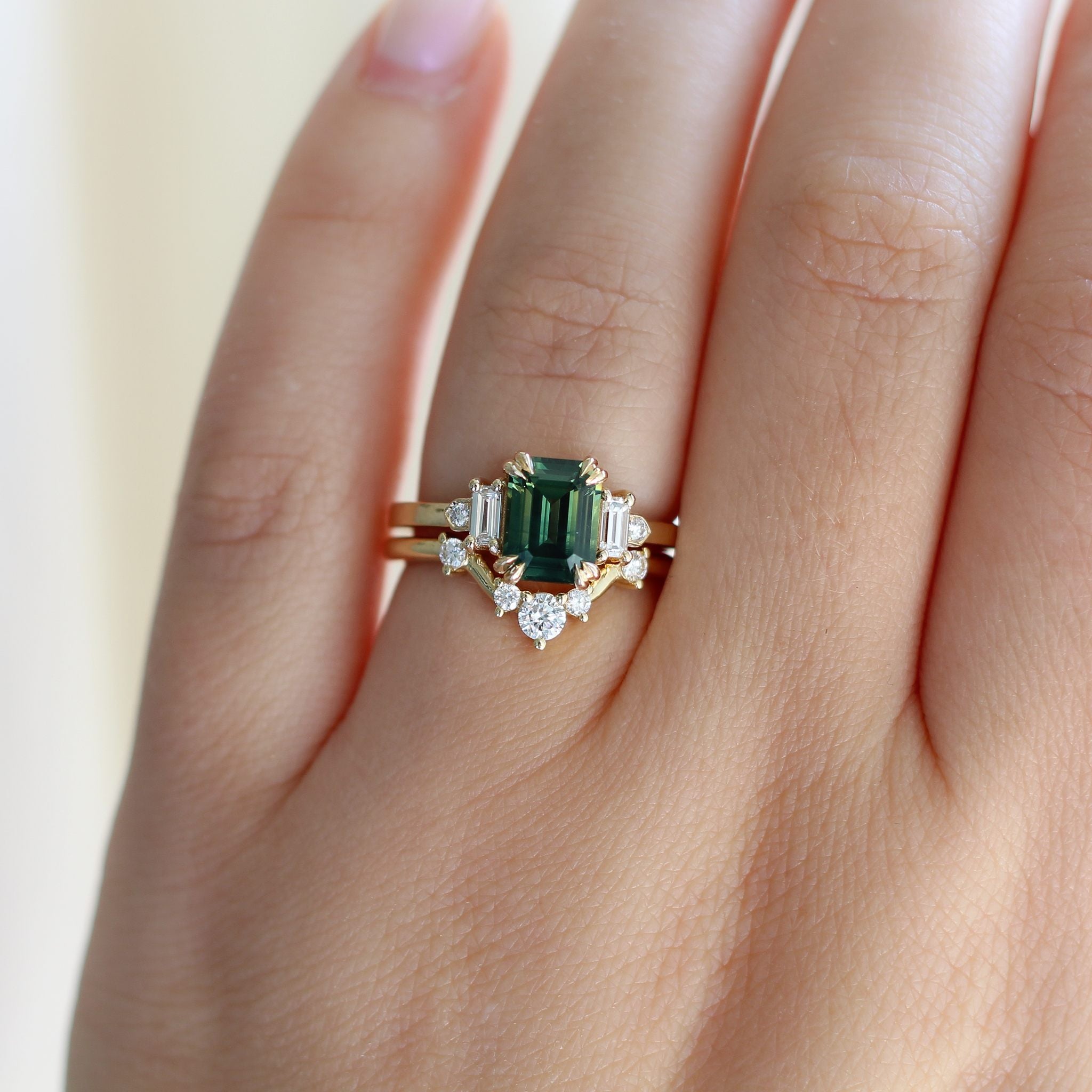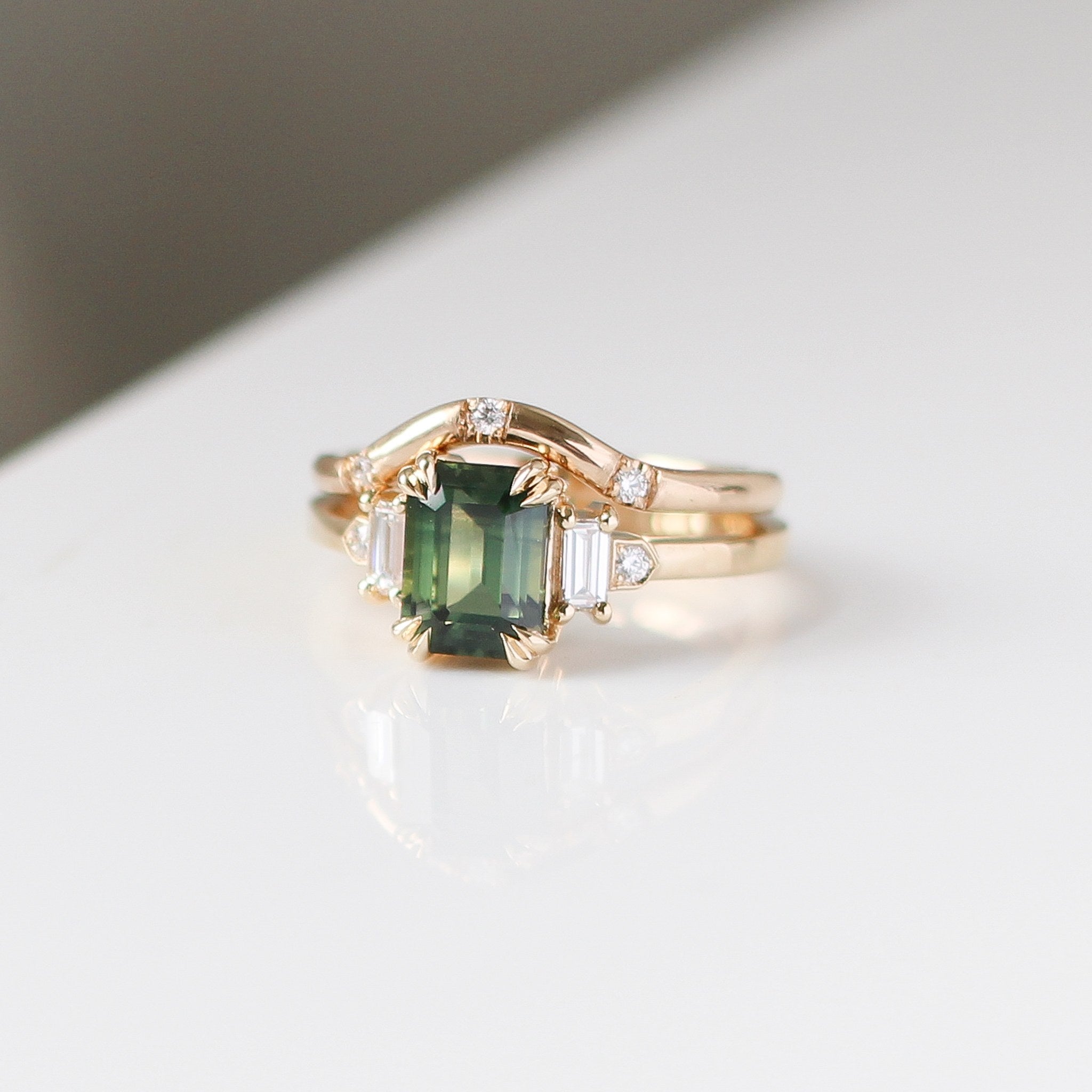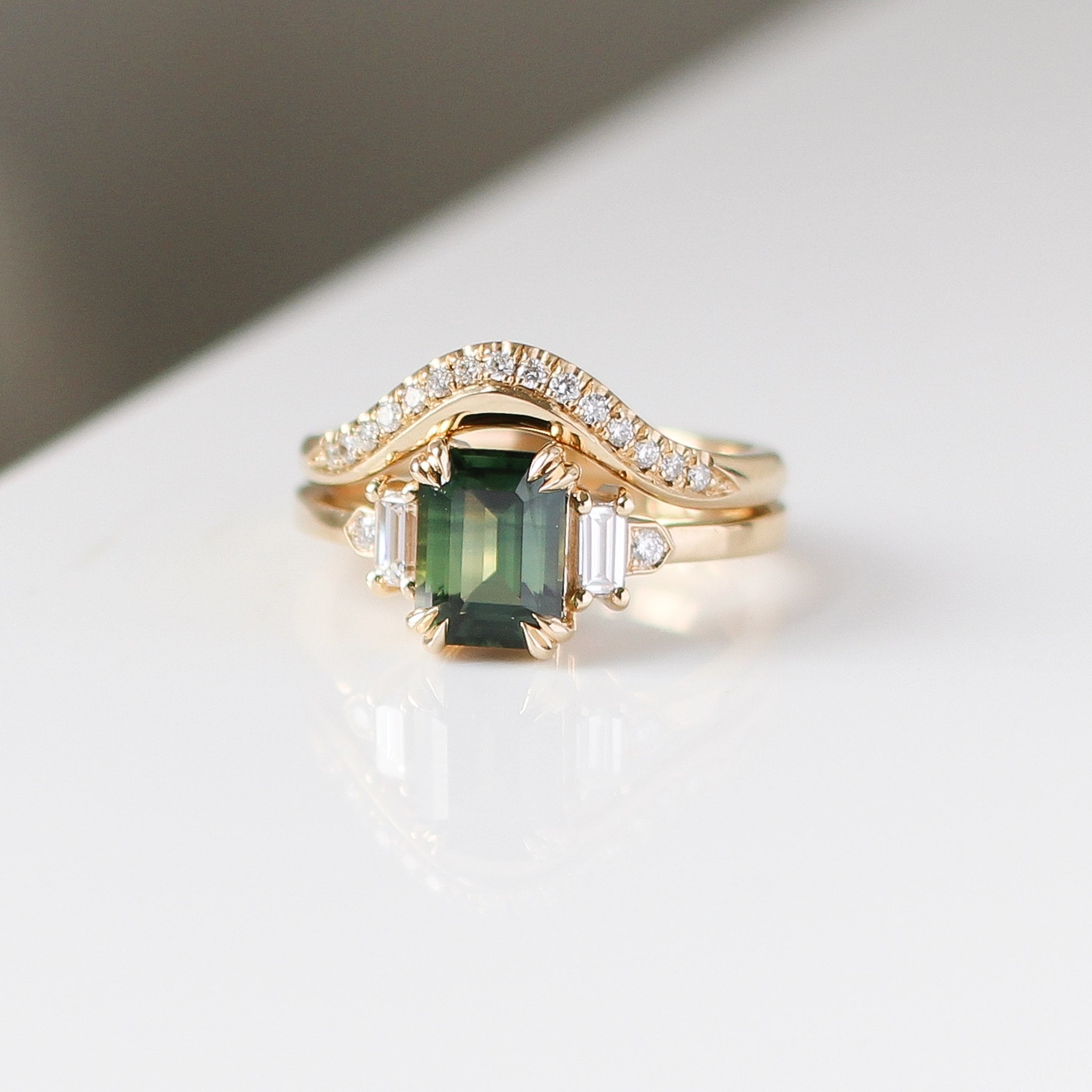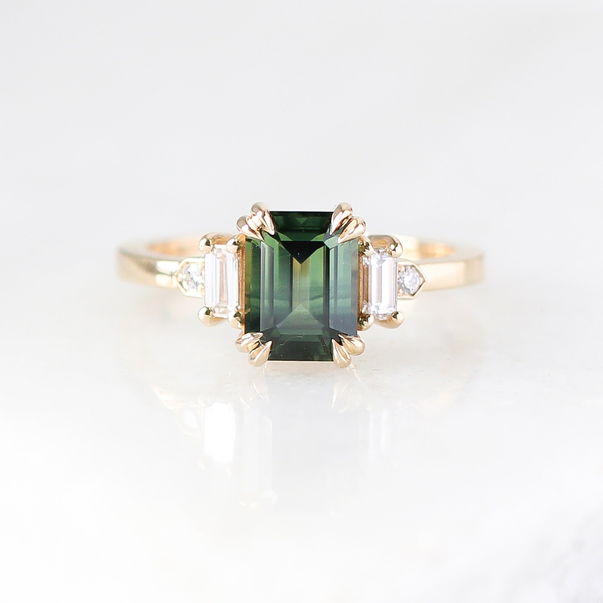 Our double claw ring is a modern twist on an Art Deco style. This breathtaking version of our signature Misceo ring features an emerald cut rich forest green Australian sapphire centre stone. The step-cut design consists of parallel facets that create a hall-of-mirrors effect delivering a visual impact like no other. Paired with clear baguette and round brilliant cut natural diamonds accent stones set in rich yellow gold for timeless wearability. Made with a low profile for stacking with contour bands.