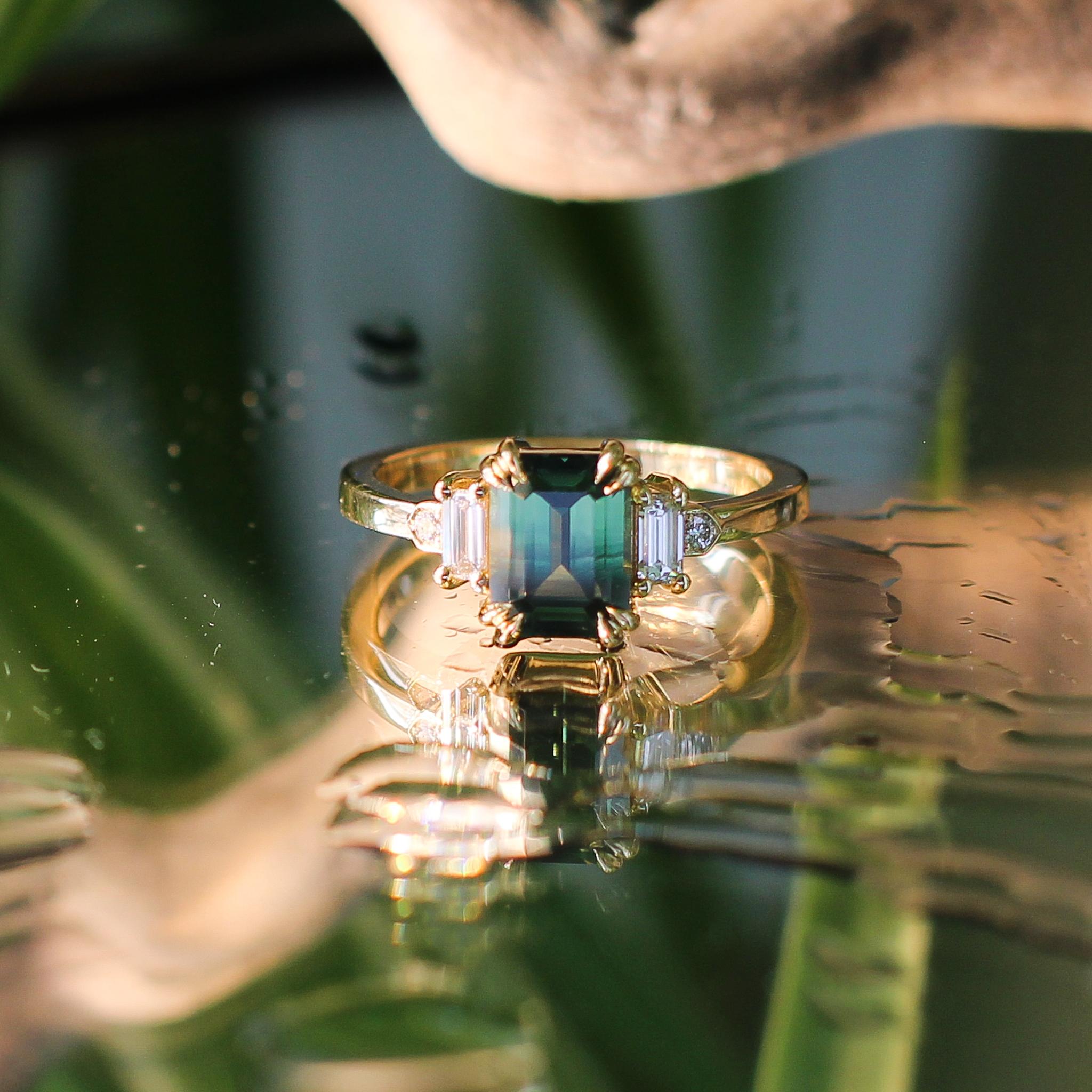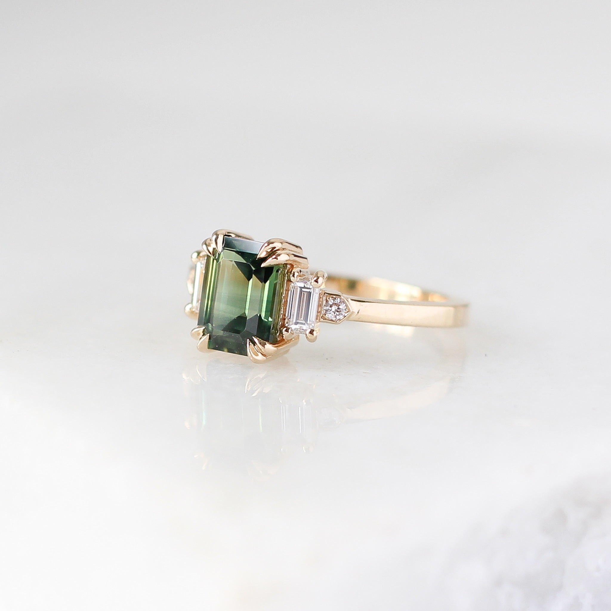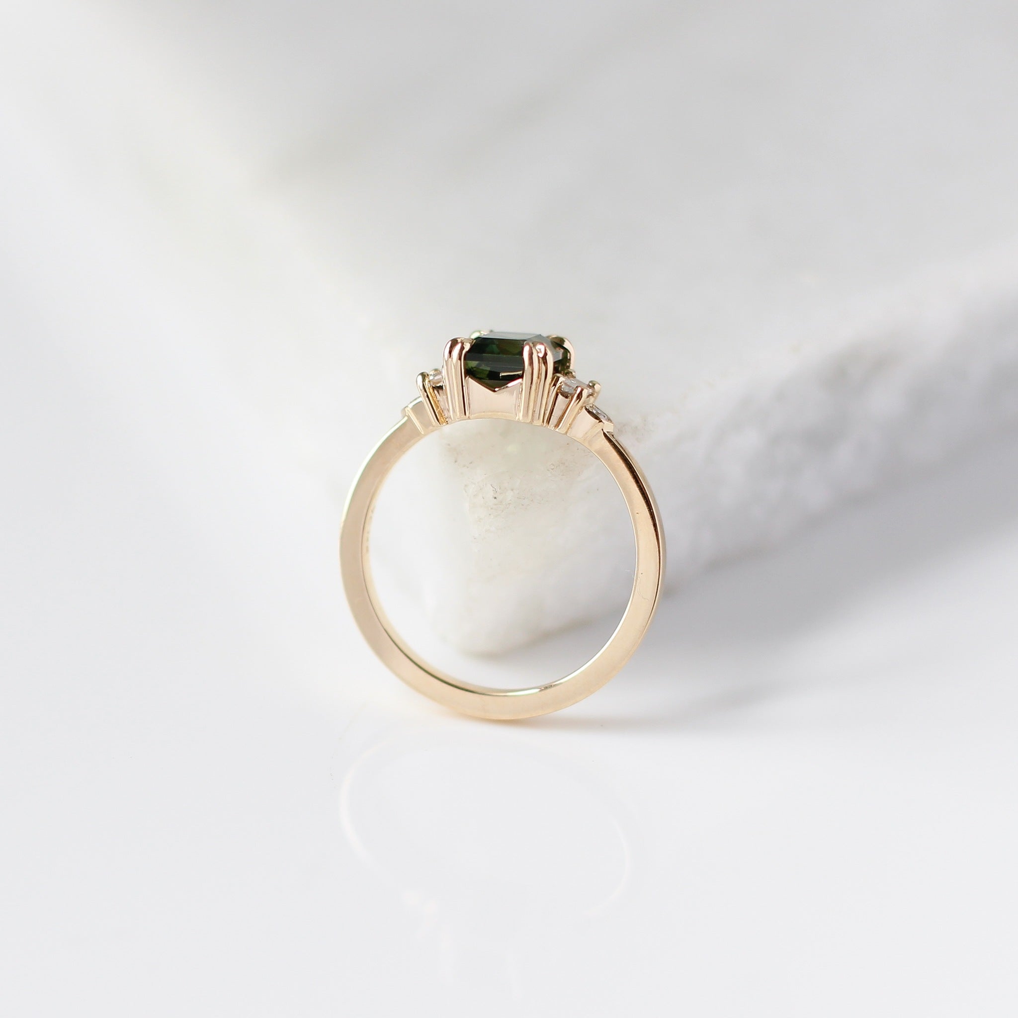 Our double claw ring is a modern twist on an Art Deco style. This breathtaking version of our signature Misceo ring features an emerald cut rich forest green Australian sapphire centre stone. The step-cut design consists of parallel facets that create a hall-of-mirrors effect delivering a visual impact like no other. Paired with clear baguette and round brilliant cut natural diamonds accent stones set in rich yellow gold for timeless wearability. Made with a low profile for stacking with contour bands.