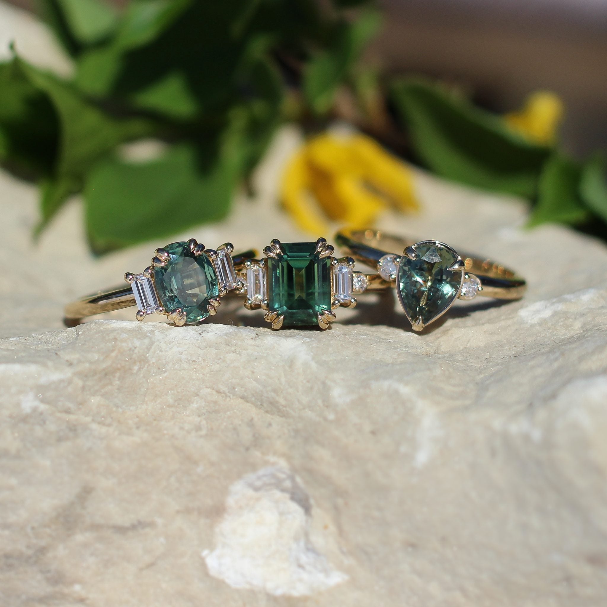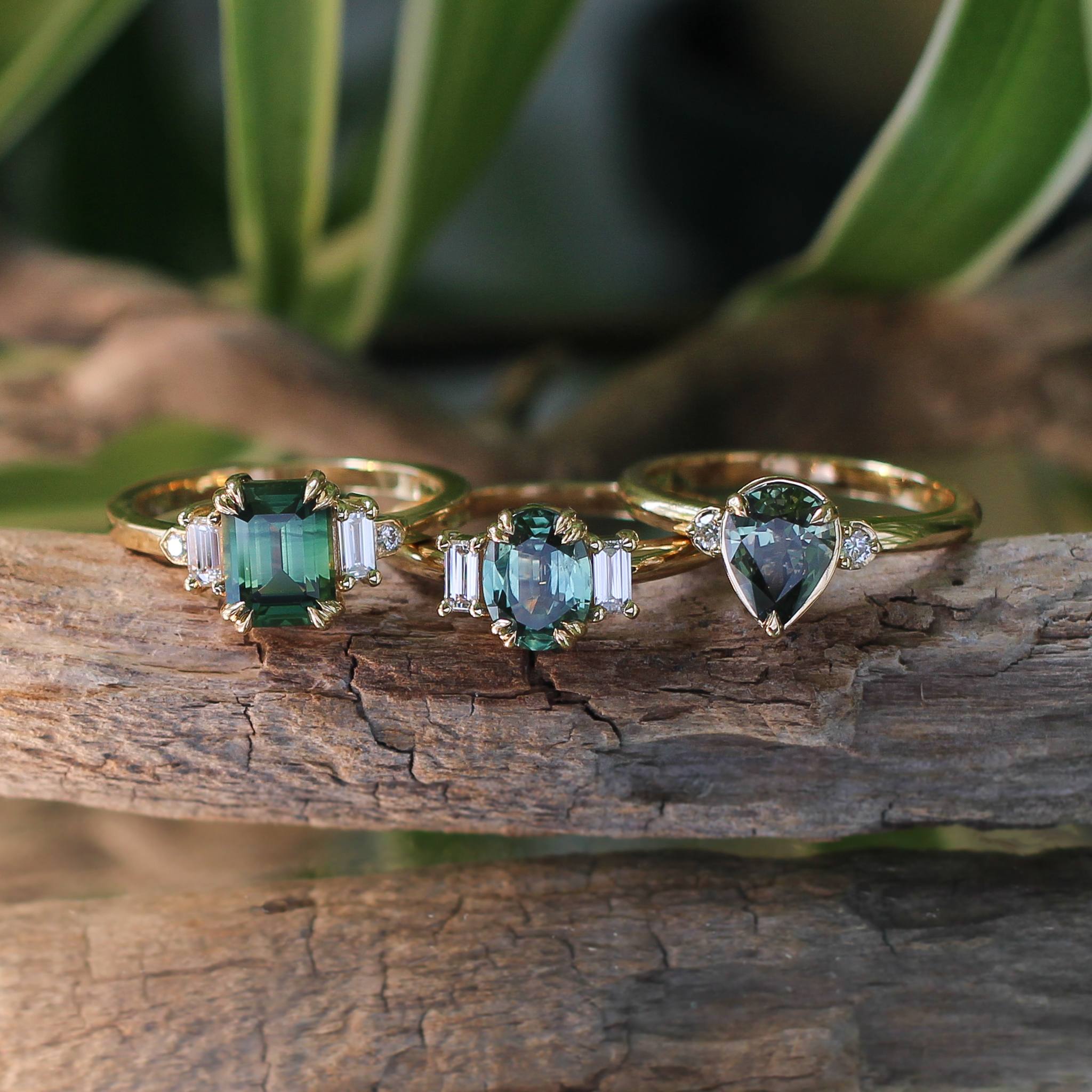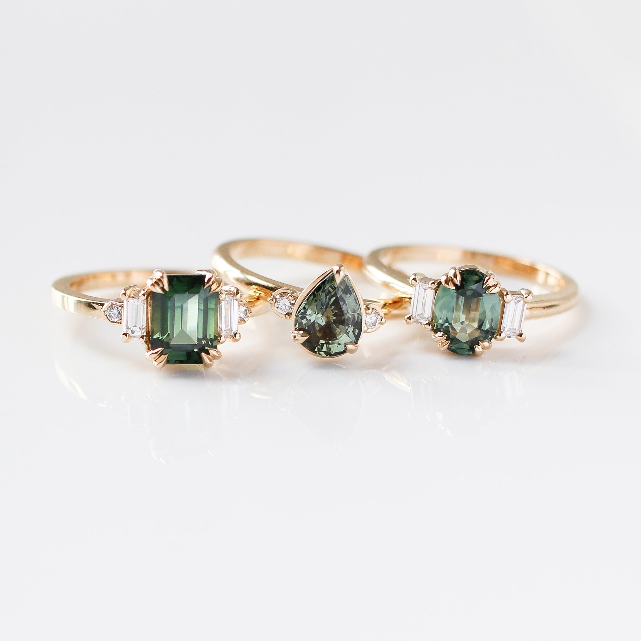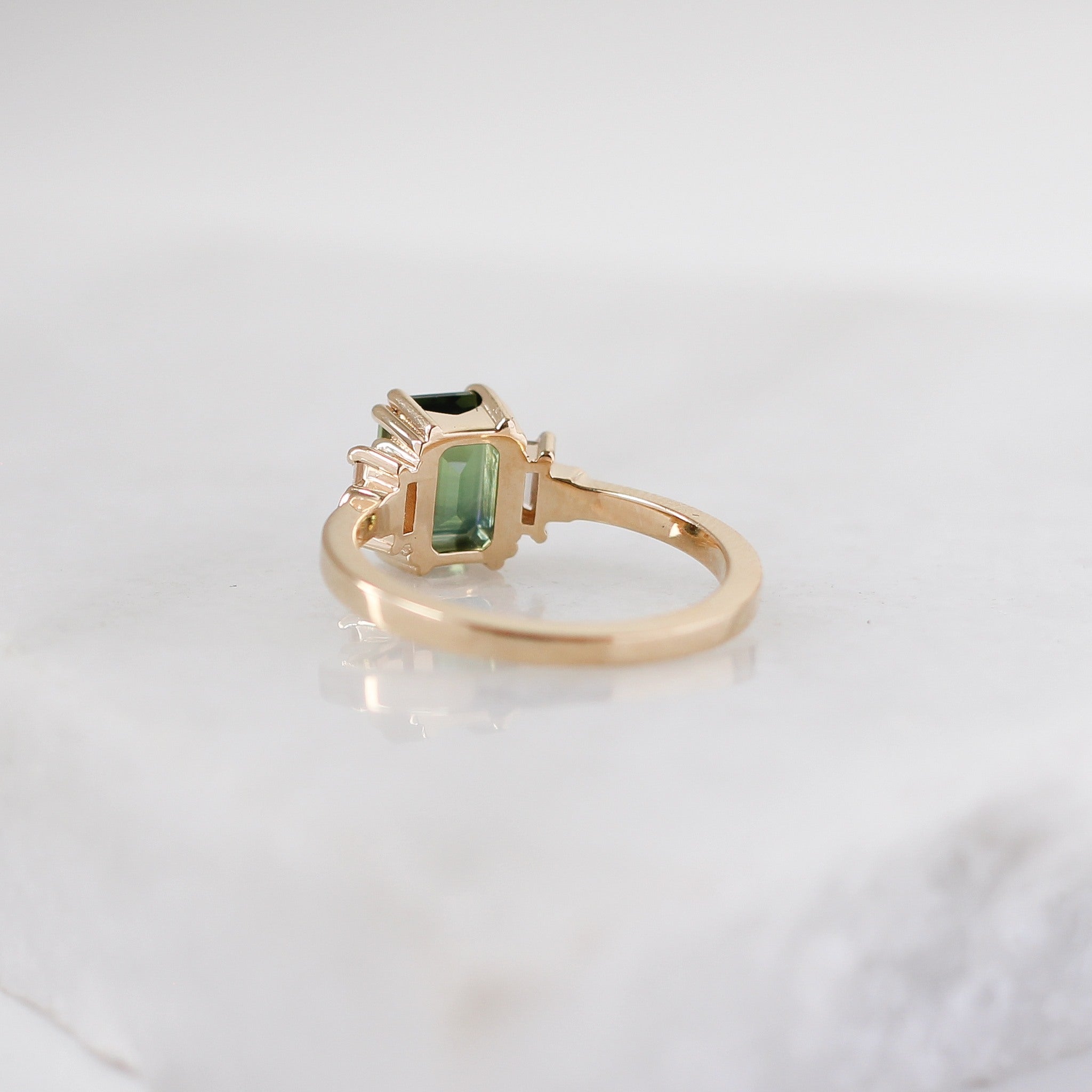 Our double claw ring is a modern twist on an Art Deco style. This breathtaking version of our signature Misceo ring features an emerald cut rich forest green Australian sapphire centre stone. The step-cut design consists of parallel facets that create a hall-of-mirrors effect delivering a visual impact like no other. Paired with clear baguette and round brilliant cut natural diamonds accent stones set in rich yellow gold for timeless wearability. Made with a low profile for stacking with contour bands.