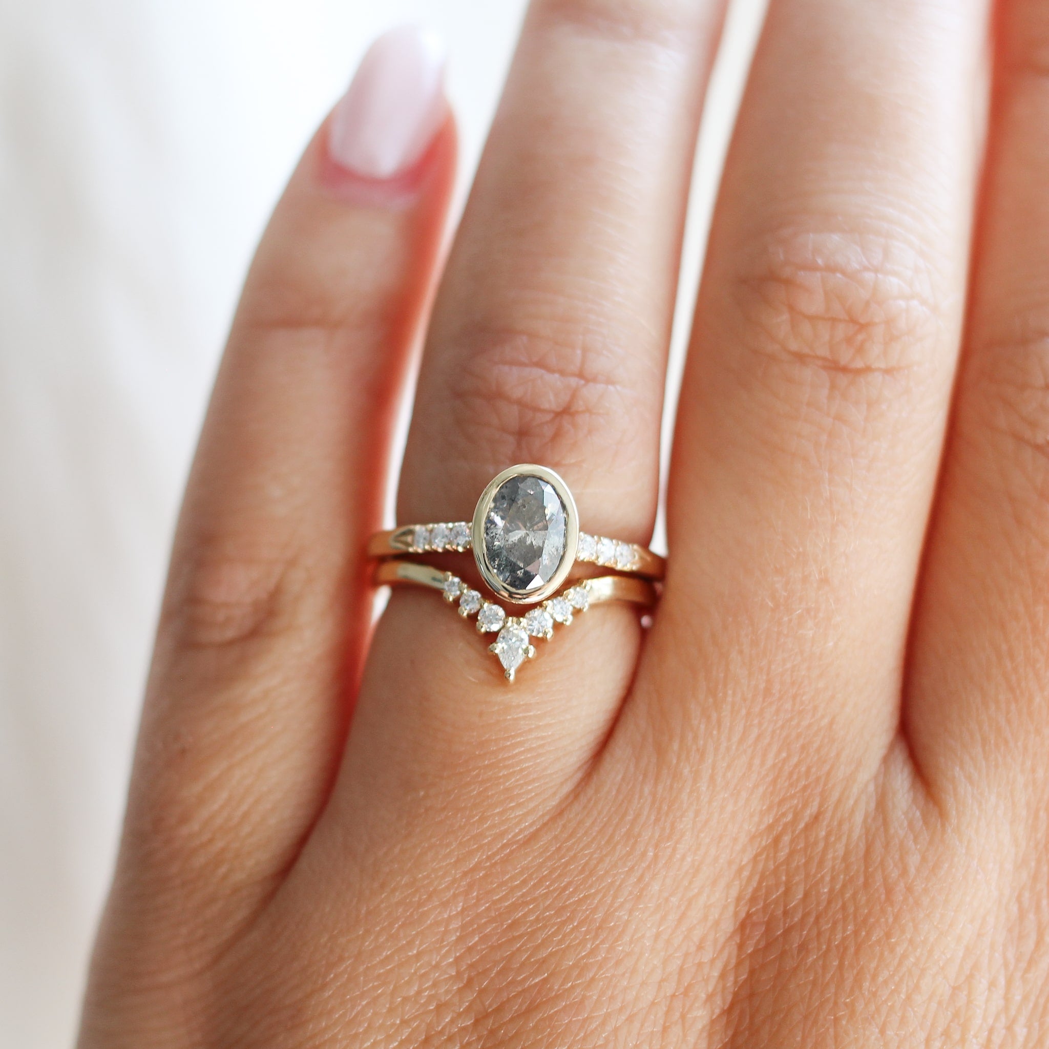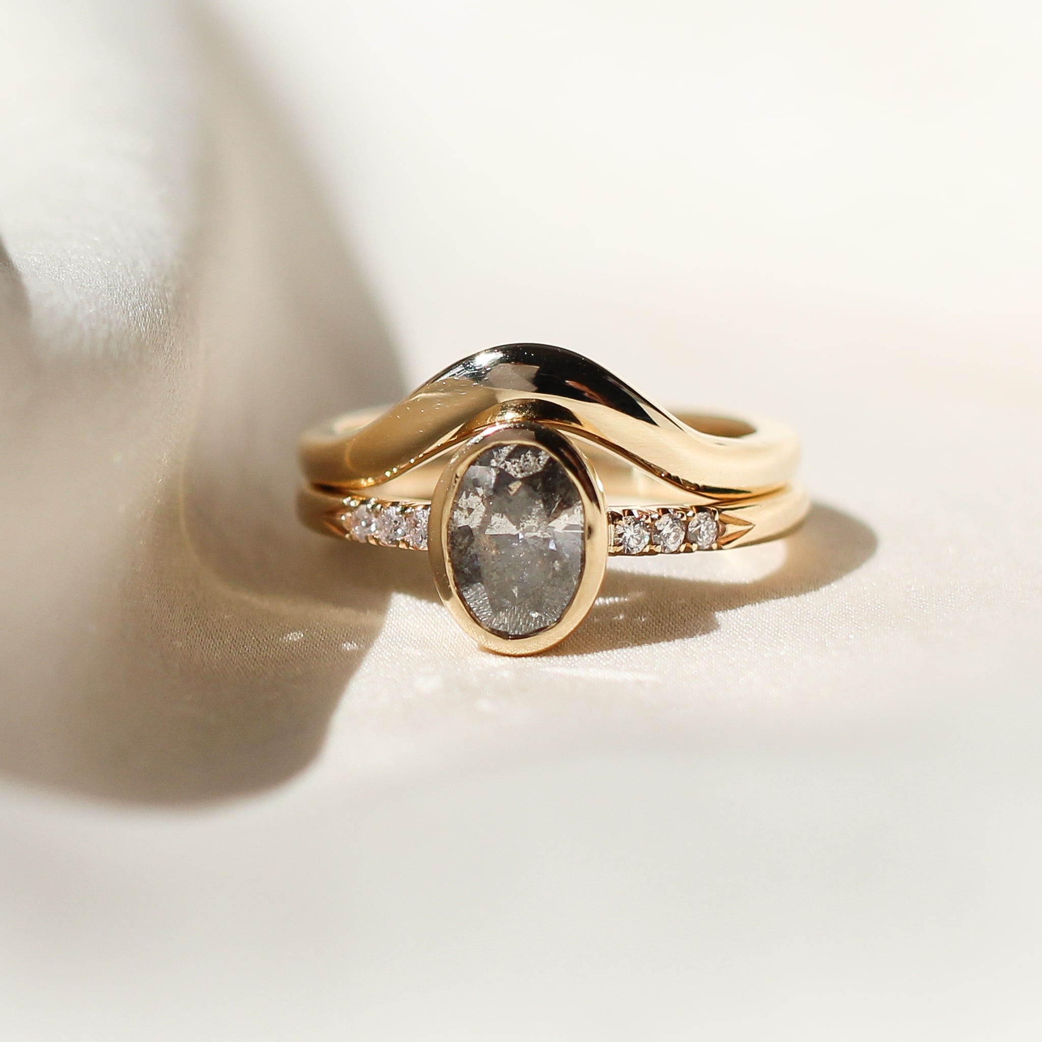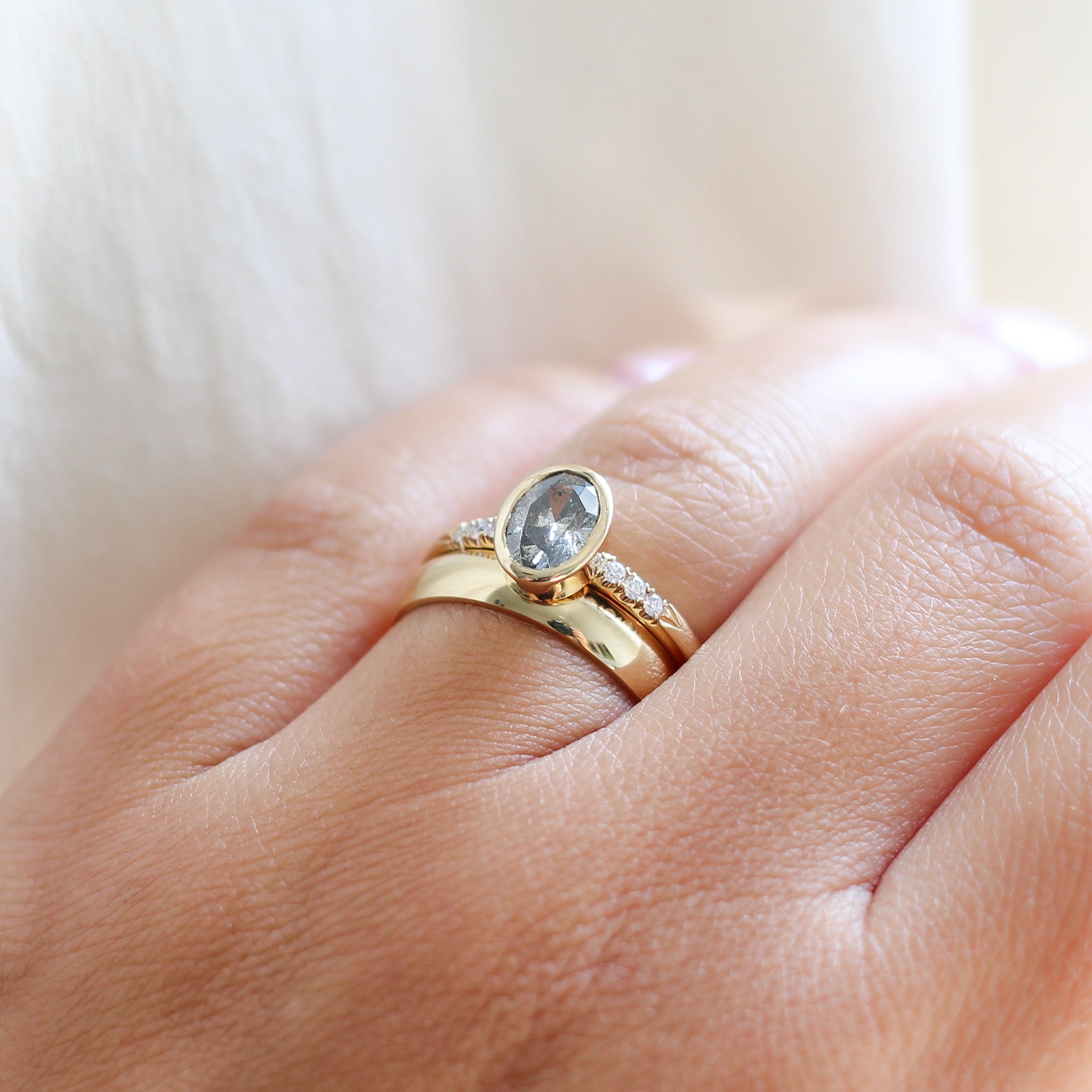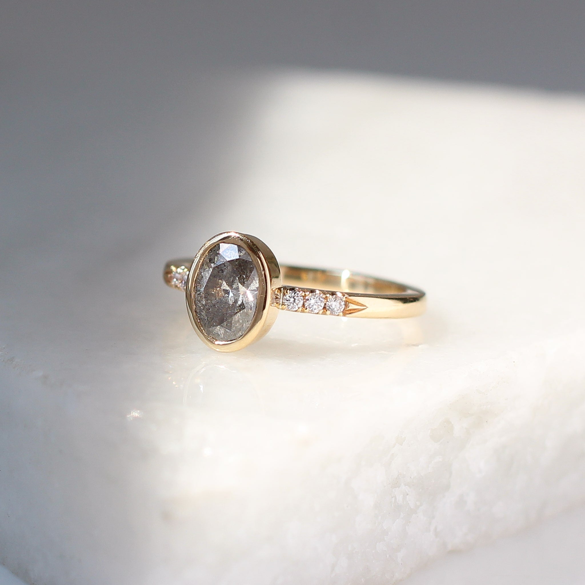 This oval bezel salt and pepper diamond ring is expertly designed for stacking and pairs perfectly with straight or curved bands. The bezel setting keeps the diamond secure while offering comfort for everyday wear and active lifestyles. With the one of a kind salt and pepper diamond centre and colourless Canadian diamonds in the band, this ring is a unique and versatile accessory for any modern lifestyle.