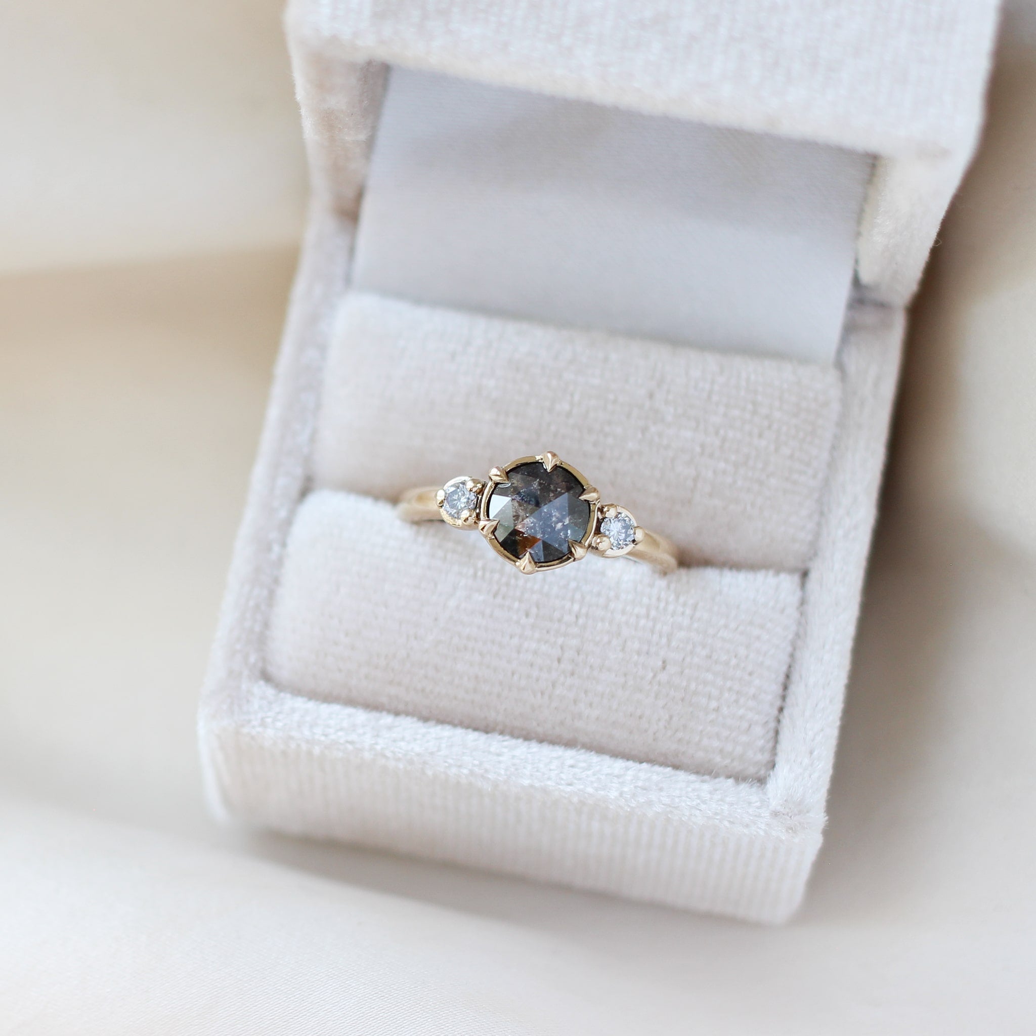 The Luna ring showcases a beautiful natural black diamond held securely in the middle with six prongs. It's a customer favourite, skillfully crafted with traditional techniques in solid gold for a timeless look. This ring has a low profile for comfortable wear and pairs perfectly with contour bands. Enhance the look with our Sunrise Salt & Pepper Diamond Band and Large Diamond Wave band, available separately.
