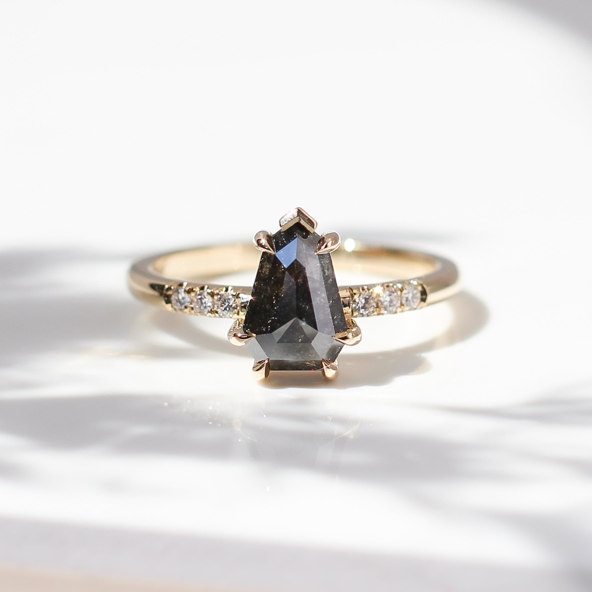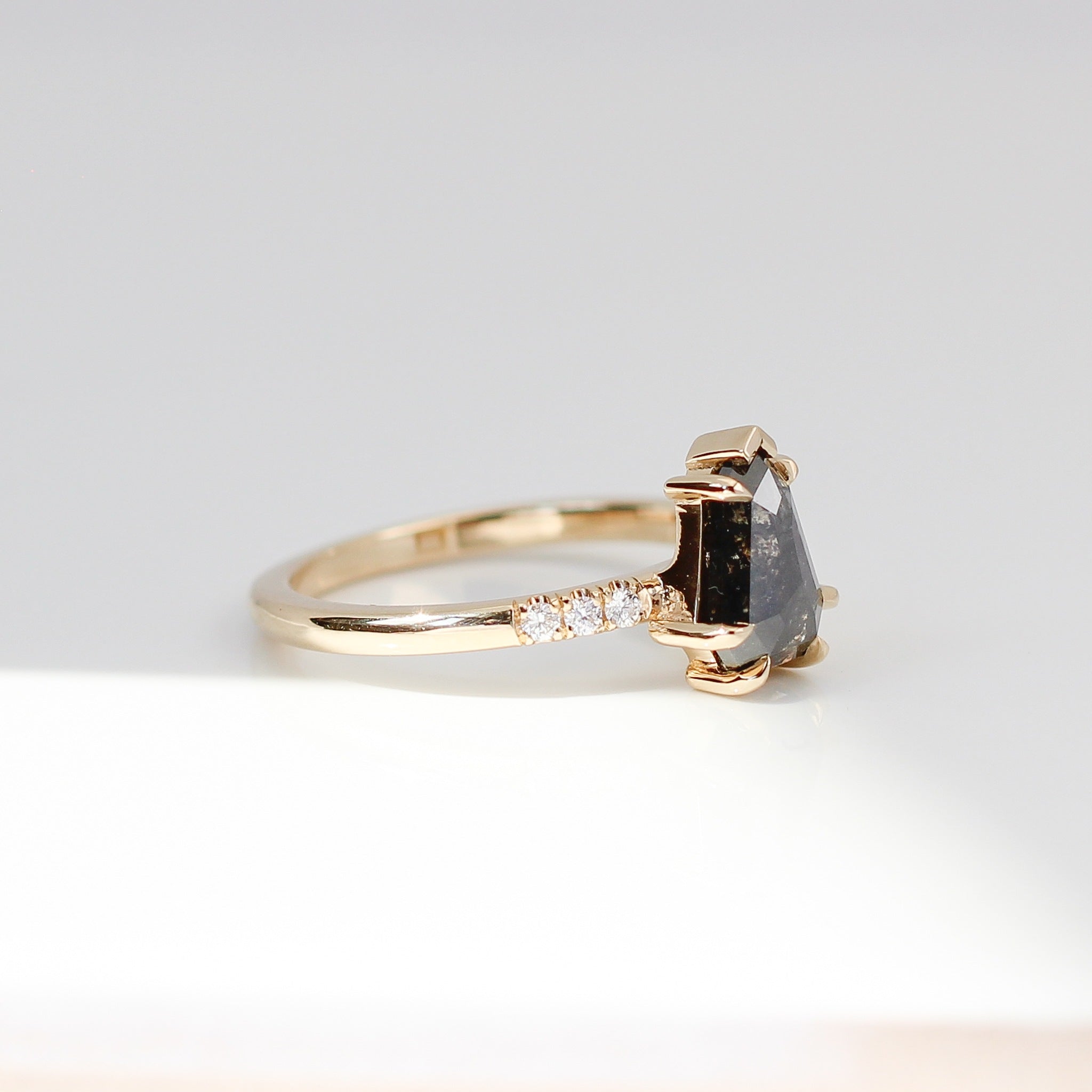 With its low-profile setting and clean lines, shield cut diamond ring embodies modern minimalism. It's a symbol of commitment that speaks volumes about your unique style and appreciation for craftsmanship. The centre stone, with organic inclusions,  has one-of-a-kind character. Delicate diamond accents elegantly adorn the band, enhancing the brilliance of the centre stone while maintaining a minimalist aesthetic. Staci’s best with straight or contoured bands. Pictured with Diamond Pave, Serina and Salt & Pepper Sahara bands, sold separately.