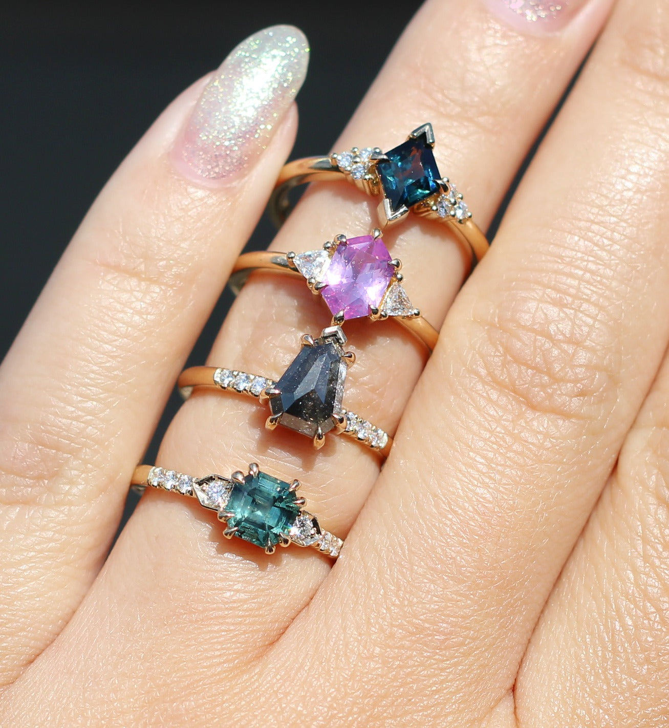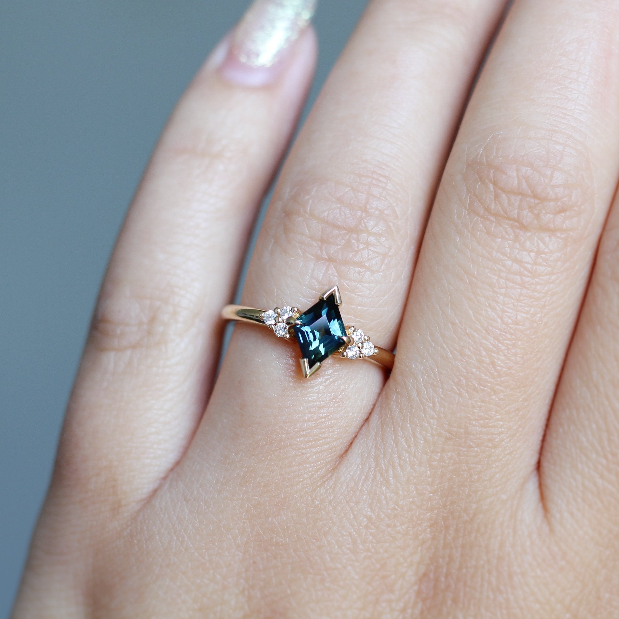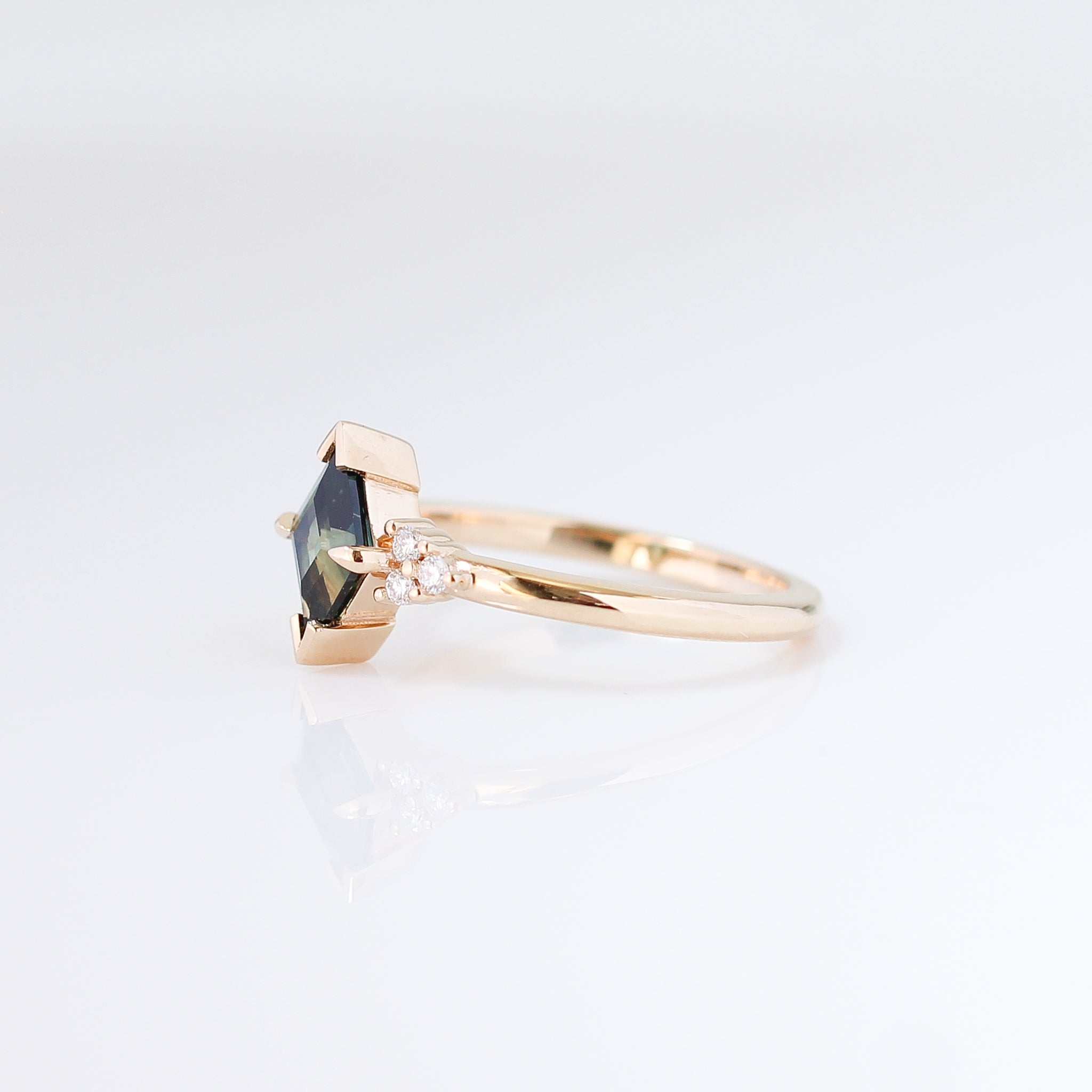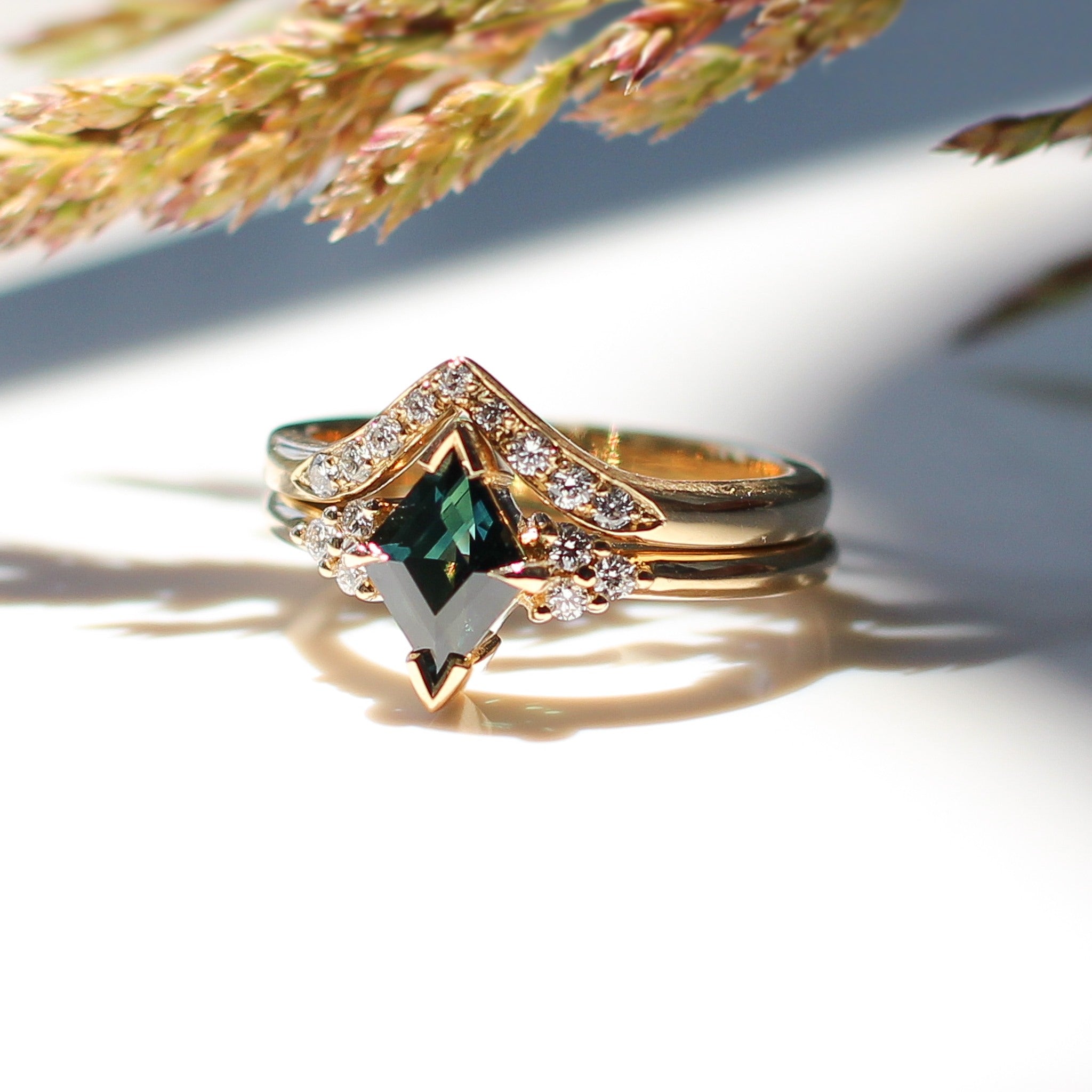 Our Teal Kite Sapphire Ring ring features an exquisite Australian sapphire with subtle flashes of blue, complemented by understated diamond accents for a refined touch. Set in a low-profile design, it seamlessly blends timeless elegance with unconventional beauty. Stacia best with contour bands and pictures with Diamond Point, Kite Diamond Point, 3 Diamond Point and Serina bands, sold separately.