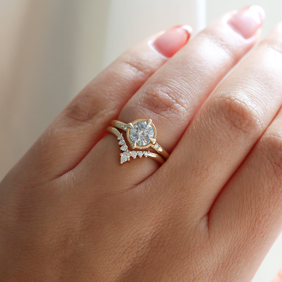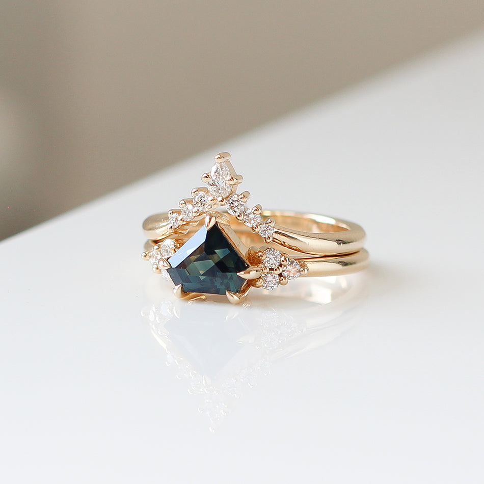 Serina diamond crown style band with pointed curve. Snugs best with marquise, pear, or oval shaped engagement rings but is versatile with most shapes. Wear it with a medium sized setting or rock it solo as a statement piece.