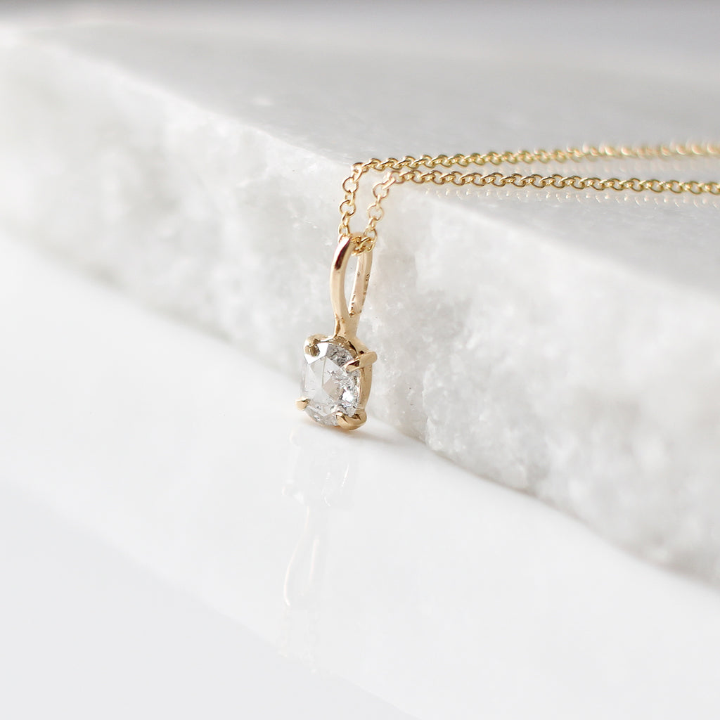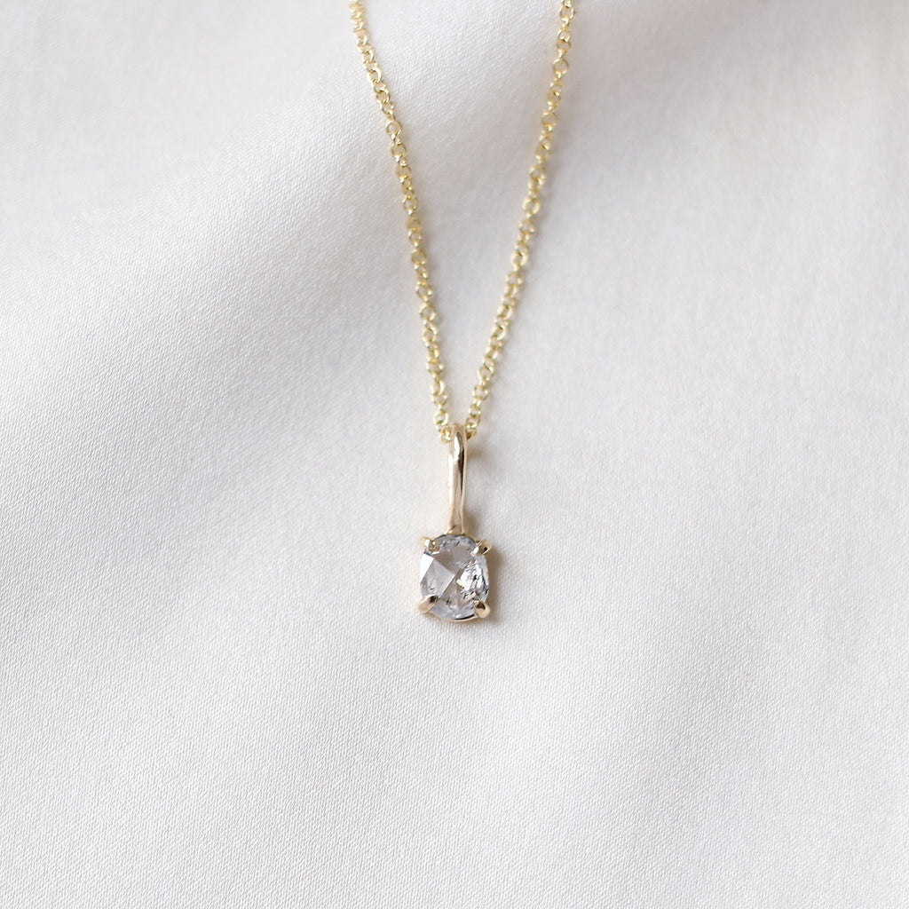 Elegant oval rose cut diamond necklace with an organic feel. Featuring beautiful quality salt & pepper diamond rose cut centre in a modern 4-prong setting with versatile large bail loop for any size chain. Sold as a pendant only or with 18” chain.