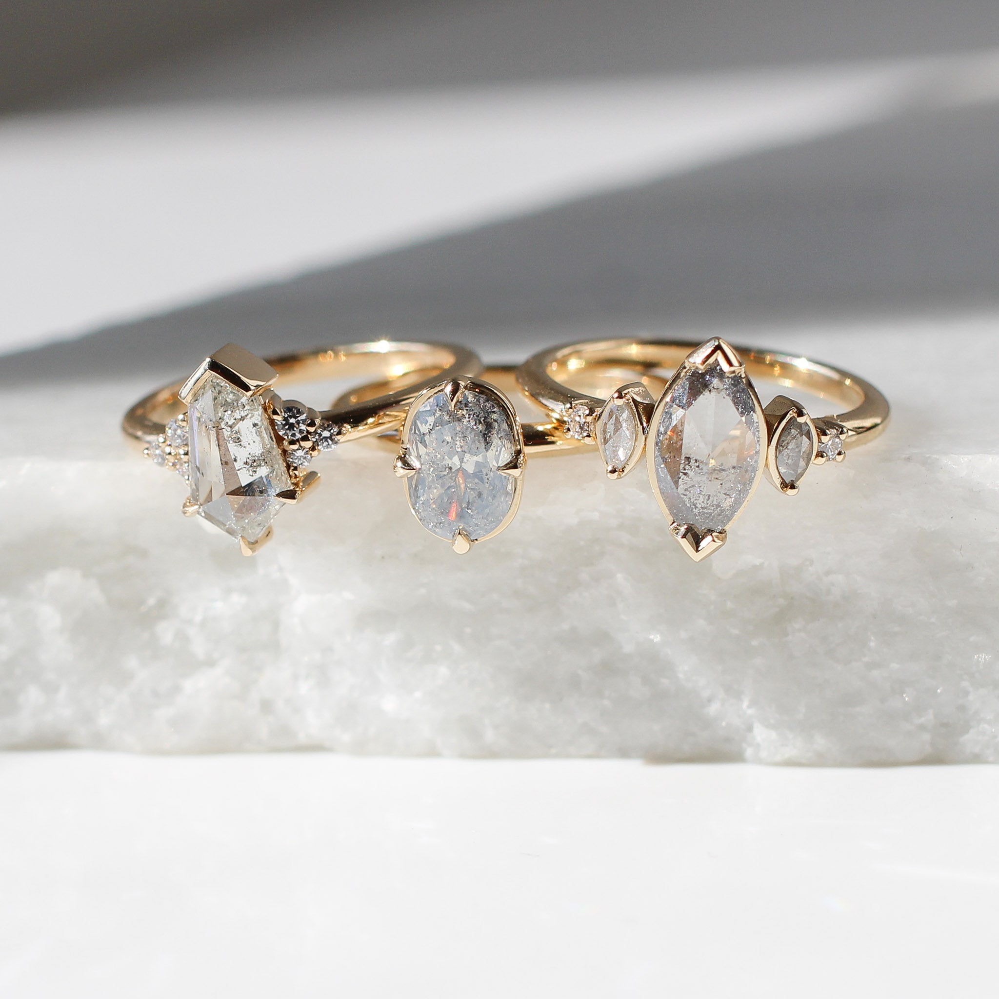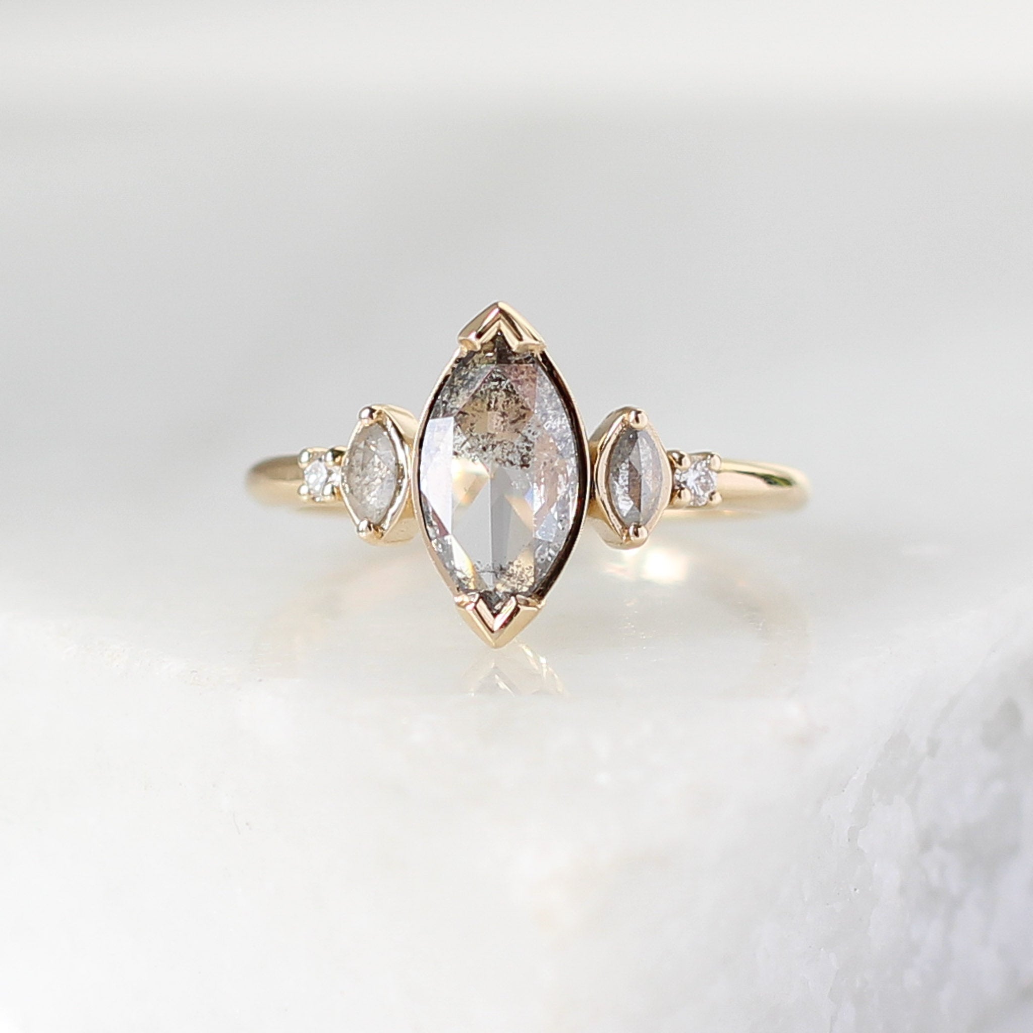 Unleash your adventurous spirit with this unique engagement and statement ring. It features a marquise cut salt and pepper diamond in the centre, flanked by smaller marquise and round diamonds on the sides. The elongated shape accentuates the finger, while the low profile setting ensures comfort. Pair it with pointed contour bands for the ultimate daring look!