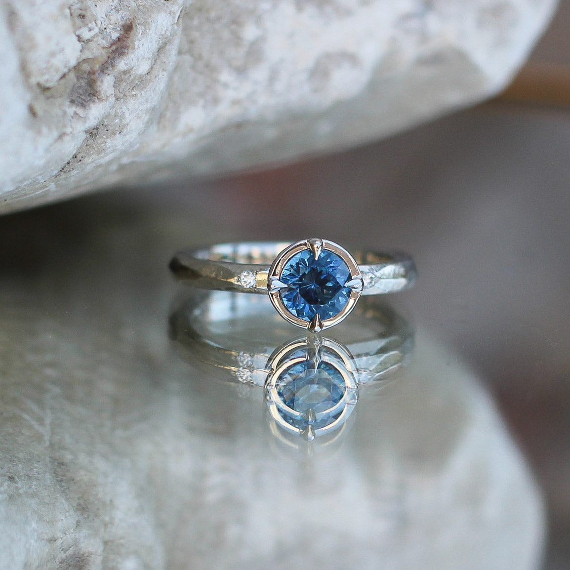 Centre setting features ethically mined blue sapphire from Rock Creek mine in Montana. Compass set prongs and open gallery underneath maximize the sparkle. Accented with Canadian diamonds and textured band. The setting is raised to fit flush or curved band next to it.