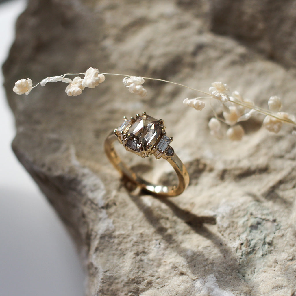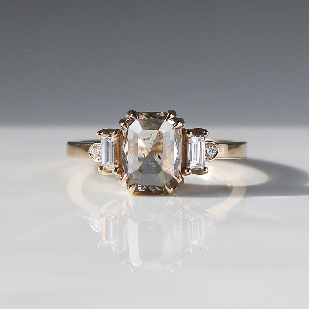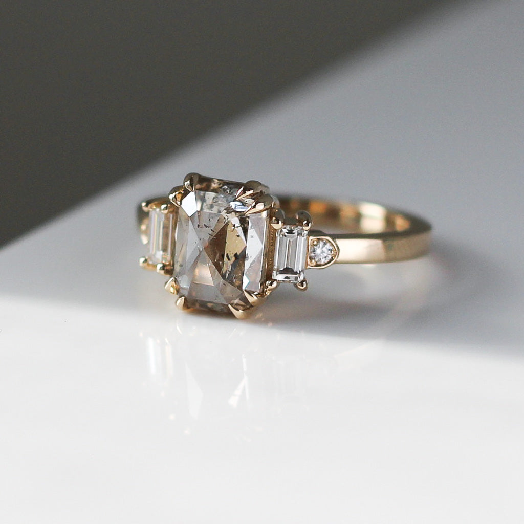 Modern twist on an Art Deco style. Misceo Emerald Cut Champagne Diamond Ring is a party you will not want to leave early. Featuring one of a kind champagne salt & pepper diamond in the middle with faceting that is spilling over with fire all day and night. Contrasted with clear baguette and round diamonds making it glamorous but never too much.