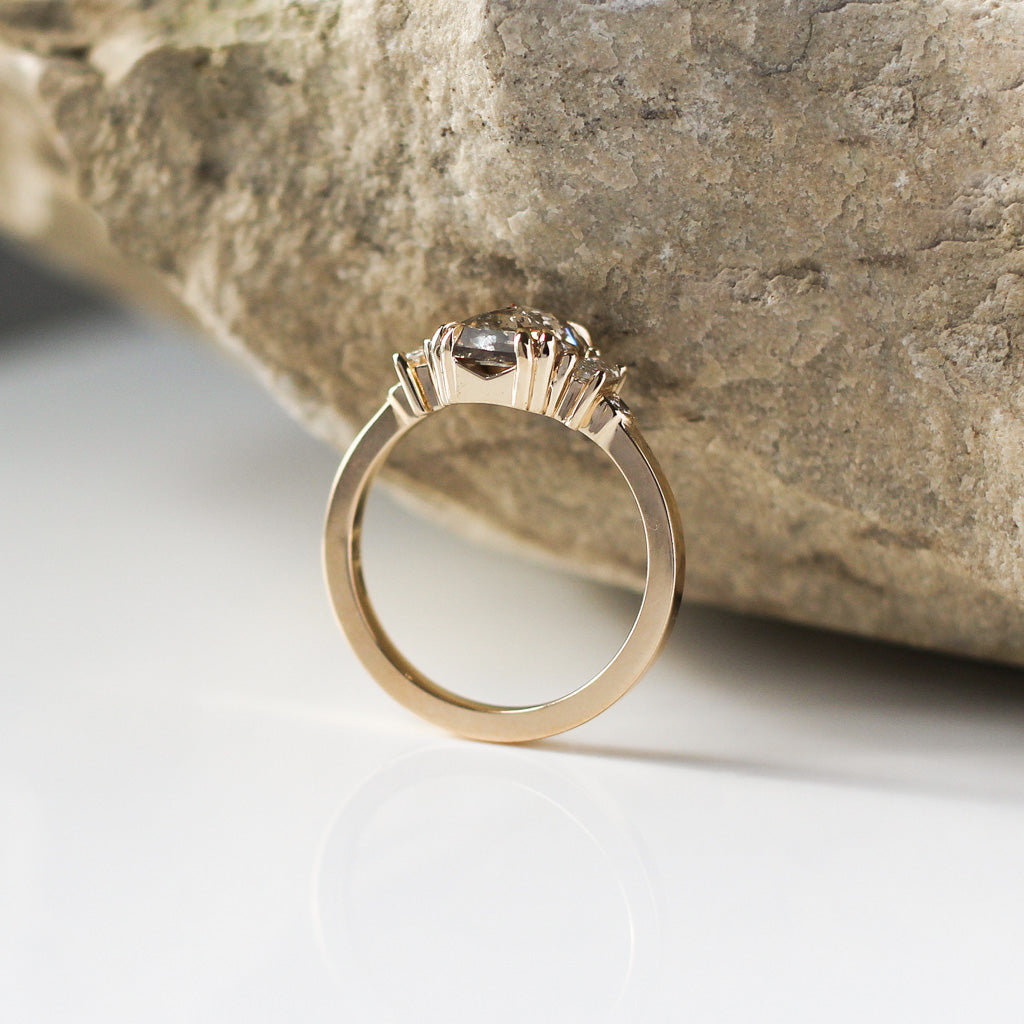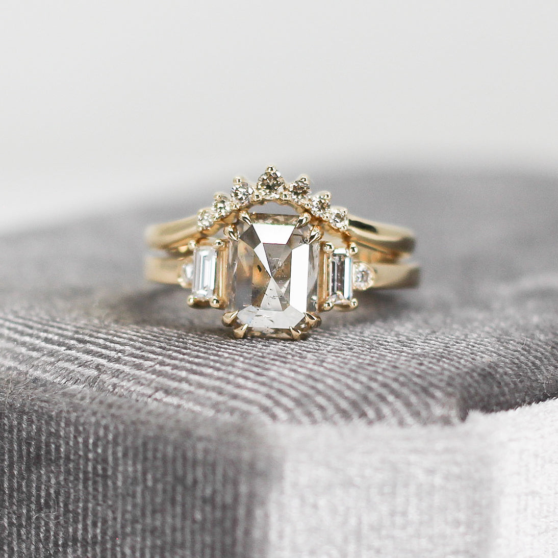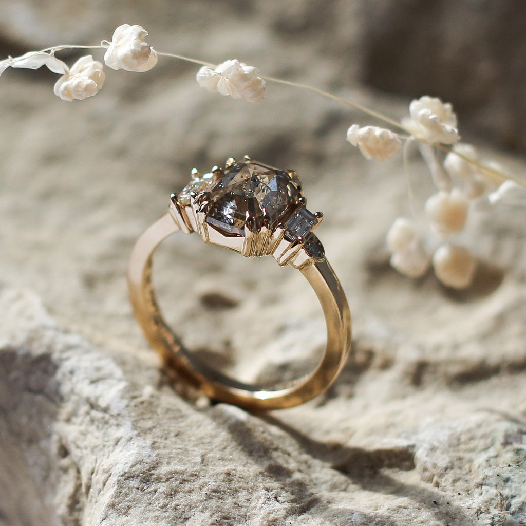Modern twist on an Art Deco style. Misceo Emerald Cut Champagne Diamond Ring is a party you will not want to leave early. Featuring one of a kind champagne salt & pepper diamond in the middle with faceting that is spilling over with fire all day and night. Contrasted with clear baguette and round diamonds making it glamorous but never too much.