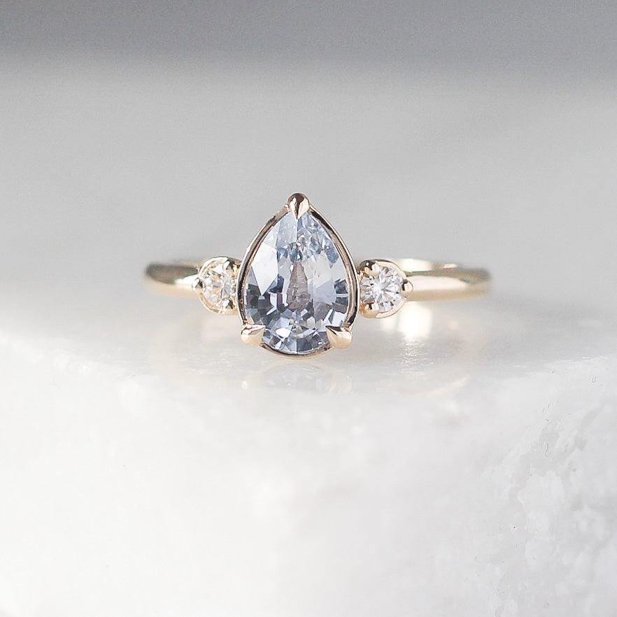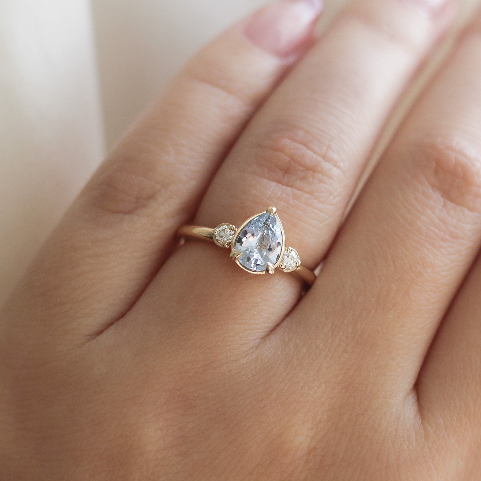 Blue Lagoon Pear Cut Sapphire ring in yellow gold is an elegant three stone engagement ring for any modern bride. Featuring a sweet light blue pear sapphire in the middle. Accented by round brilliant Canadian diamonds on the shoulders. With hardness only second to a diamond, sapphires make for a great durable alternative to a diamond ring.