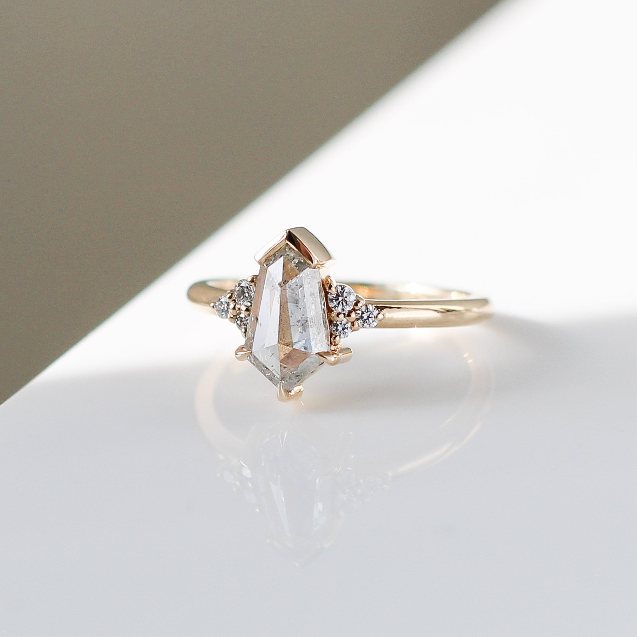 Our Glacier setting featuring one-of-a-kind icy salt & pepper kite diamond. Hugged by clusters of Canadian diamonds. We love the icy and elongated look. Set with a low profile which stacks best with pointed contour bands like our Serina, Diamond Point, Kite Point