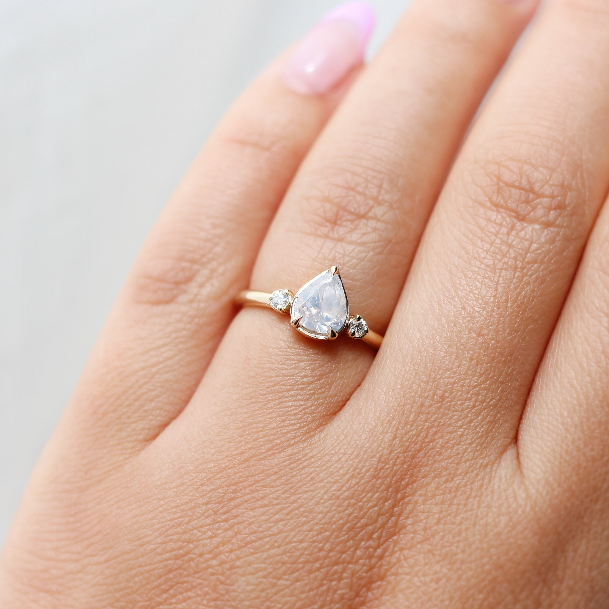 Introducing the striking Lagoon Icy Pear Diamond Ring, featuring a stunning one-of-a-kind pear diamond with a glistening light blue hue at its centre. The elegant three stone setting rests beautifully on the finger for a comfortable and luxurious fit. Best of all, the low profile design allows for effortless stacking with curved or pointed contour bands.