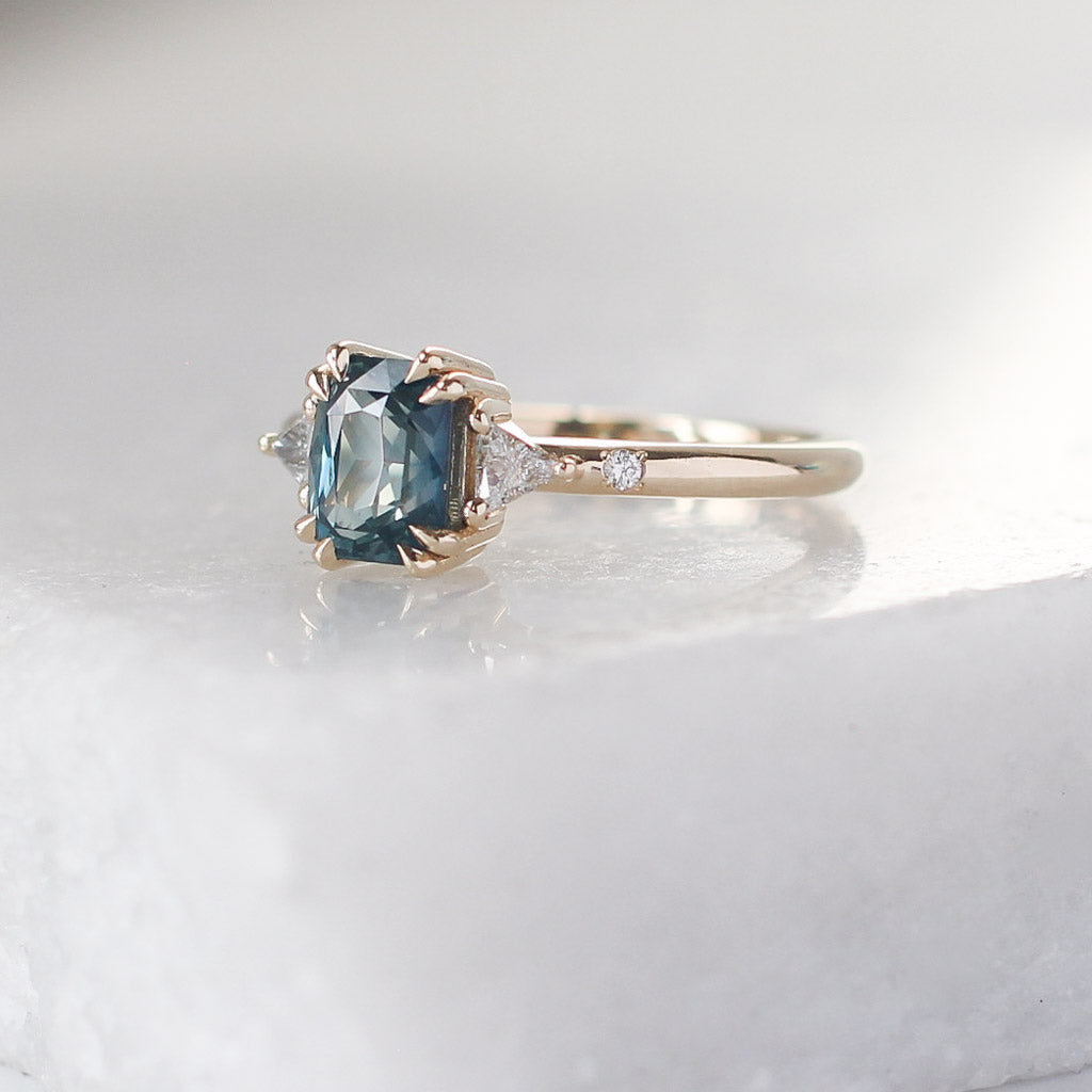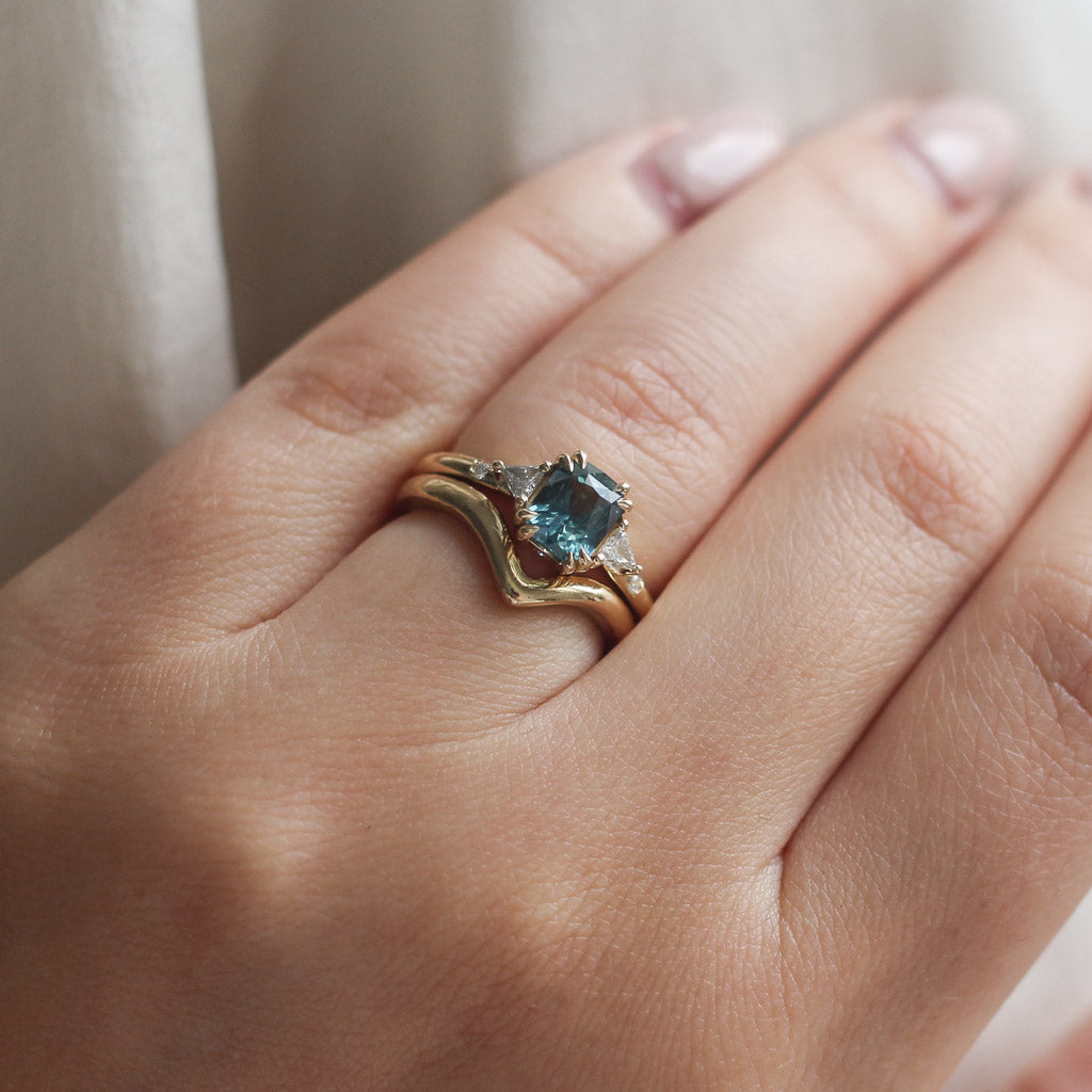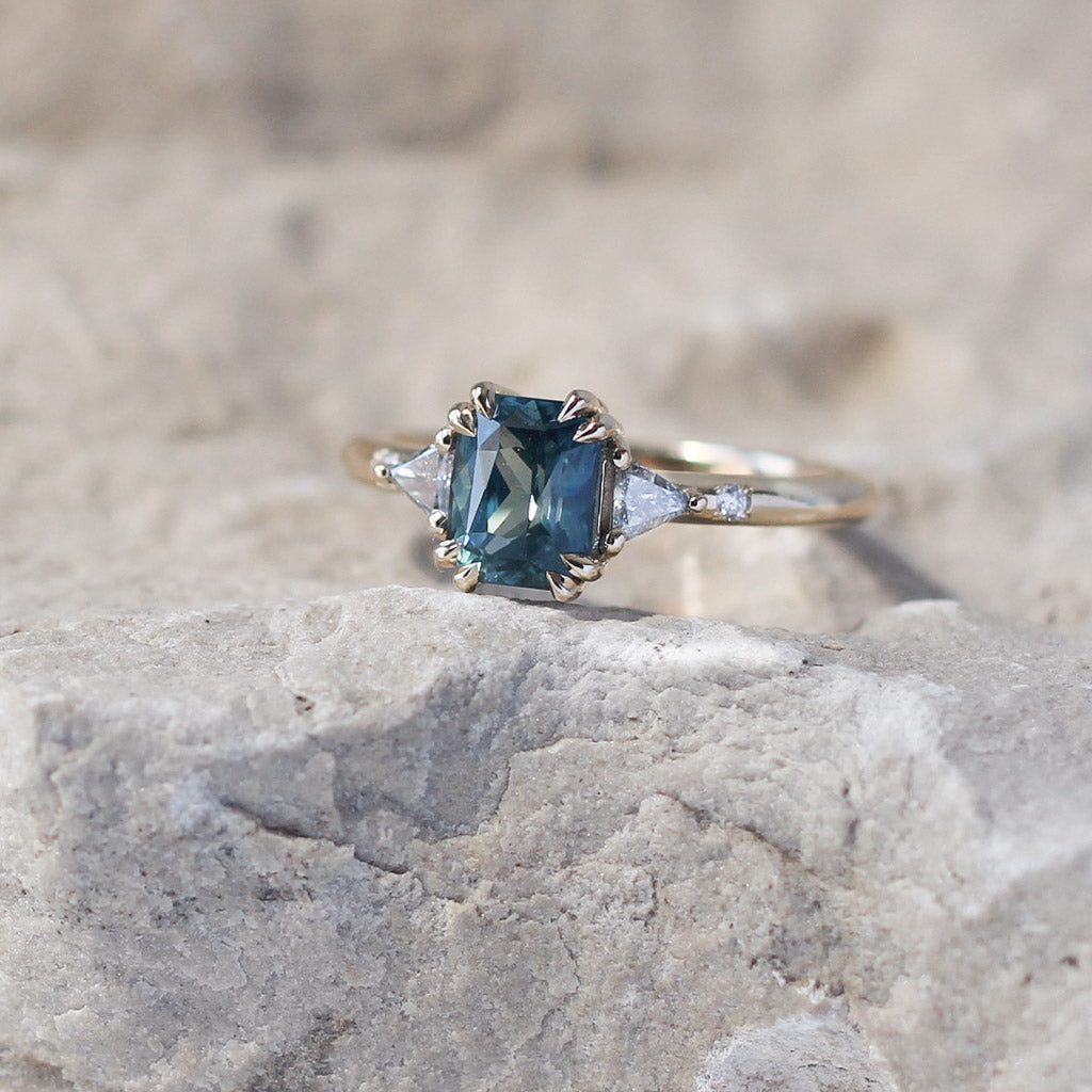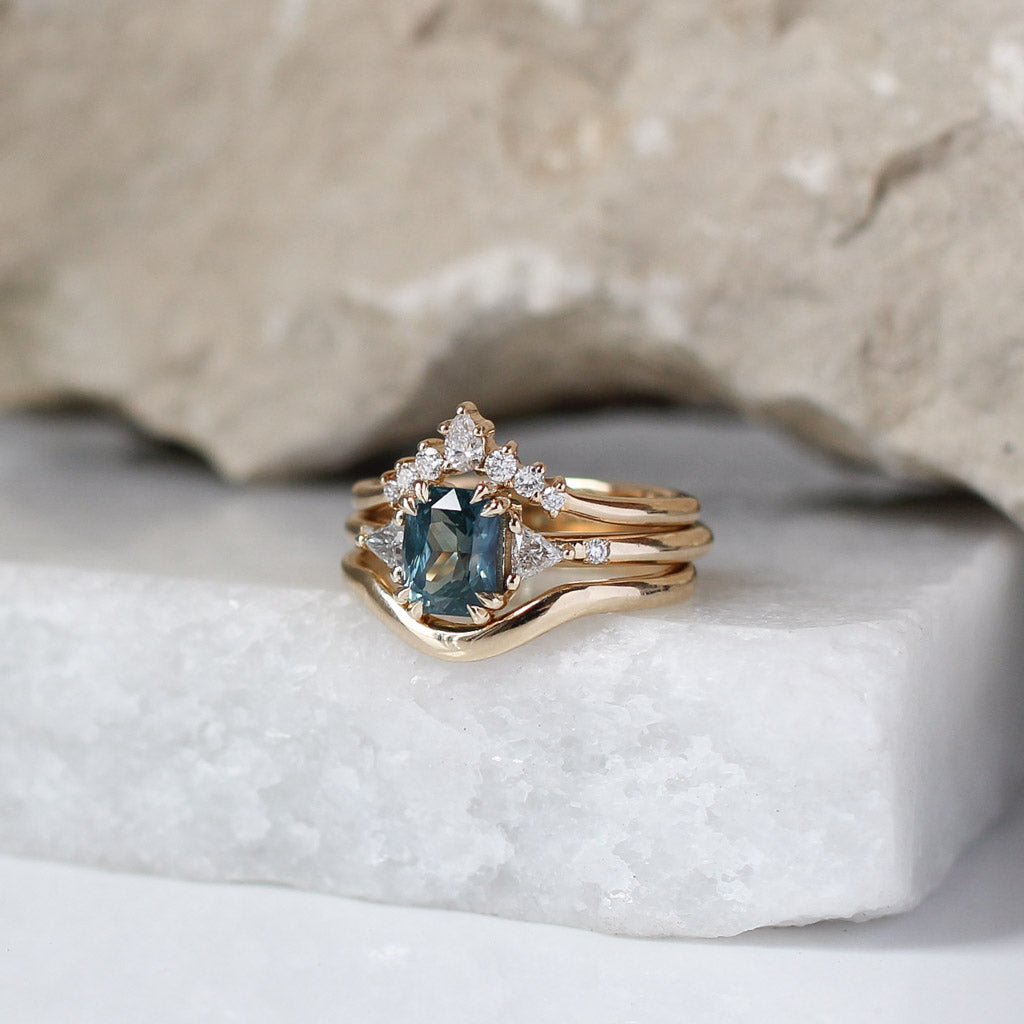 Our Lily ring featuring radiant cut Montana teal sapphire and trillion diamond shoulders. With small diamond accents on the band and under gallery for extra sparkle. We love radiant cut stones for their brilliance and unique reflection of light. Stack best with contour bands. Pictured with our Pear Sahara, Sahara Band, Point Band and Wave Band, sold separately.
