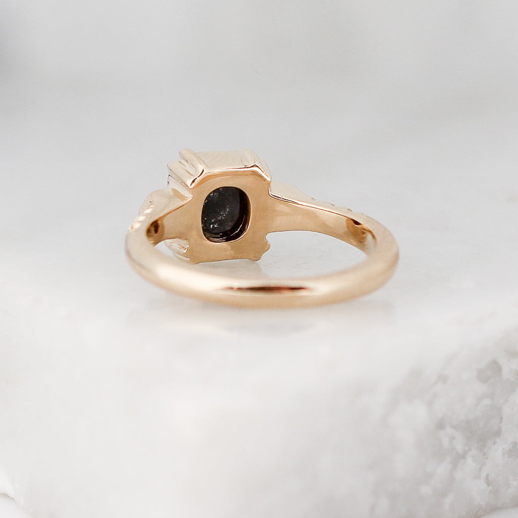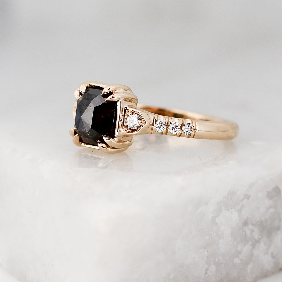 - 2.42ct cut corner rectangular rose cut black diamond set is double prong setting