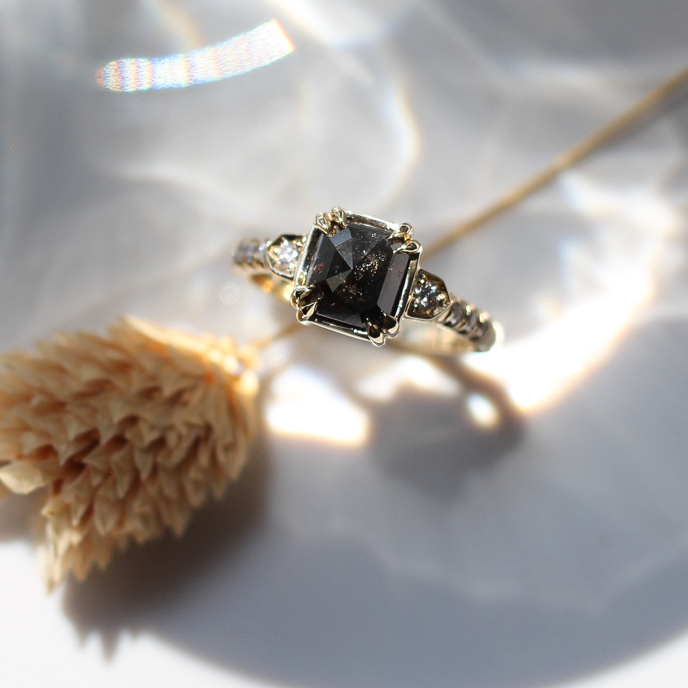 Nebula black diamond ring is a modern dark beauty for those who are looking for a statement. Featuring luscious rose cut black diamond with flashes of lighter areas that remind us of clusters of new born stars in the deep space. Accented by Canadian diamonds in our hand-carved design.