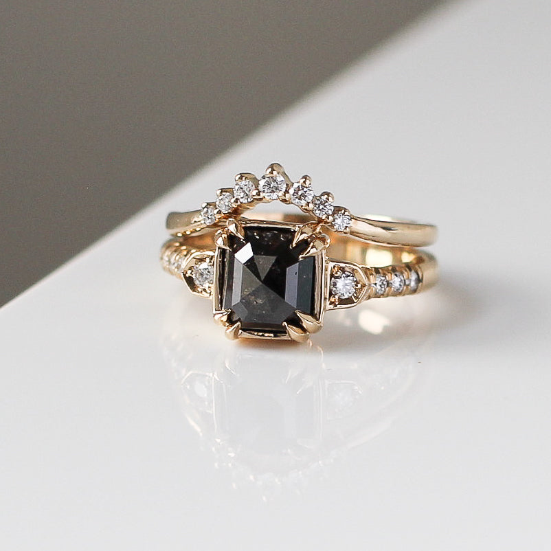 Centre setting is raised making it easy to stack with straight or curved bands. Pictured with our Pear Sahara Diamond Band and Sahara Diamond Band.