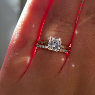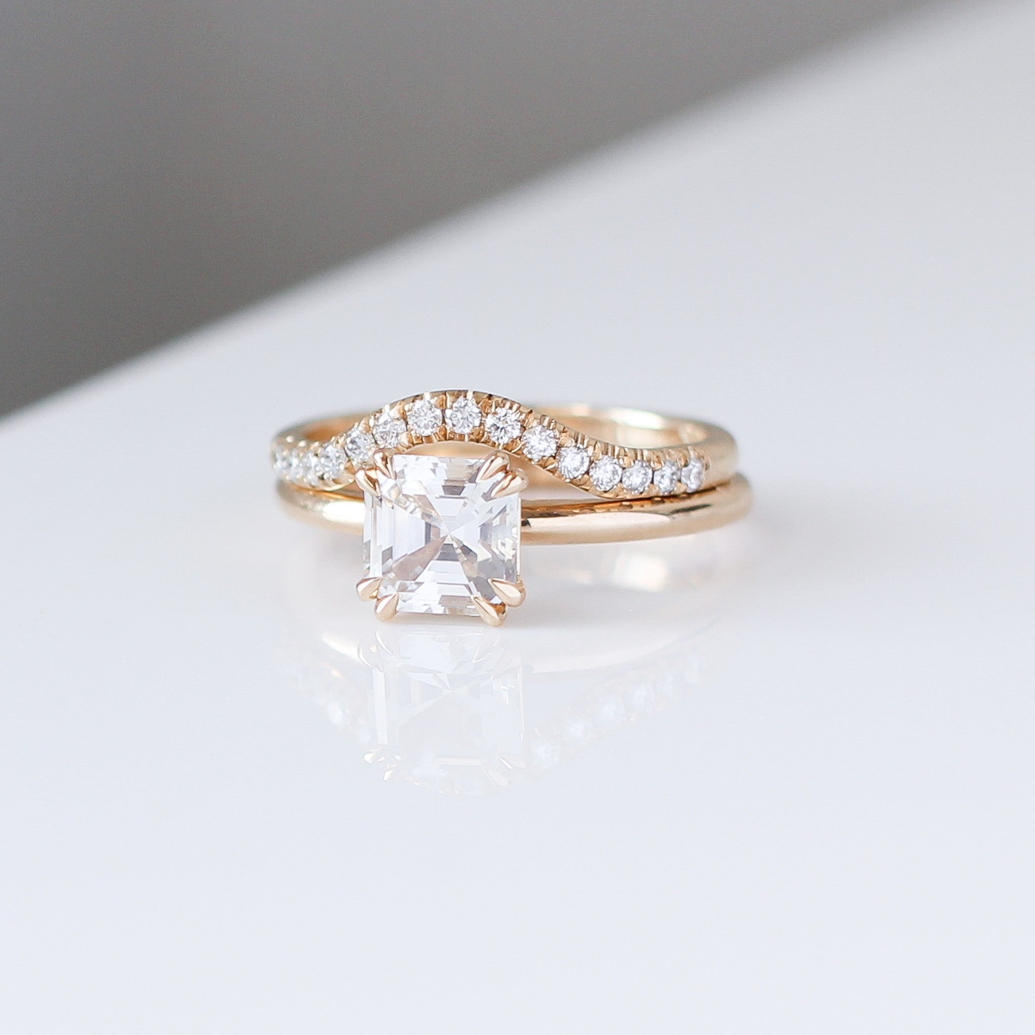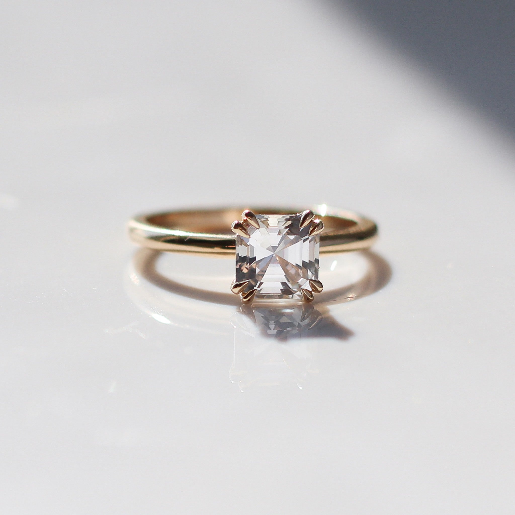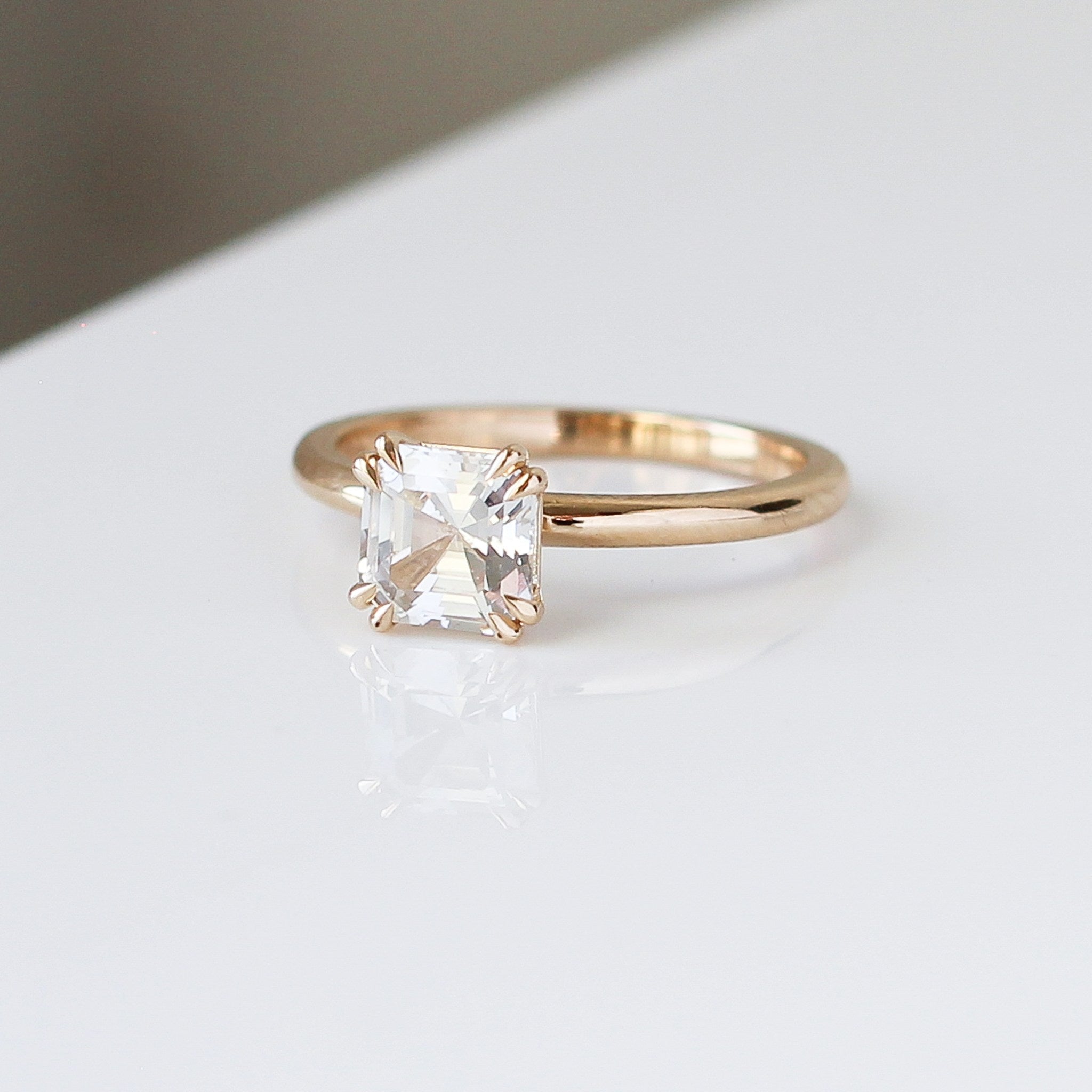 A classic solitaire engagement ring boasting a natural asscher cut white sapphire. Adorned with a double prong setting and a raised profile to enhance the luminosity and radiance. The elevated main setting allows for seamless stacking with either straight or curved bands.