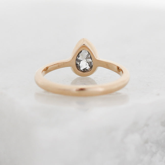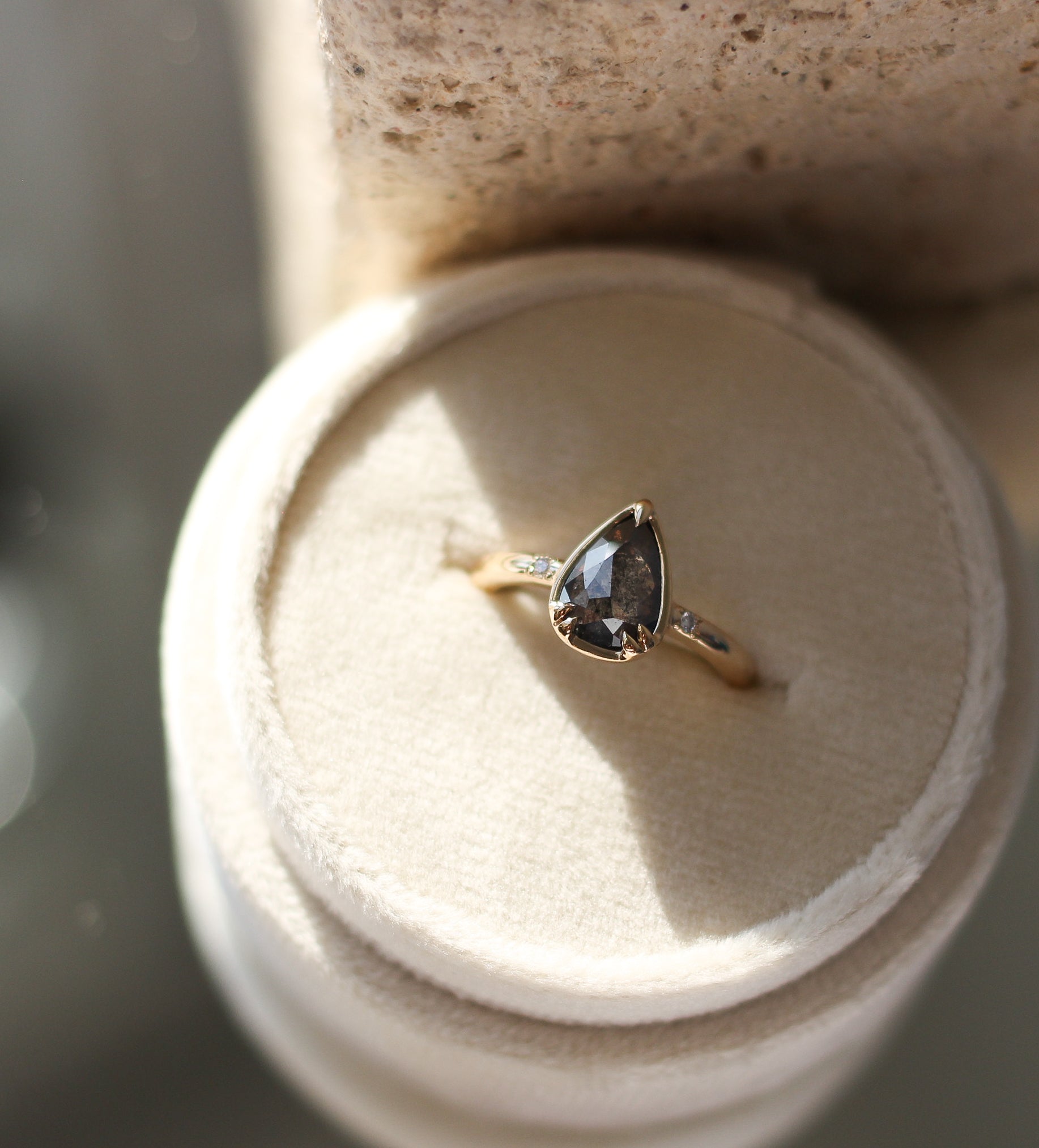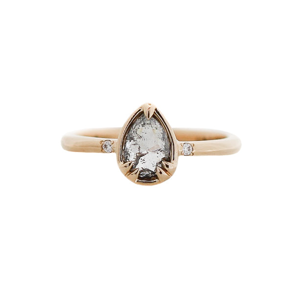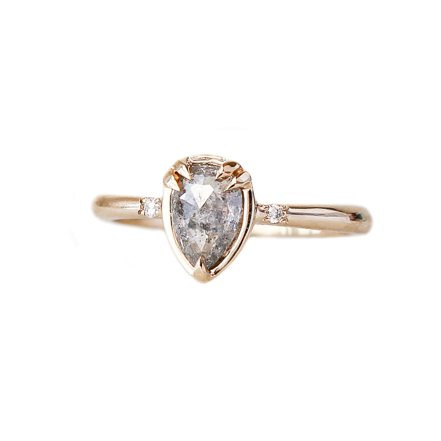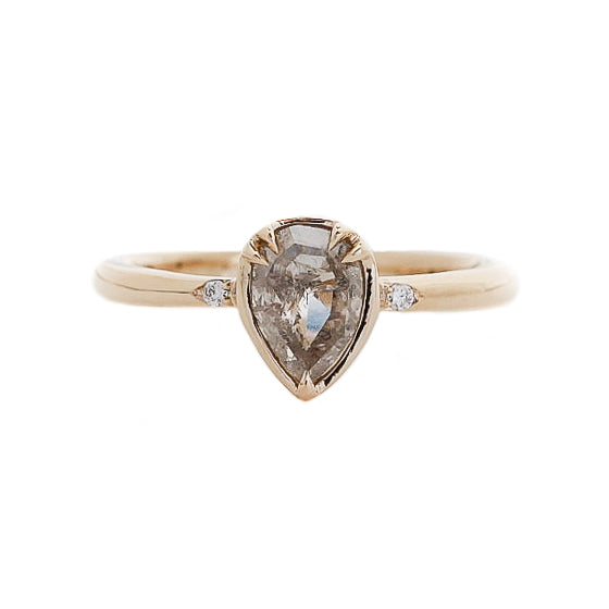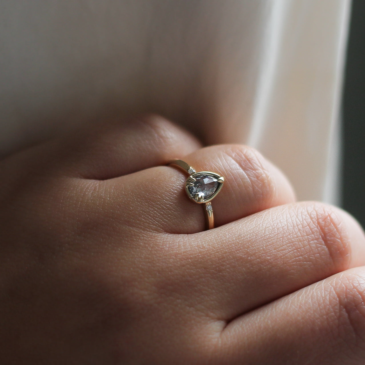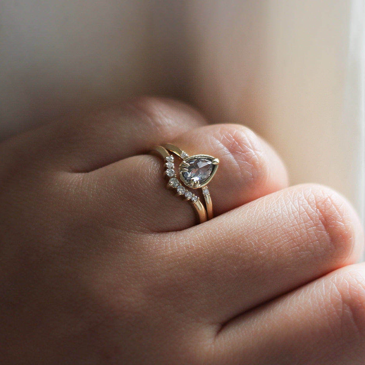 Inspired by the morning and evening stars guarding the sky. Zaria Ring features a pear diamond of your choice. Set in 5-prong imbedded setting with low profile for ultra comfortable everyday wear. Accented by small diamonds tucked into the band. Stacks best with curved or pointed bands.