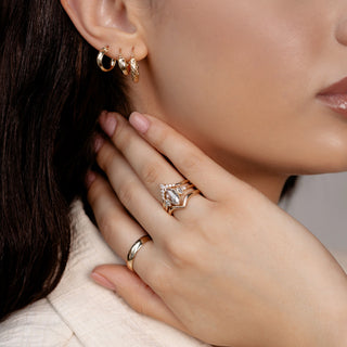 Bride wearing a diamond engagement ring in a gold signature ring setting with a curved golden wedding band handcrafted in Toronto.