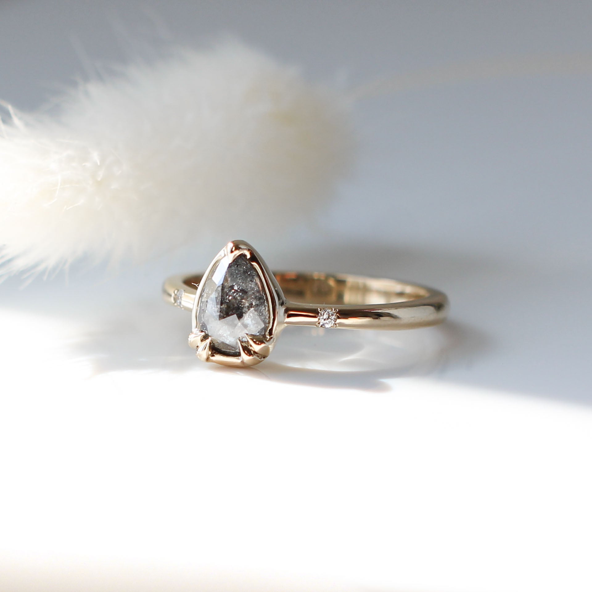Experience the captivating beauty of the Zaria Pear Salt & Pepper Diamond Ring. Our hand-carved low profile setting showcases a natural pear shaped salt & pepper rose cut diamond, each one uniquely dark and alluring. Sparkling Canadian diamonds are nestled into the band, like shimmering stars in the night sky. With a sturdy 5-claw embedded centre setting, this ring is a symbol of timeless strength and durability.