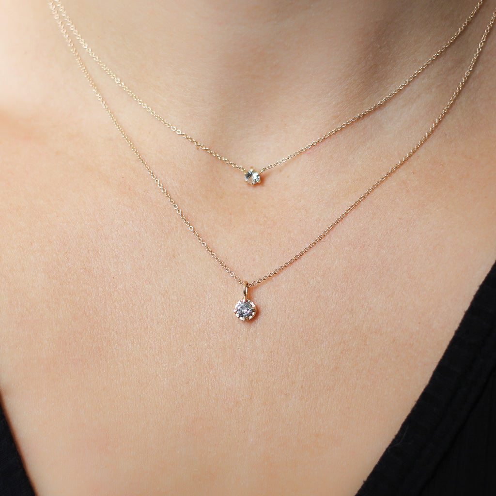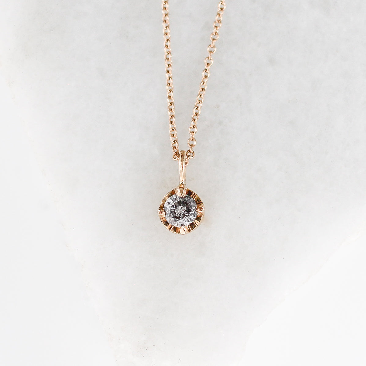 Round salt & pepper diamond necklace with our hand carved Sun texture in solid yellow gold. Perfect way to dress up your neck, great for layering with other chains or on its own. Sits just below your collar bones.