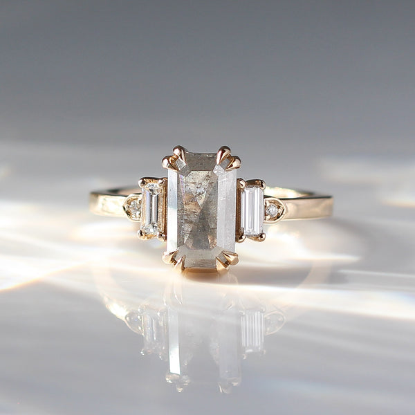 Radiant Cut Lab Diamond Ring on fabric quarter view