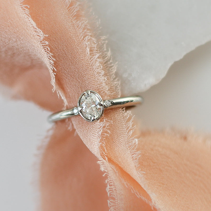 Around The World ring style is inspired by adventure of travel and excitement of taking on unfamiliar paths. Centre setting features an oval cut stone of your choice. With compass 4-prong setting and open gallery underneath to maximize the sparkle. The shoulders of the band have two small diamond accents. Raised setting stacks with straight or curved bands.