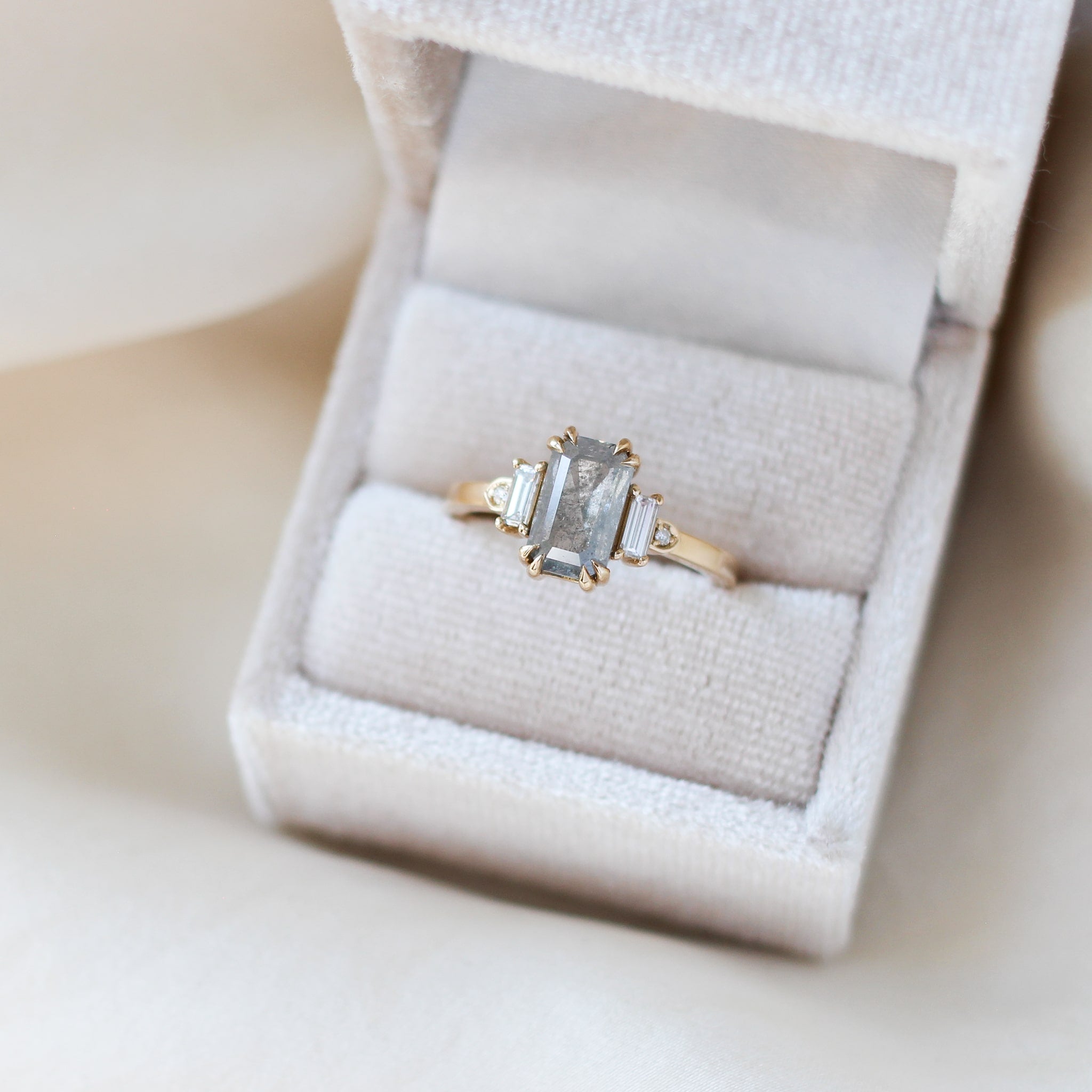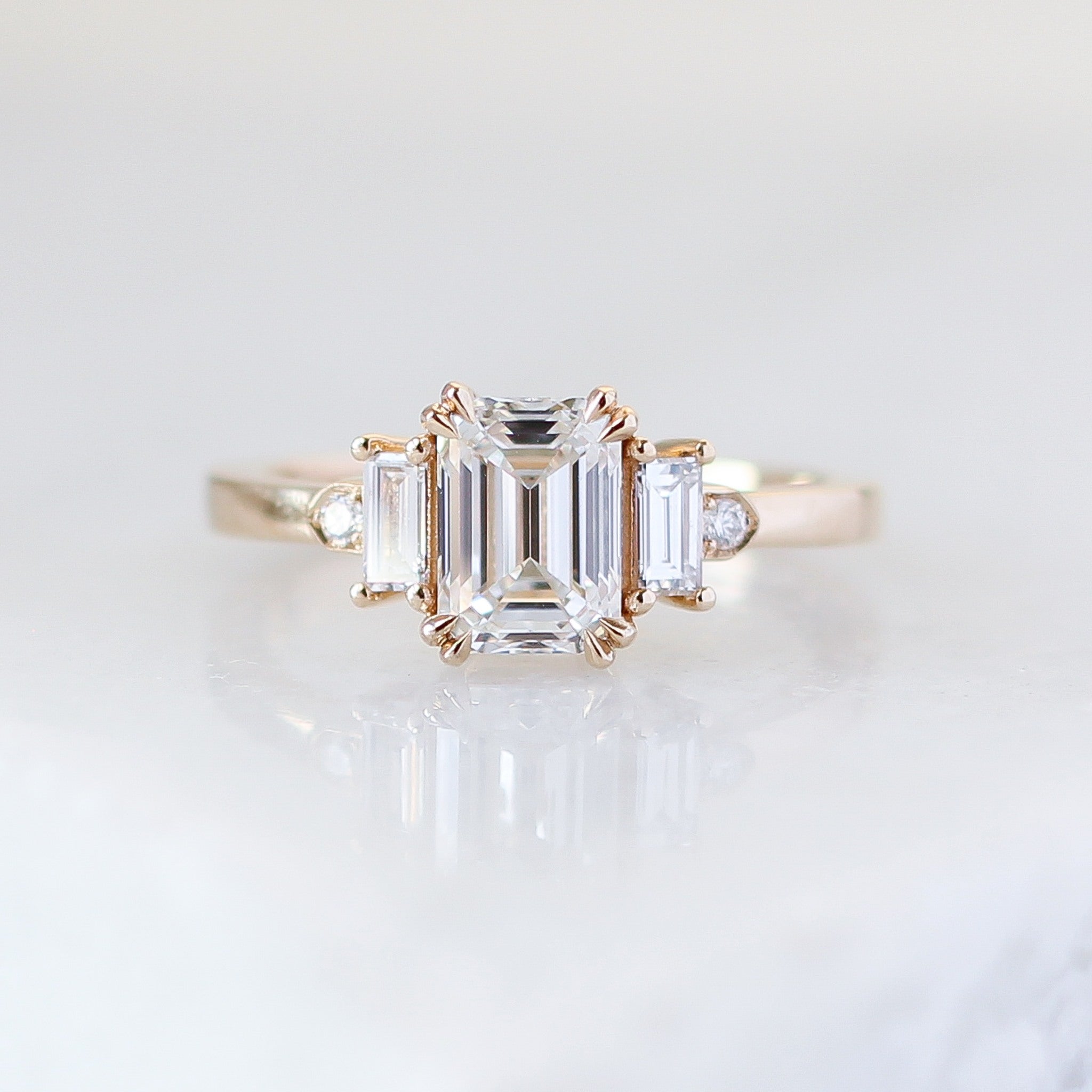 Our take on an Art Deco style with a twist. Misceo features an emerald cut or a rectangular shaped centre gemstone, set with double prongs at the corners. Paired with clear baguette and round brilliant cut diamonds. Featuring our shield under gallery with hidden diamond accents. Made with low profile and stacks best with curved bands.