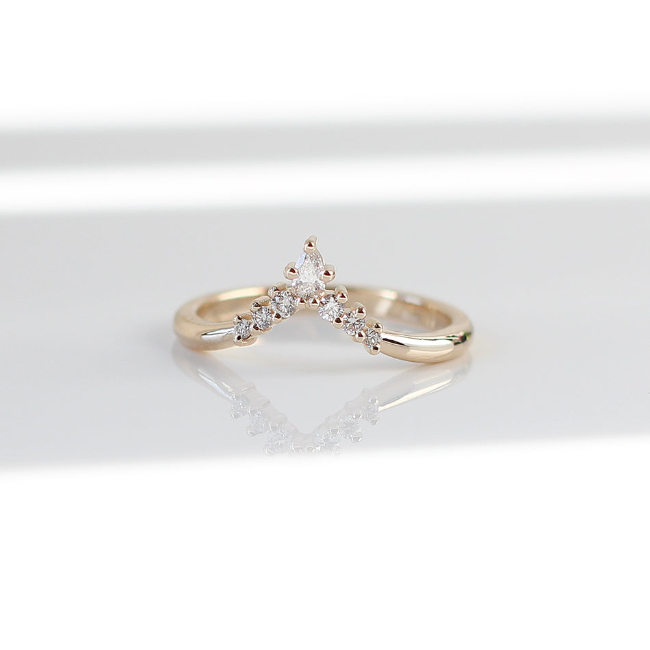 Serina diamond crown style band with pointed curve. Snugs best with marquise, pear, or oval shaped engagement rings but is versatile with most shapes. Wear it with a medium sized setting or rock it solo as a statement piece.