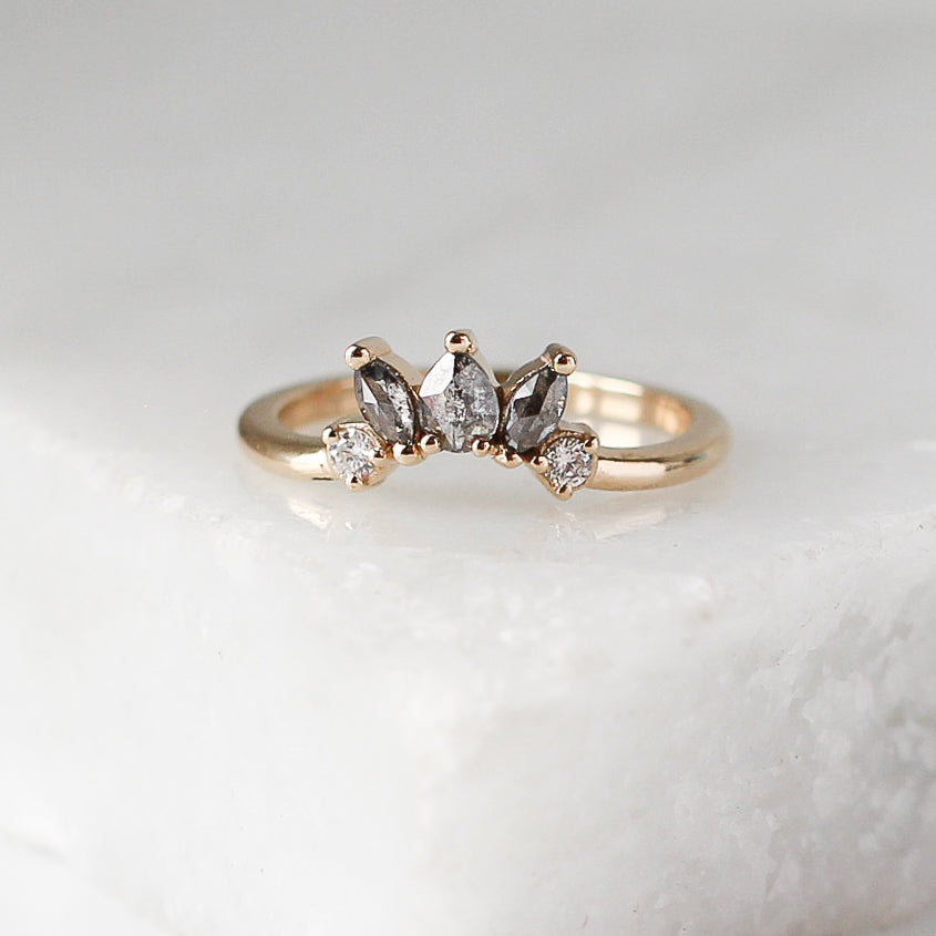 Salt and pepper diamond crown band of our dreams. The delicate yet striking contour band that resembles the sun just peaking over the horizon of an early morning. Stacks great with medium sized round, oval or pear shaped rings.