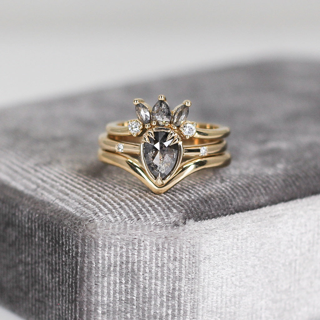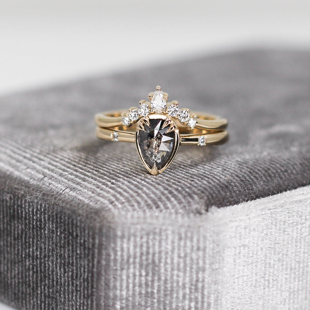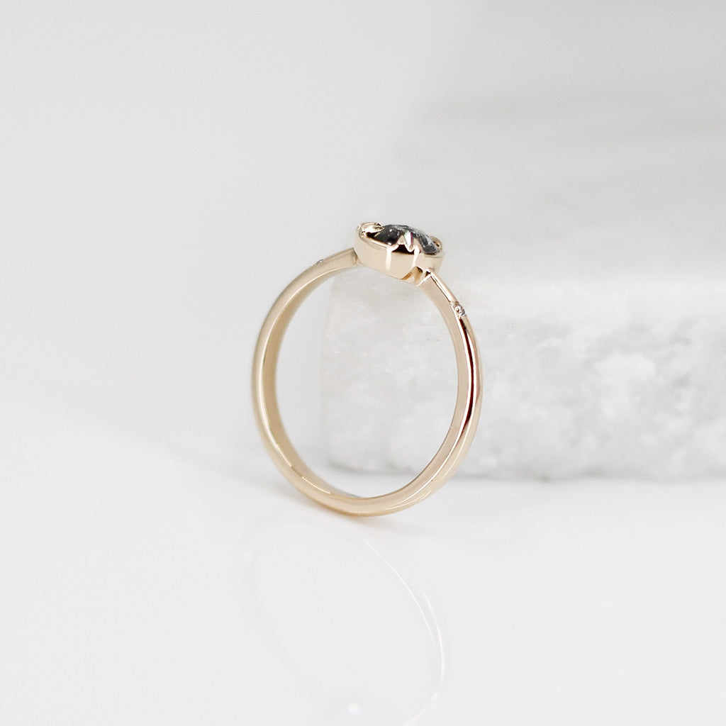 Zaria Pear Diamond Ring is featuring natural pear shaped salt & pepper rose cut diamond in our hand-carved  low profile setting. Centre diamond has a bright translucent body with dark inclusions and is accented by white Canadian diamonds tucked into the band. Like the morning and evening stars guarding the sky. With a combination of our 5-claw embedded center setting for durability.