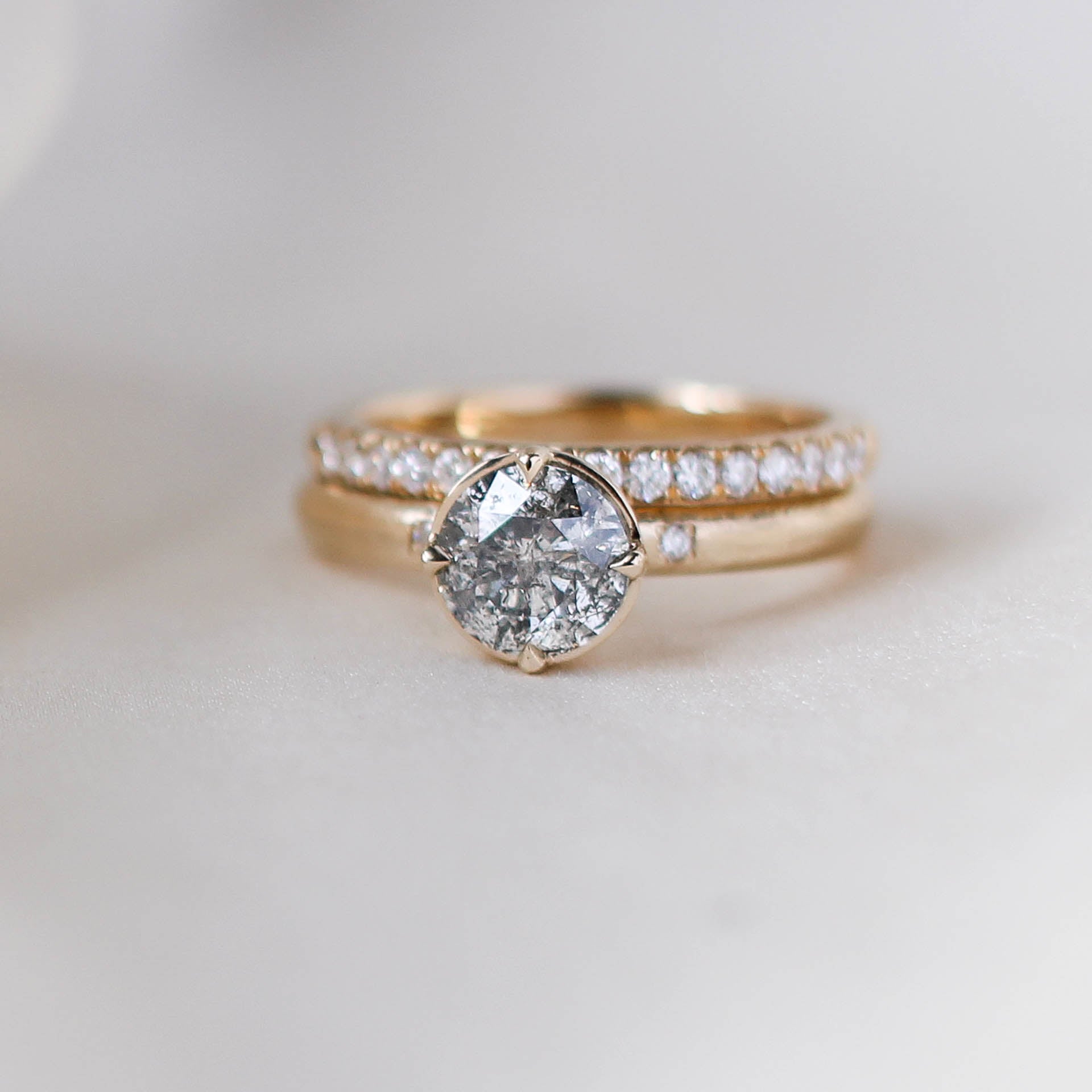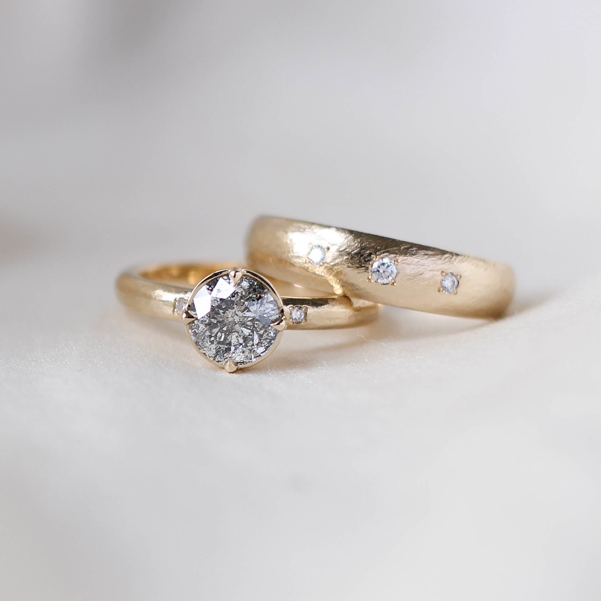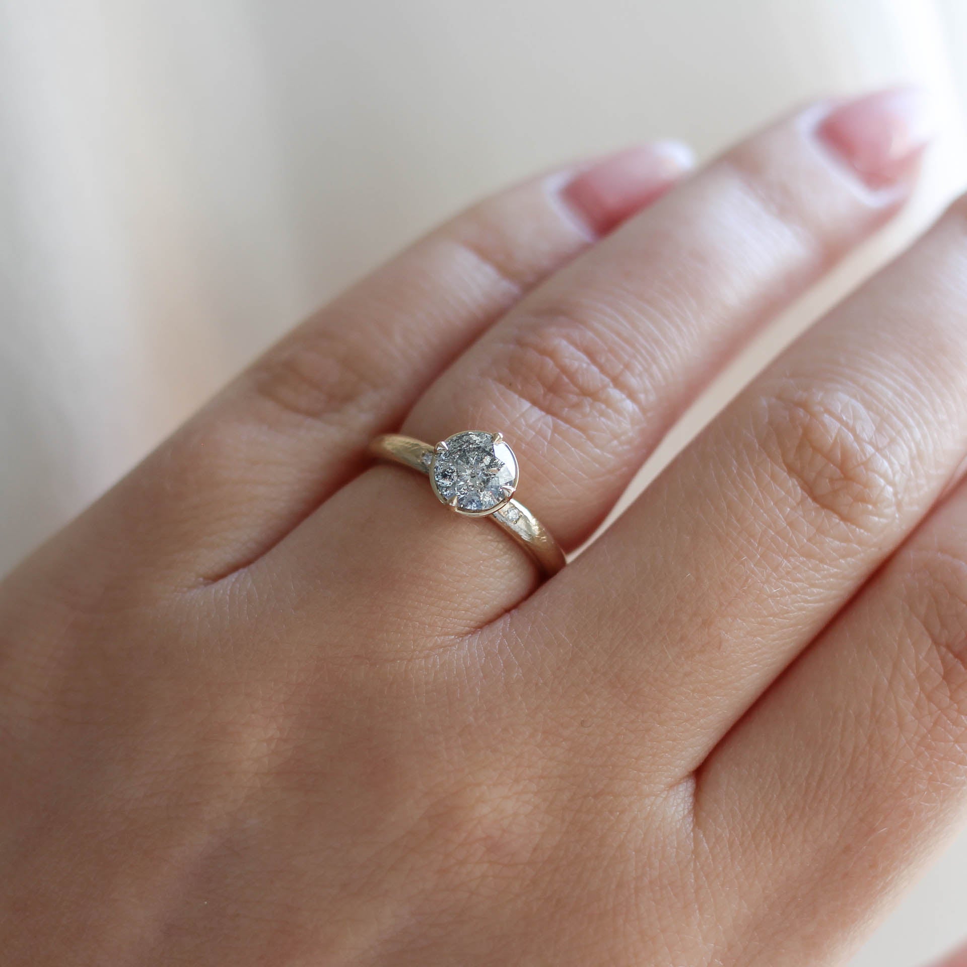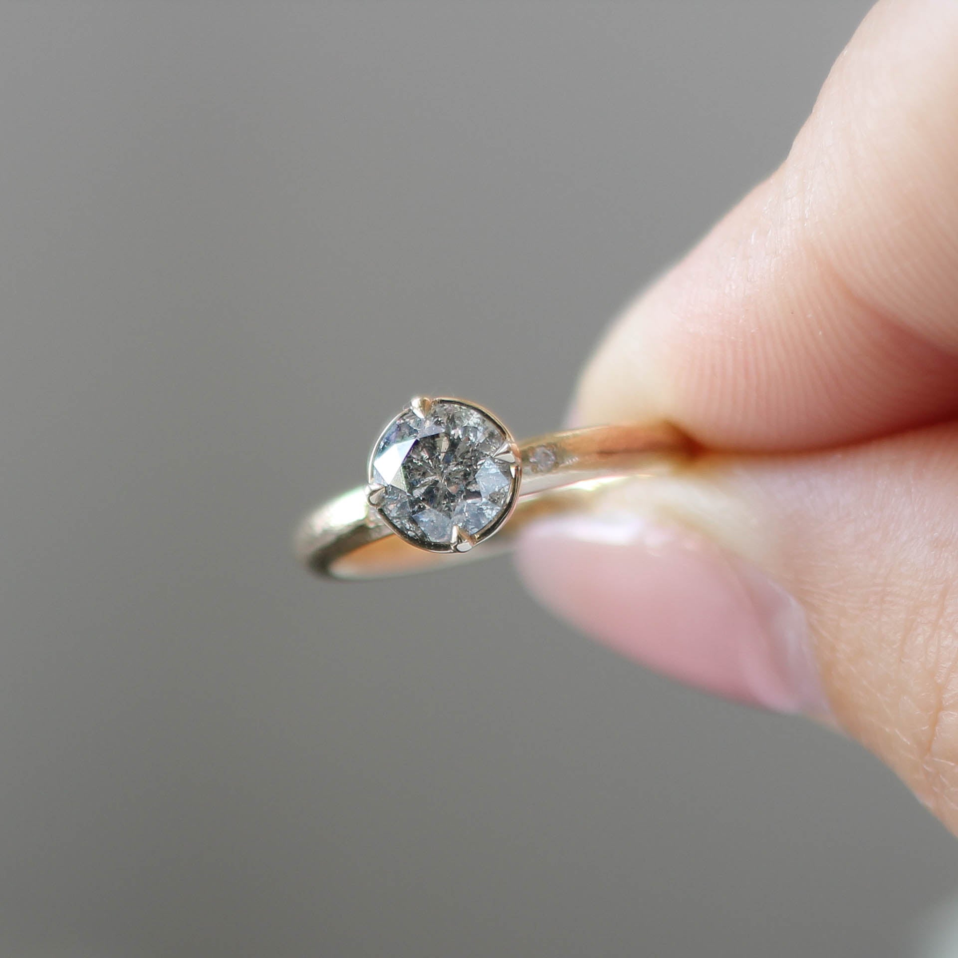 Indulge in the adventure and travel vibes with our Around The World Round Salt & Pepper Diamond Ring. Designed with a stunning natural round salt & pepper diamond center, set in our unique 4-prong compass setting. Carefully chosen for its unparalleled quality and sparkle. The hand-carved band features a delicate texture and two small diamond accents, perfect for stacking with flush or curved bands.