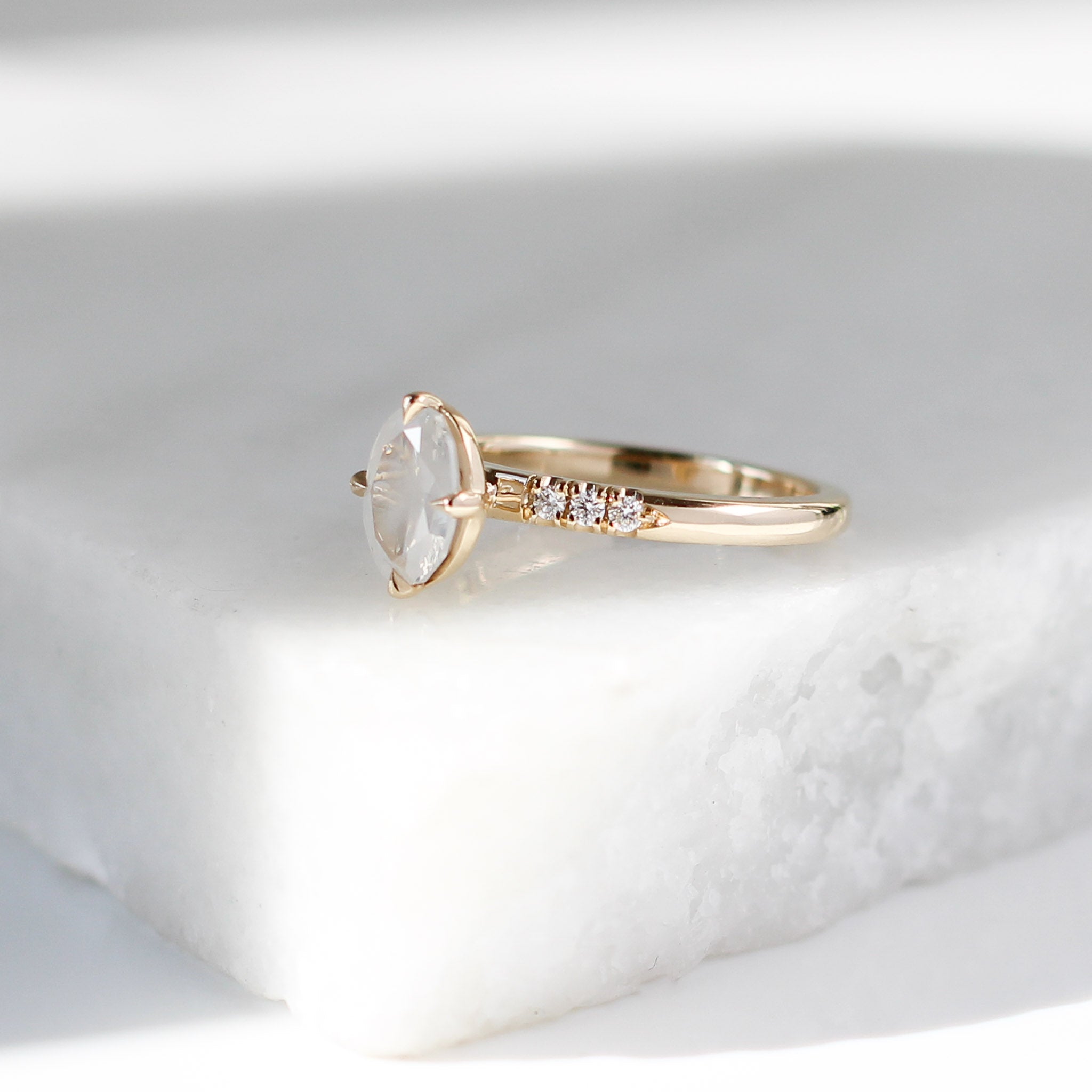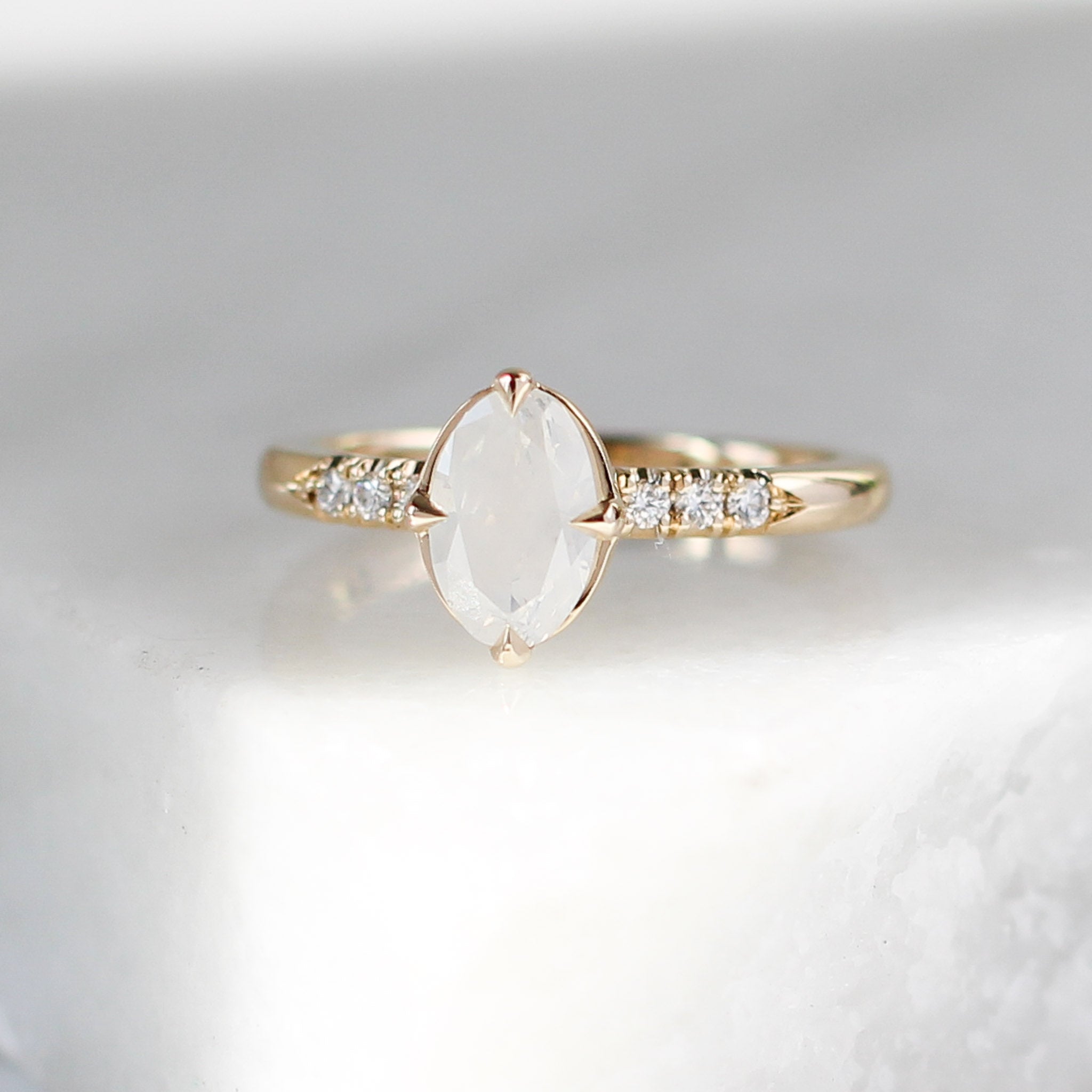 This Around The World setting features an elongated oval shaped fancy white diamond centre. Complimented with colourless brilliant cut pave set Canadian diamonds. Fancy white diamonds are rare as their colour is due to presence of nano-incllusions and are distinctively different from classic colourless diamonds. Making this classic and elegant ring completely one-of-a-kind.