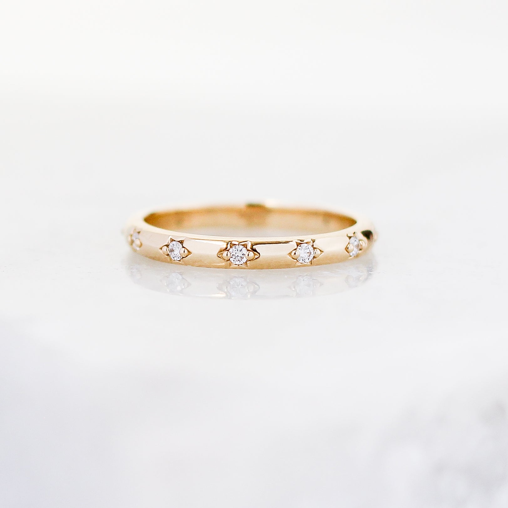 - 0.14ctw of 1.5mm round brilliant lab created white diamonds, star set into the band