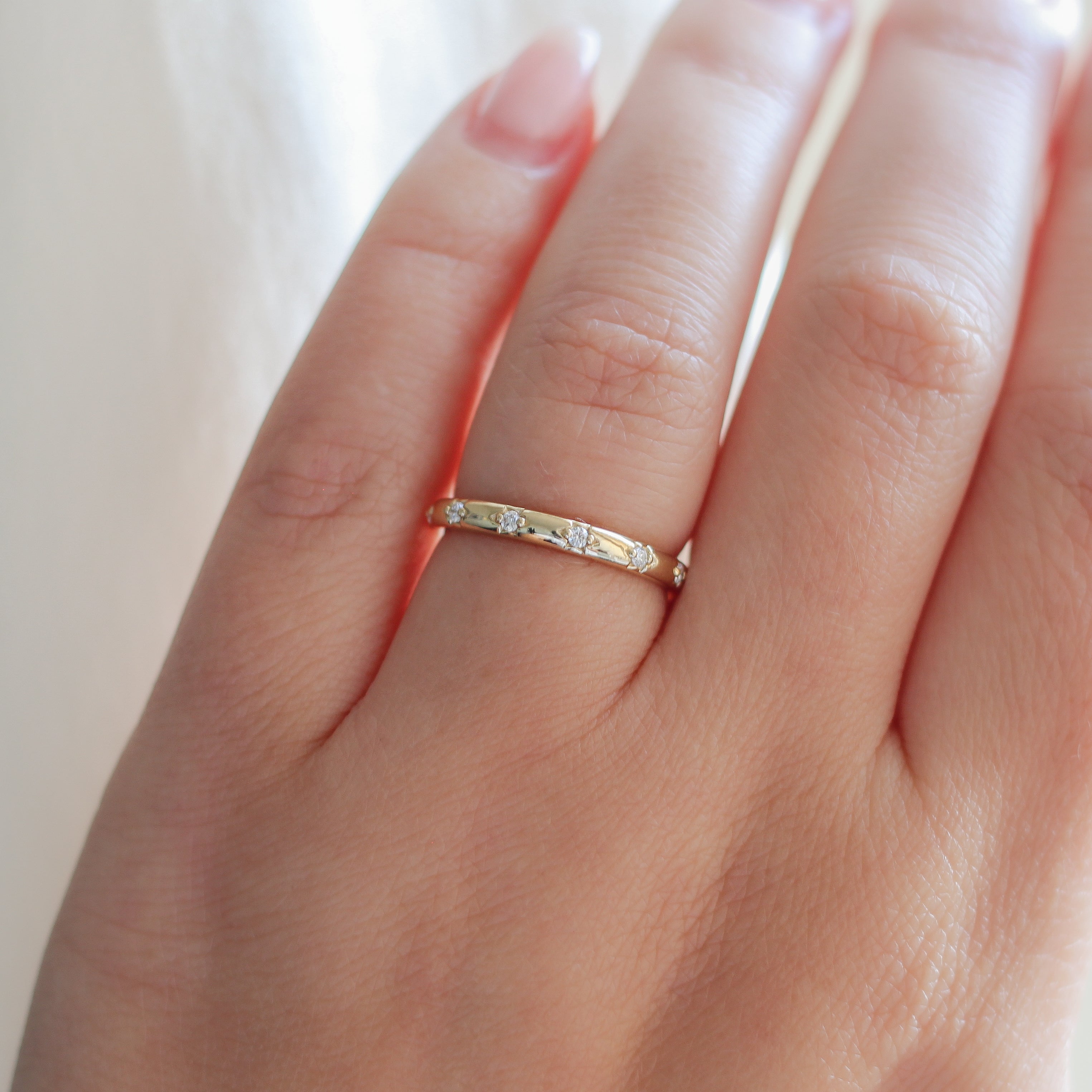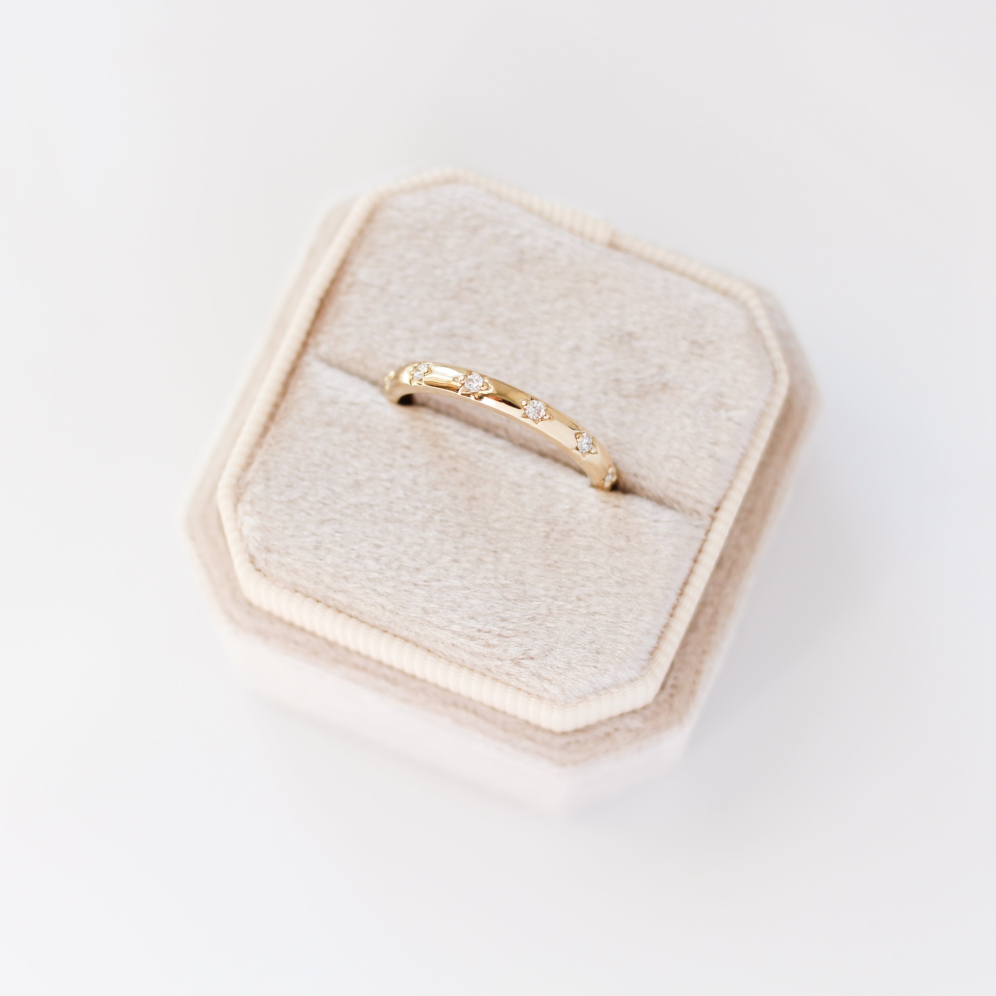Our Celestial Diamond band features a constellation of round brilliant lab created diamonds, each delicately framed by hand-engraved star details. Inspired by the night sky, the celestial settings catch the light with a subtle, scattered sparkle while maintaining a timeless and wearable silhouette. Designed for everyday comfort, this band is equally suited as a wedding ring or a meaningful piece to mark a moment in time.